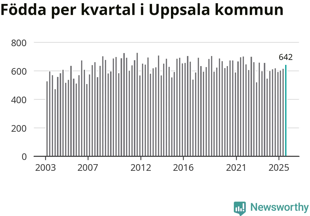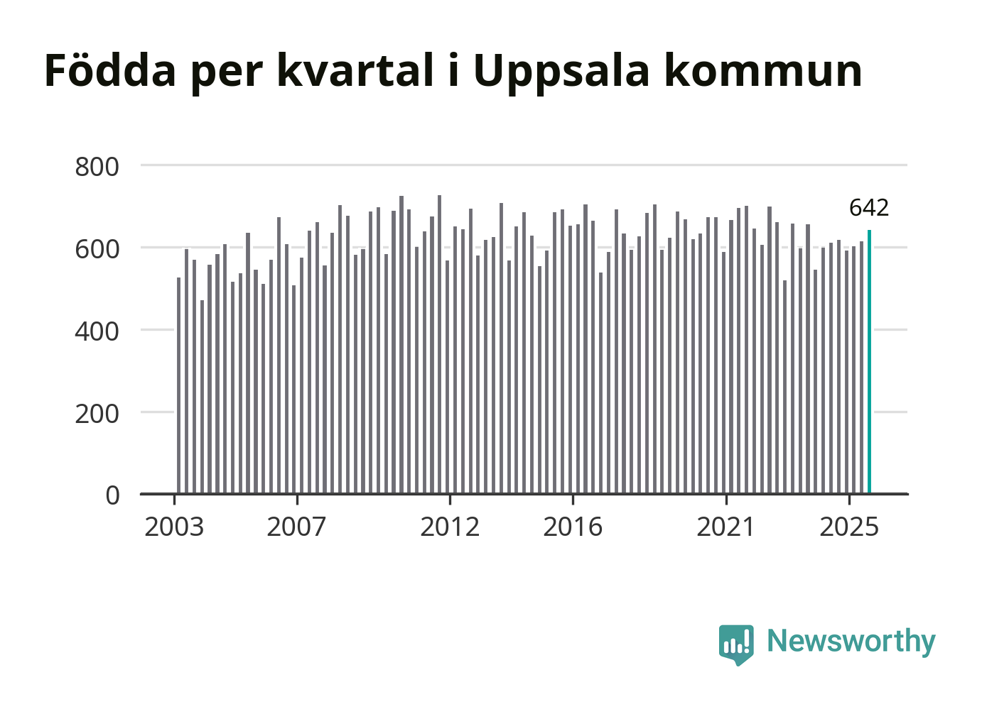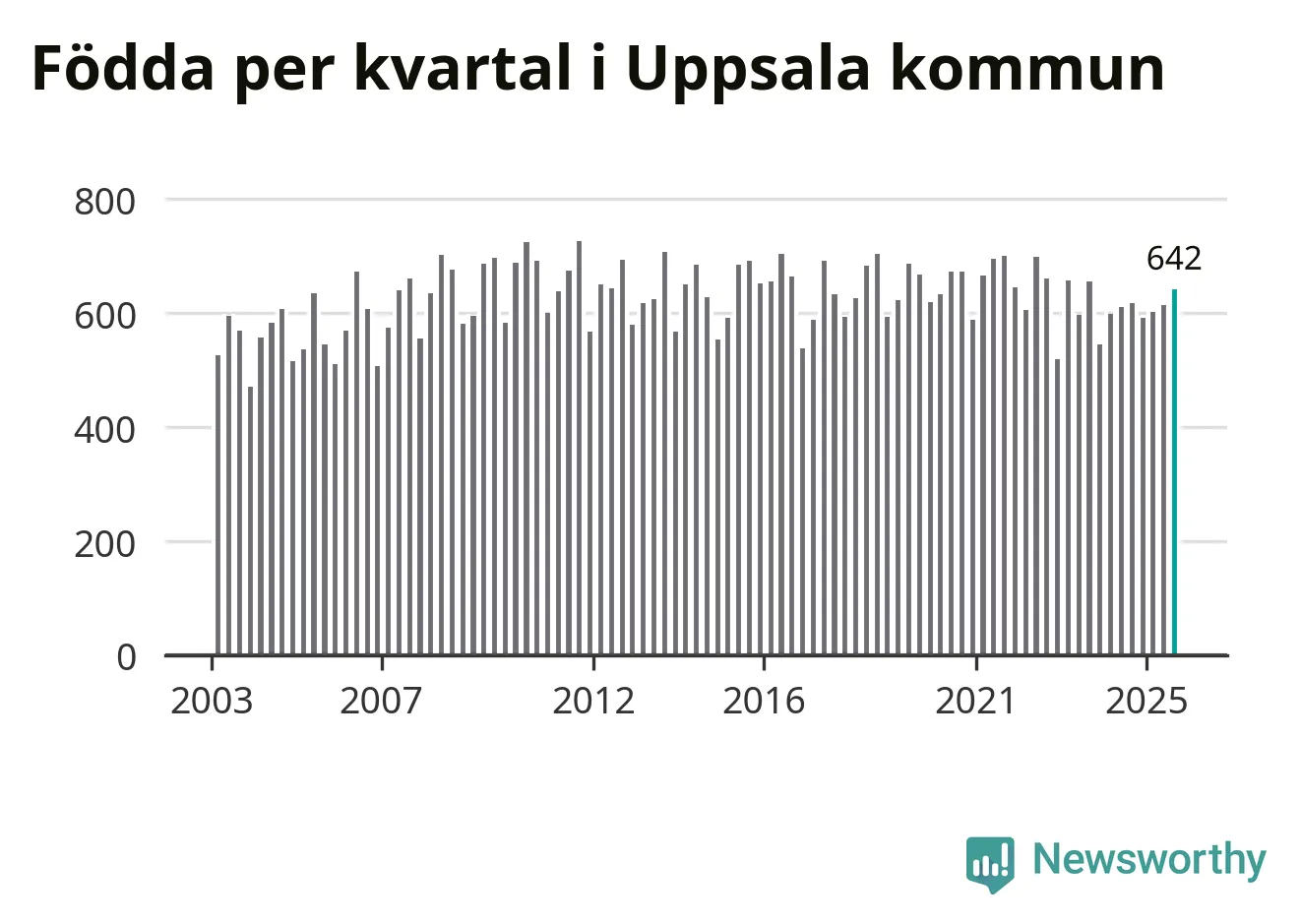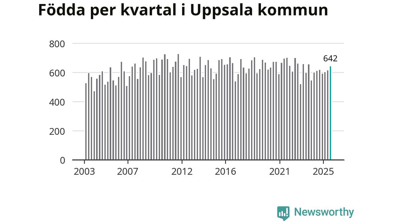 Enligt SCB:s siffror föddes 642 barn i Uppsala kommun under det senaste kvartalet. Samtidigt avled 362 personer. Uppsala hade alltså ett positivt födelsenetto, vilket kommunen historiskt sett i princip alltid har haft.