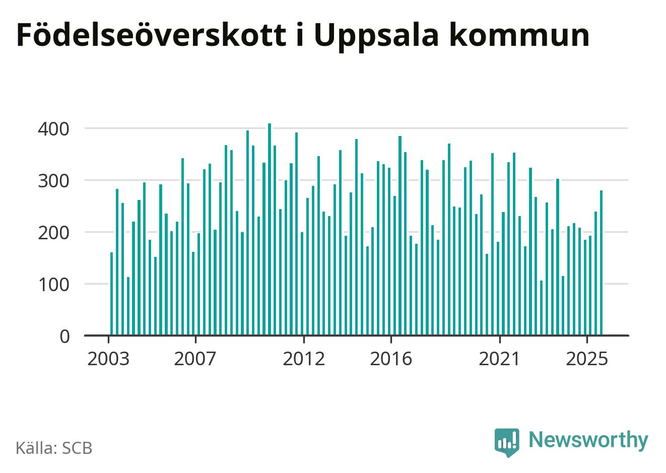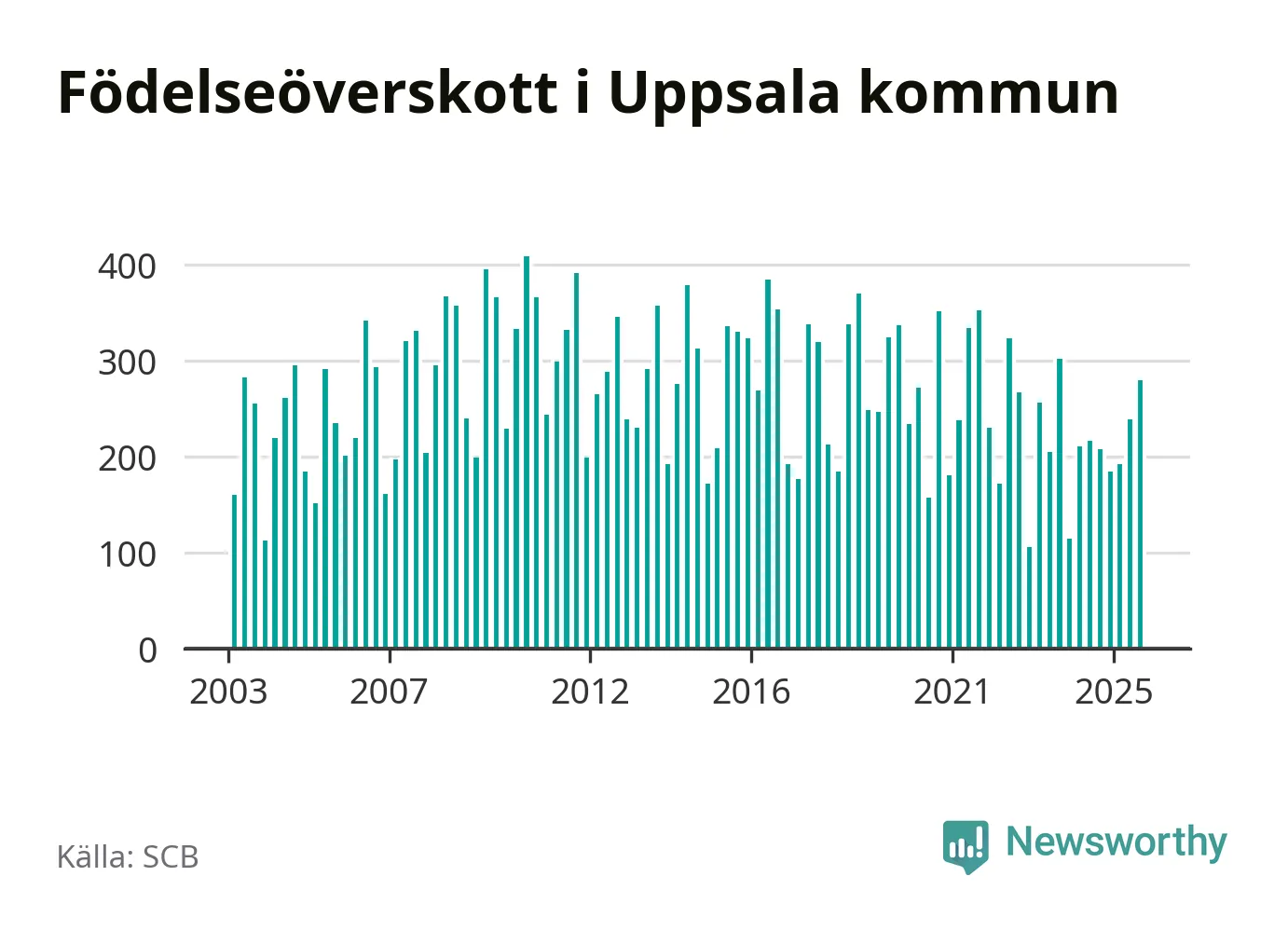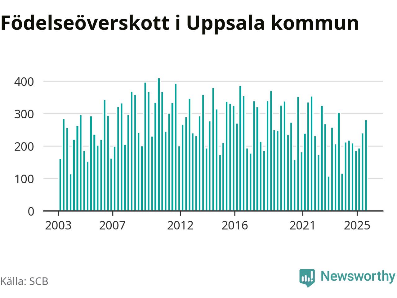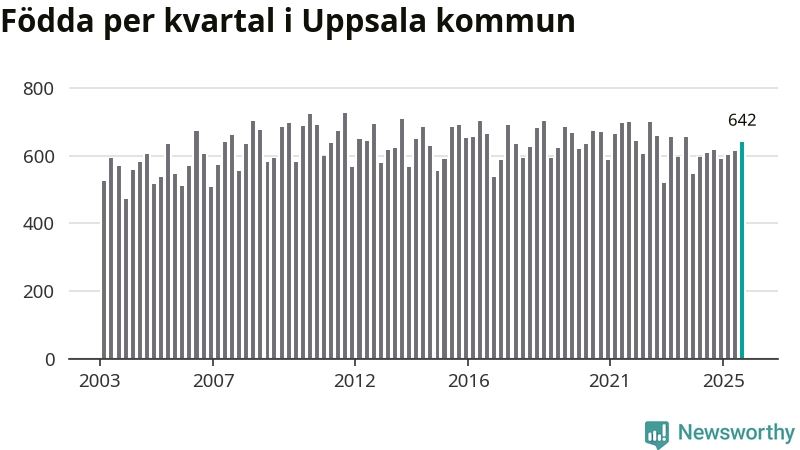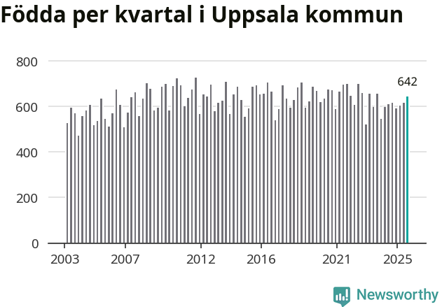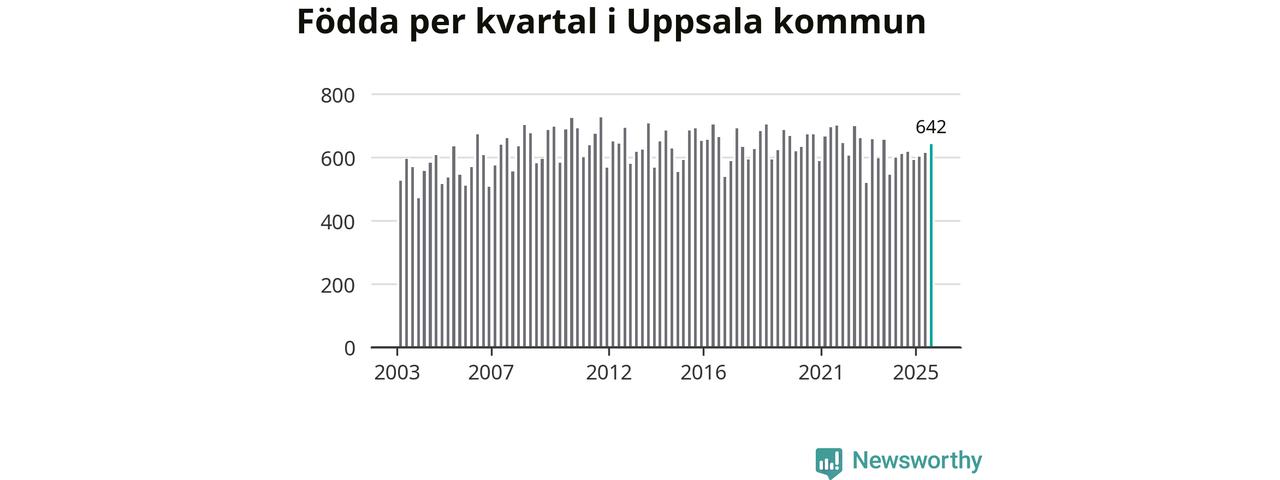 Enligt SCB:s siffror föddes 642 barn i Uppsala kommun under det senaste kvartalet. Samtidigt avled 362 personer. Uppsala hade alltså ett positivt födelsenetto, vilket kommunen historiskt sett i princip alltid har haft.