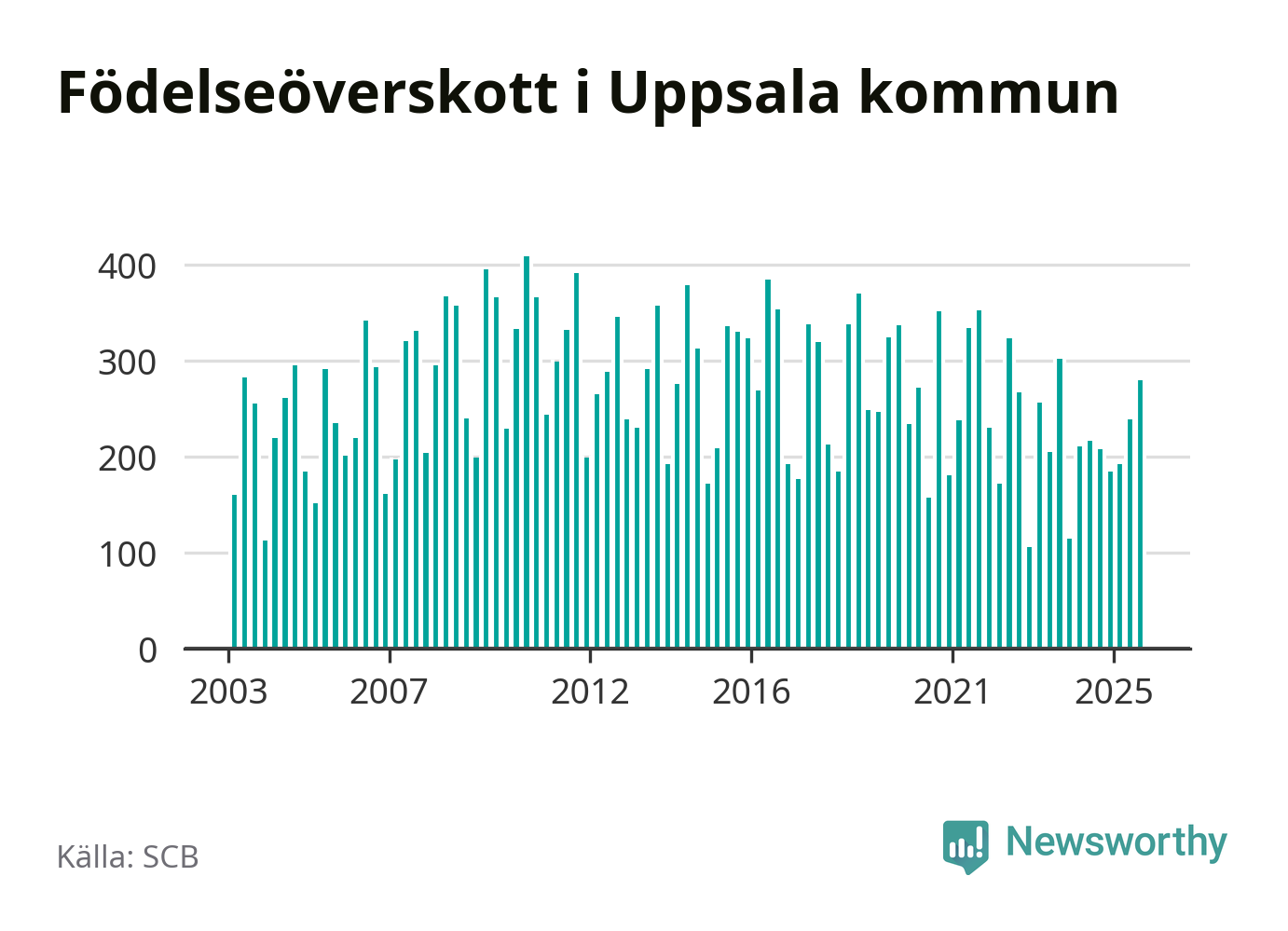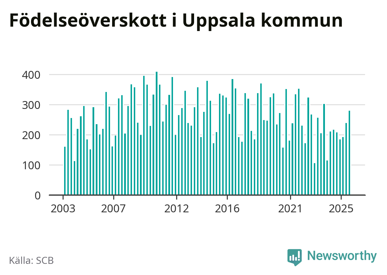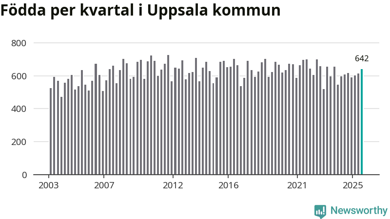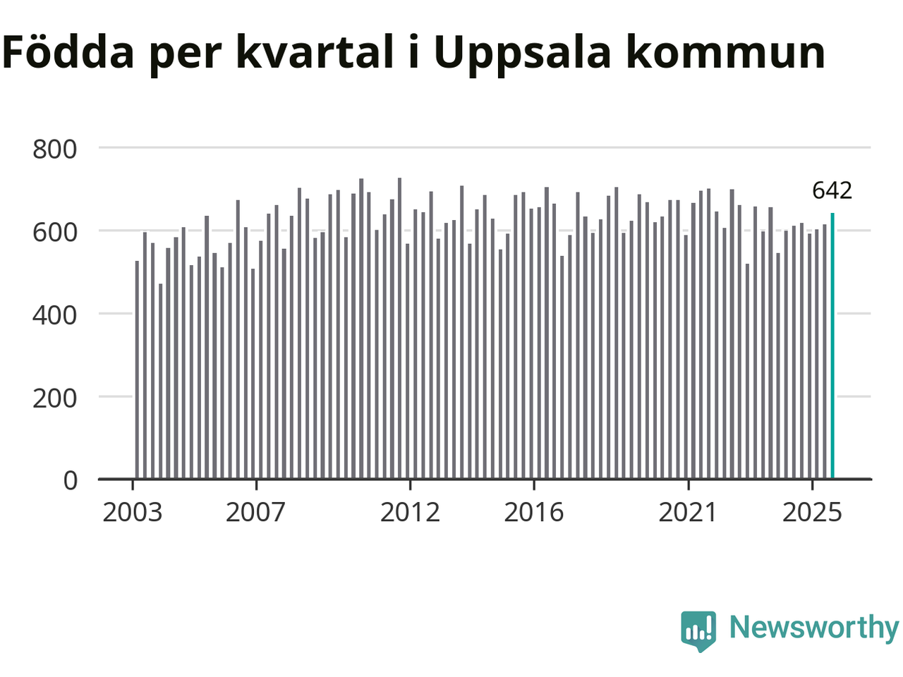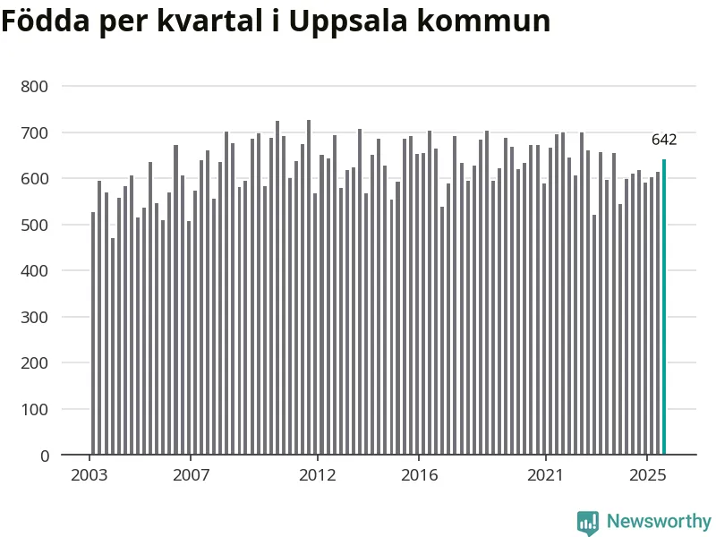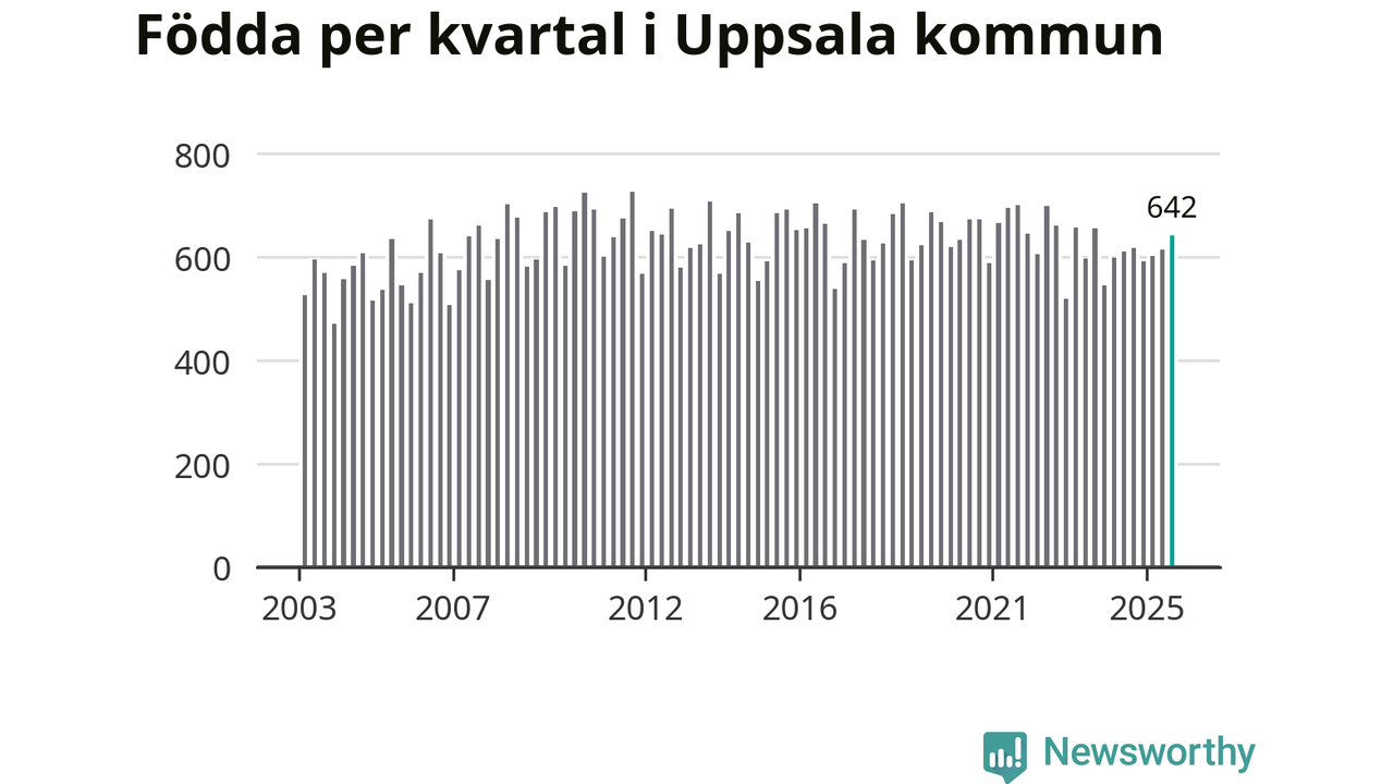 Enligt SCB:s siffror föddes 642 barn i Uppsala kommun under det senaste kvartalet. Samtidigt avled 362 personer. Uppsala hade alltså ett positivt födelsenetto, vilket kommunen historiskt sett i princip alltid har haft.
