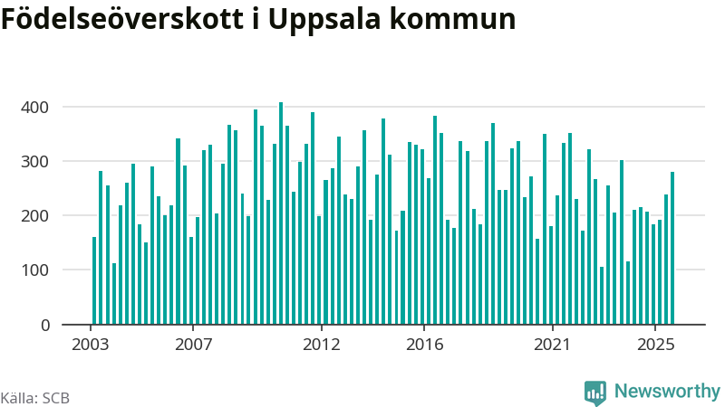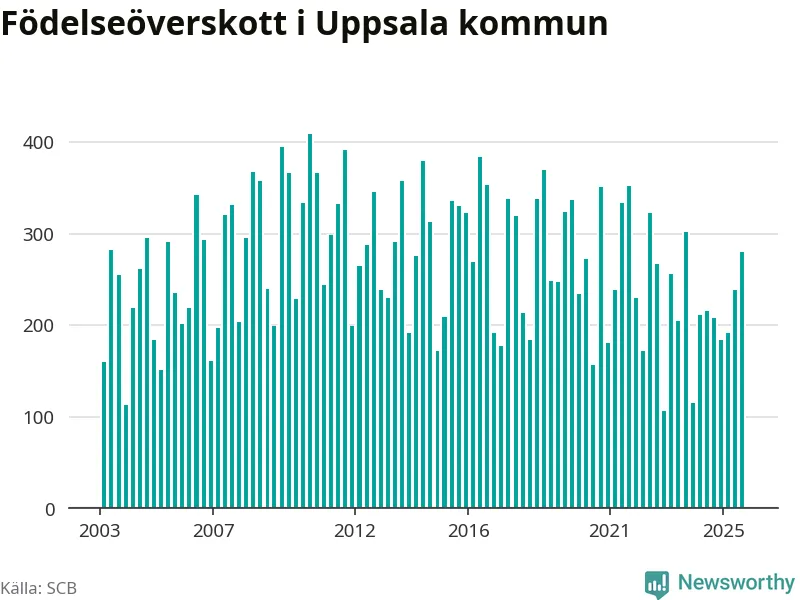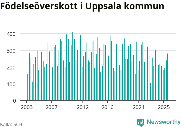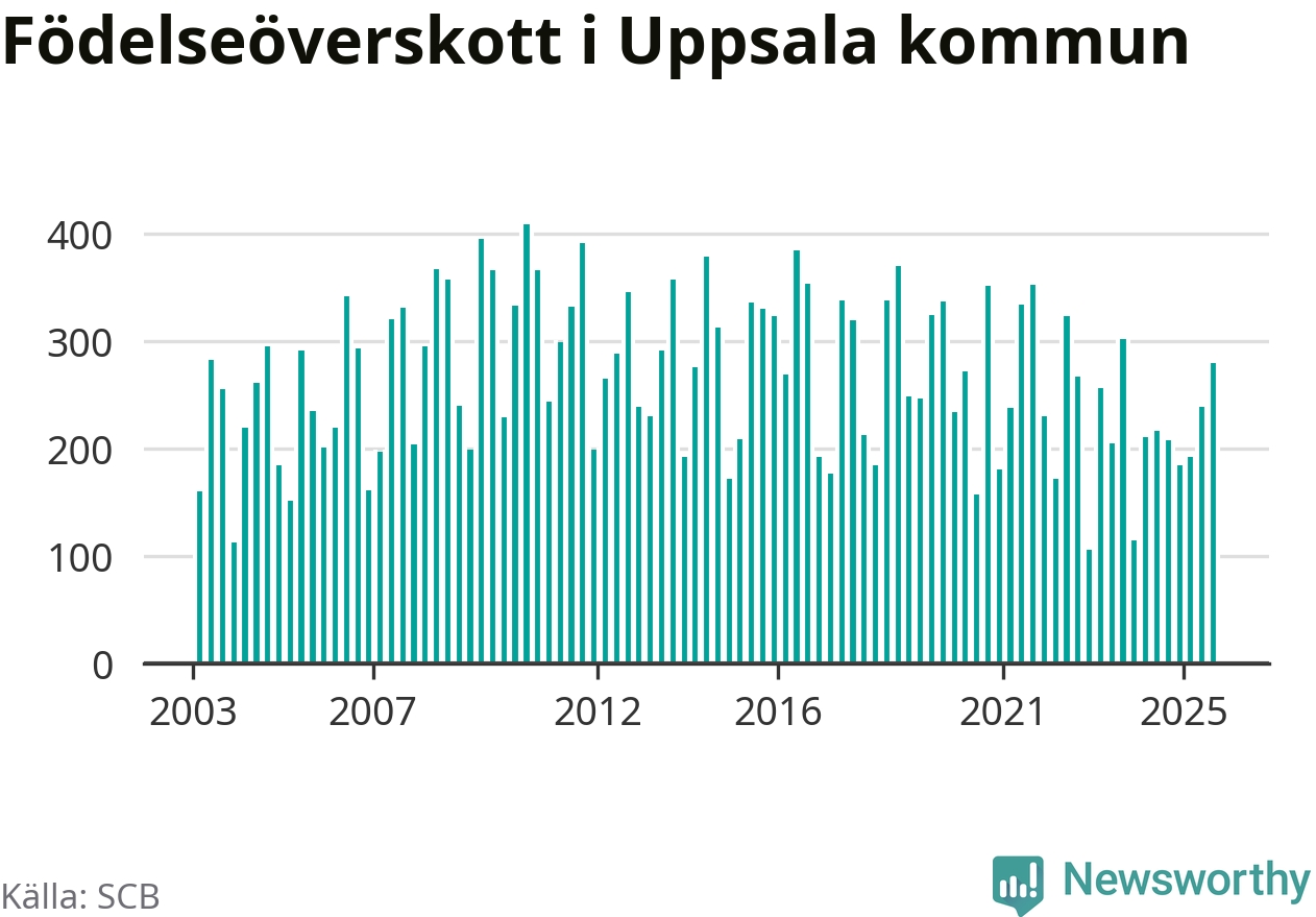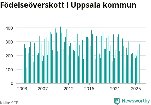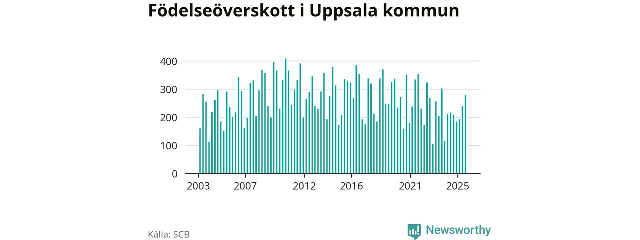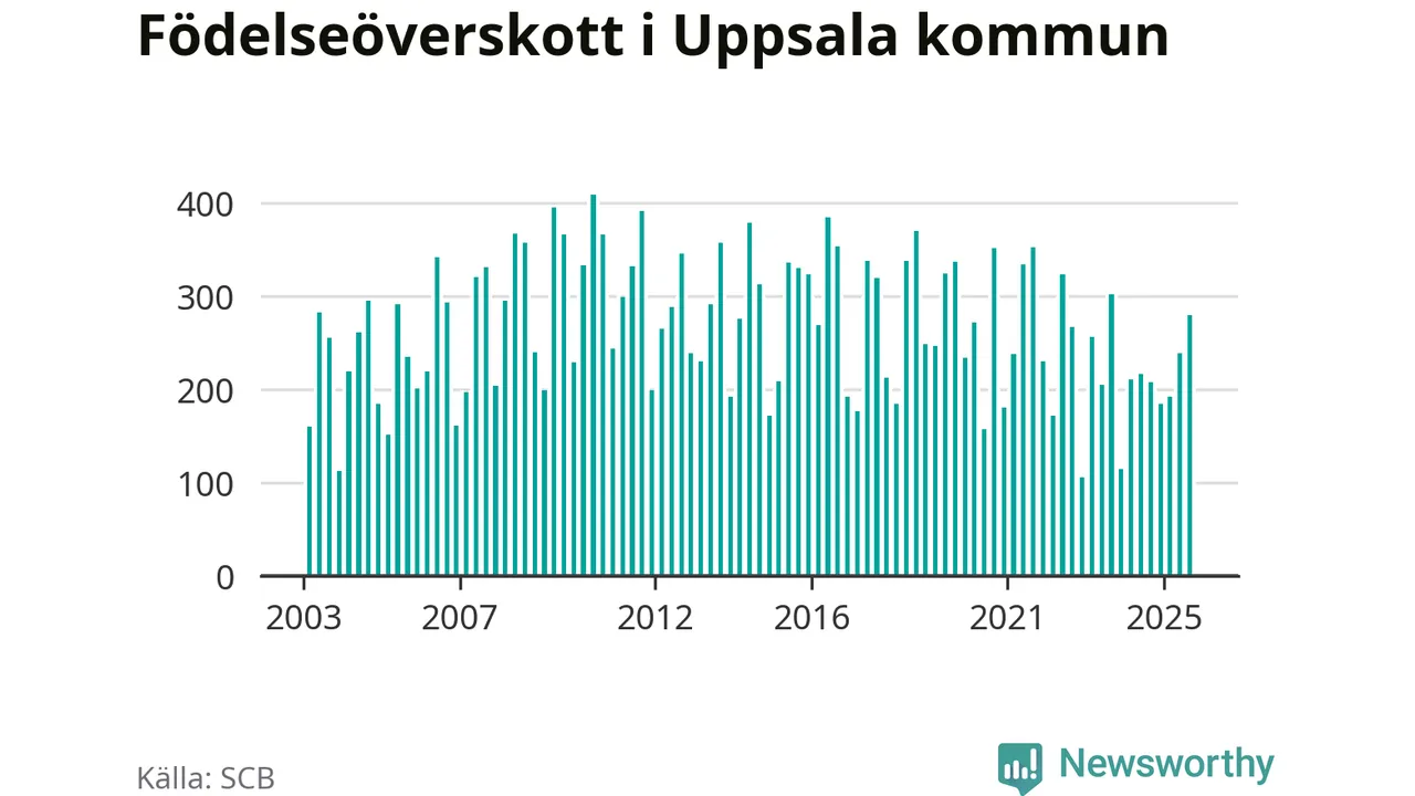 Enligt SCB:s siffror föddes 642 barn i Uppsala kommun under det senaste kvartalet. Samtidigt avled 362 personer. Uppsala hade alltså ett positivt födelsenetto, vilket kommunen historiskt sett i princip alltid har haft.