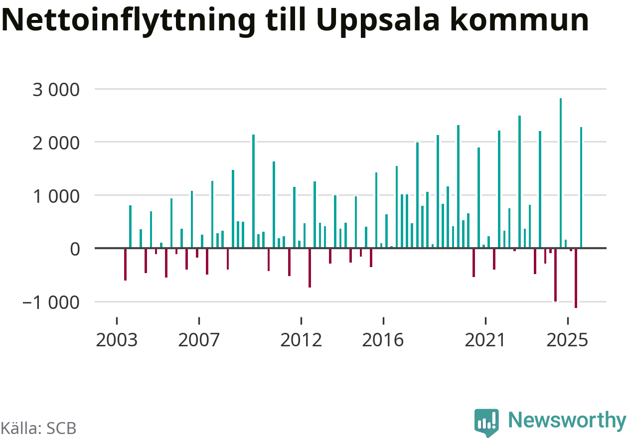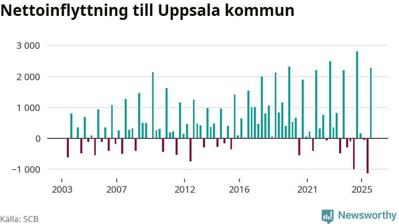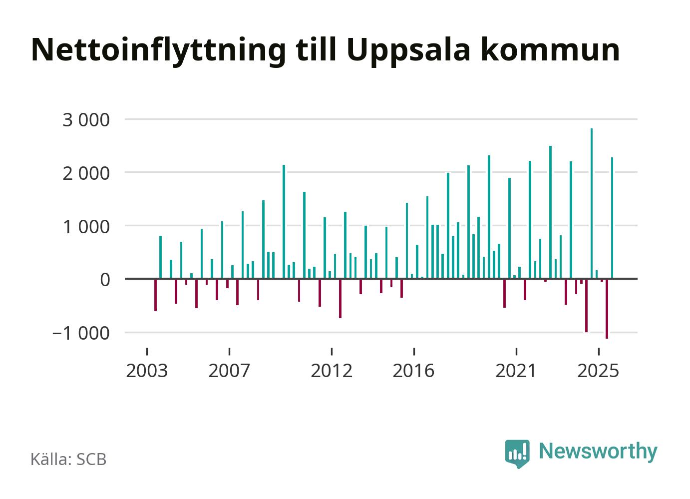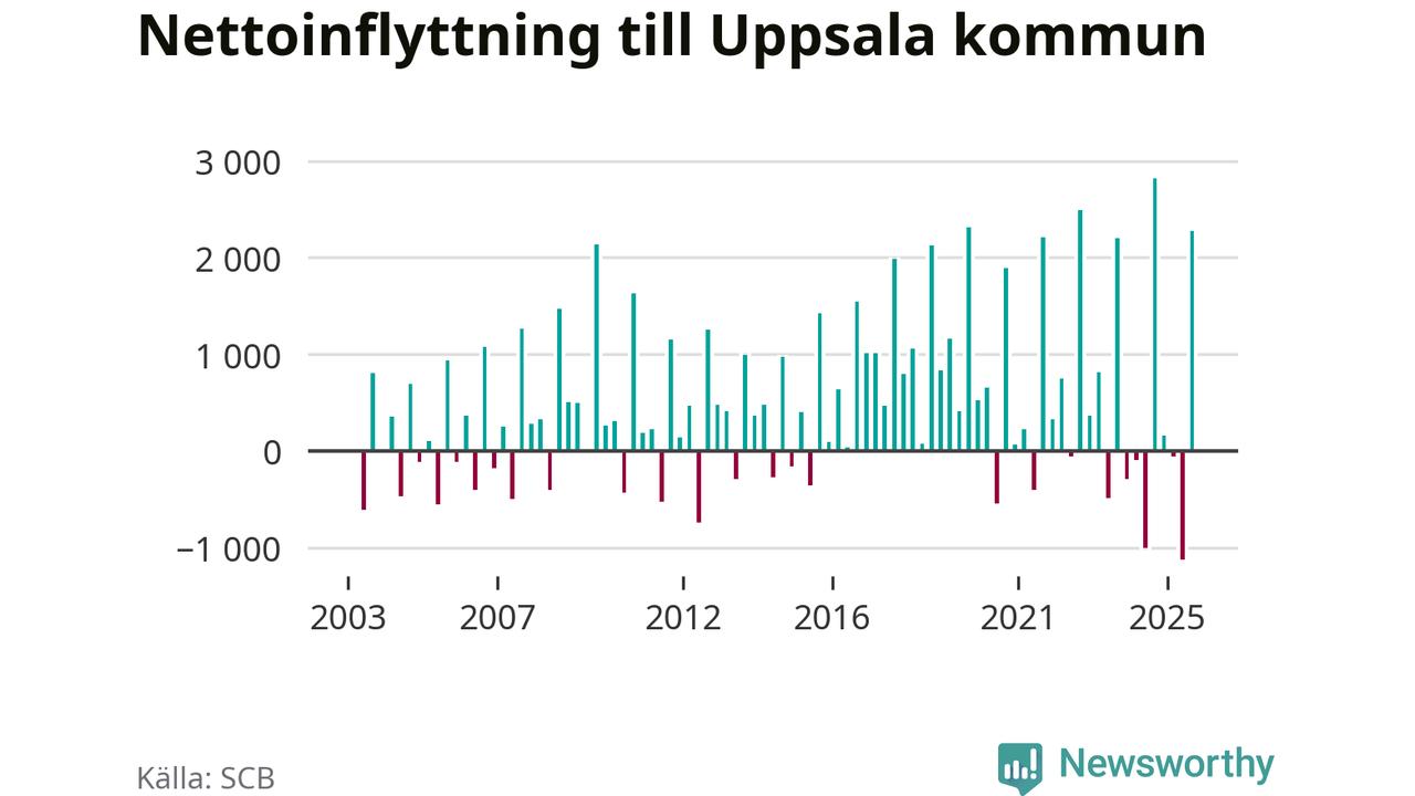 Under tredje kvartalet 2025 flyttade 7 108 personer till kommunen medan 4 831 personer flyttade därifrån. Det är historiskt sett en stor inflyttning under ett kvartal – men samtidigt var utflyttningen den största hittills. Sedan kommunen fick sin nuvarande form har Uppsala kommun oftast haft ett positivt flyttnetto, inklusive det senaste kvartalet.
