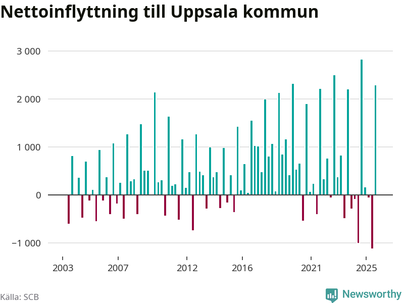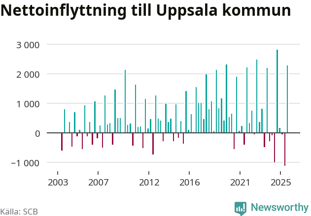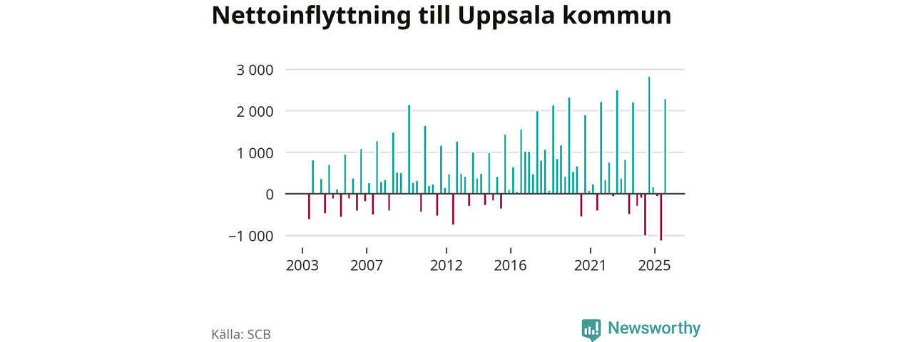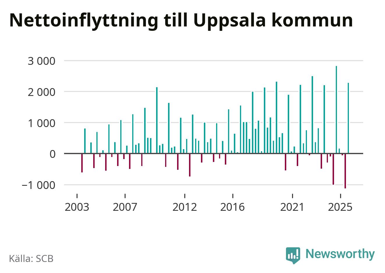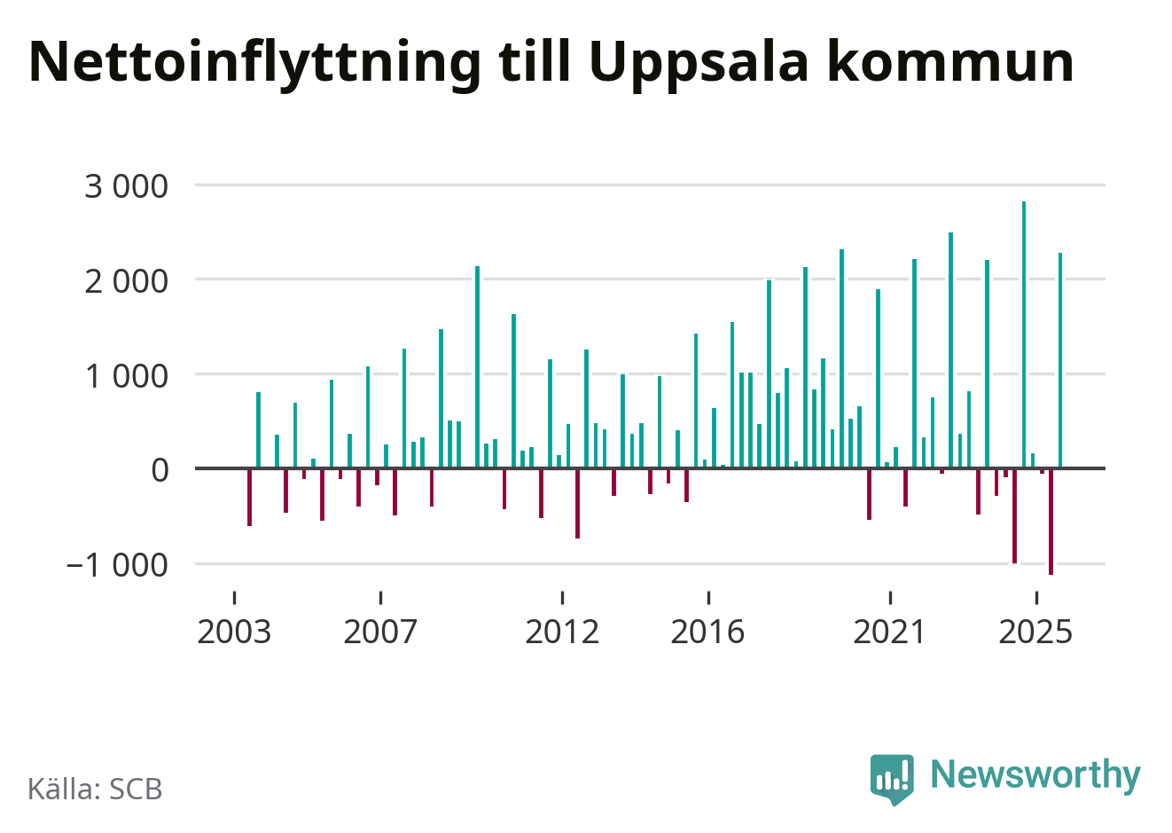 Under tredje kvartalet 2025 flyttade 7 108 personer till kommunen medan 4 831 personer flyttade därifrån. Det är historiskt sett en stor inflyttning under ett kvartal – men samtidigt var utflyttningen den största hittills. Sedan kommunen fick sin nuvarande form har Uppsala kommun oftast haft ett positivt flyttnetto, inklusive det senaste kvartalet.