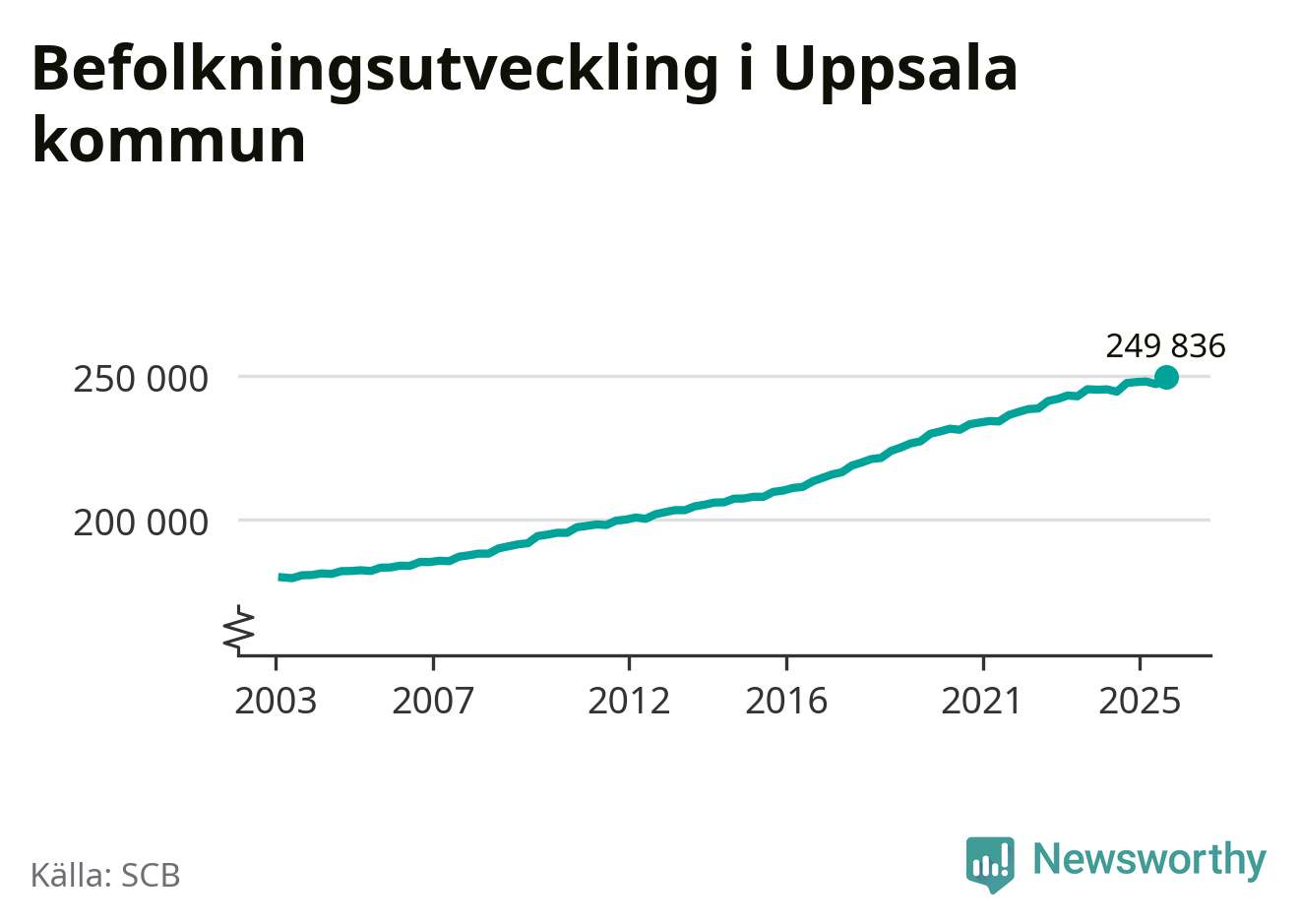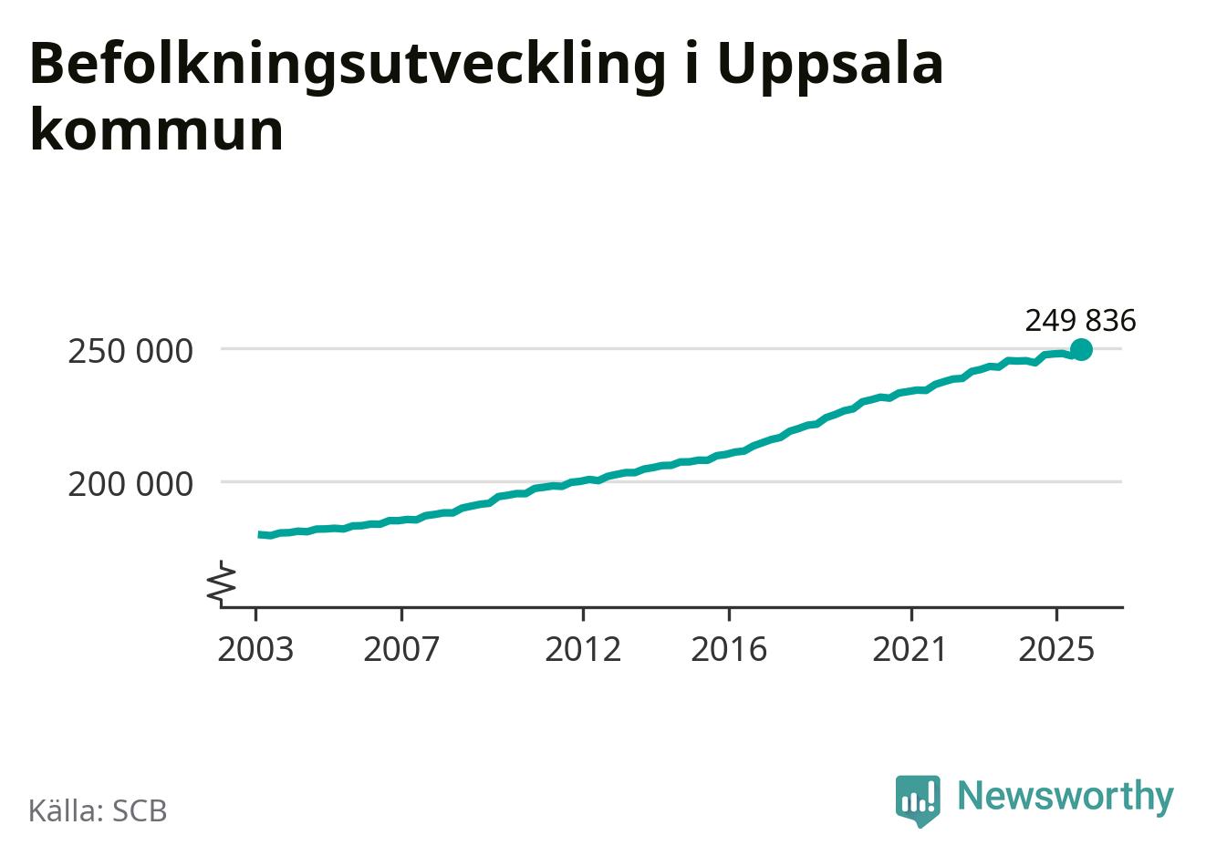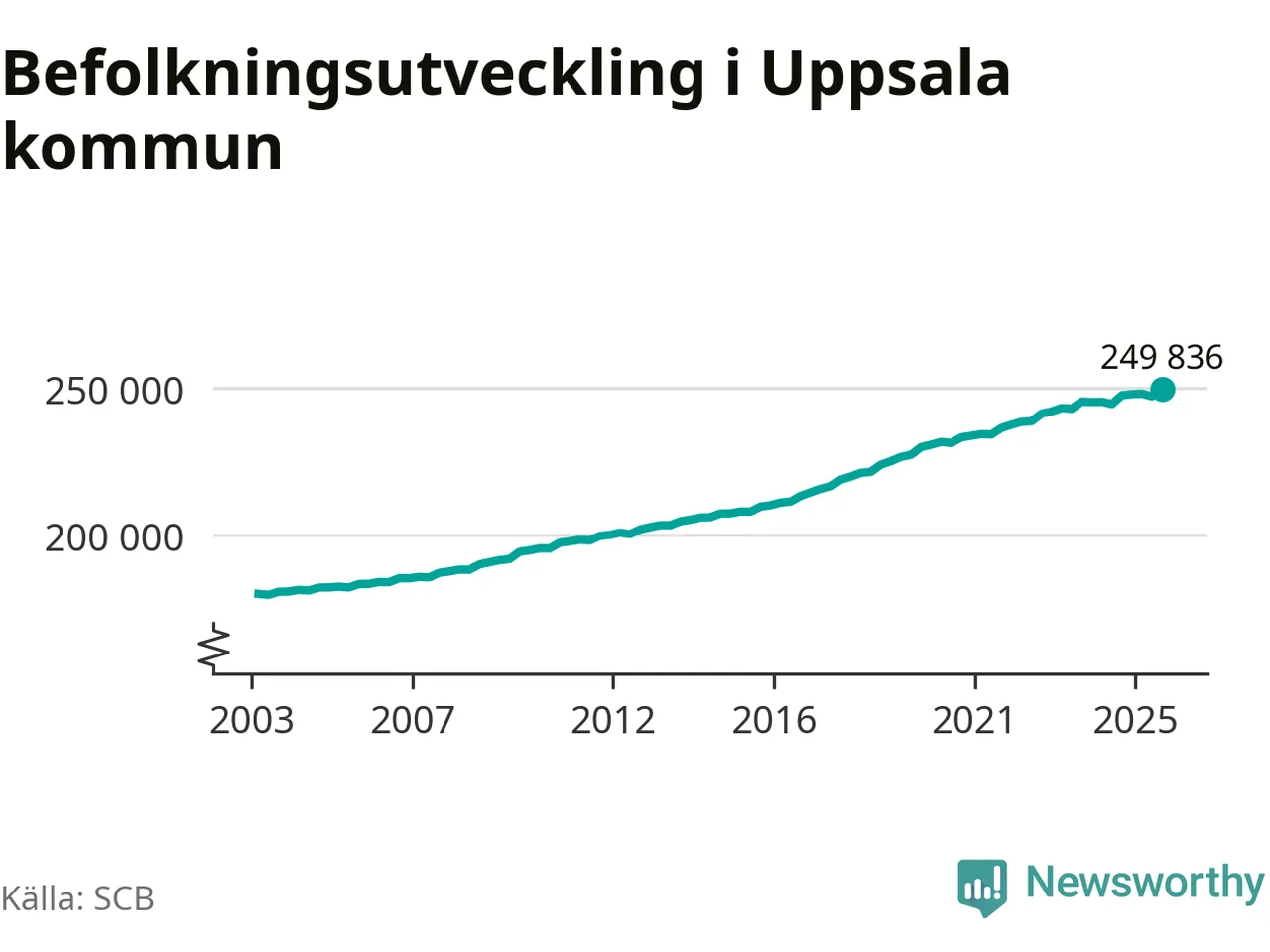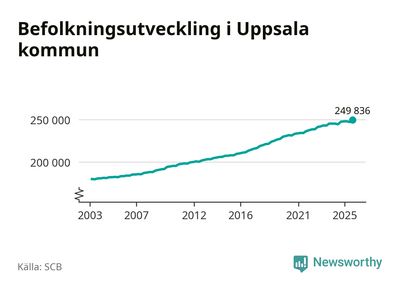 Befolkningen ökade i Uppsala kommun under det tredje kvartalet 2025. Den 30 september bodde enligt SCB:s senaste siffror 249 836 personer i kommunen, vilket är 2 567 fler än i slutet av andra kvartalet. Folkökningen är procentuellt sett en av de största i Uppsala län.