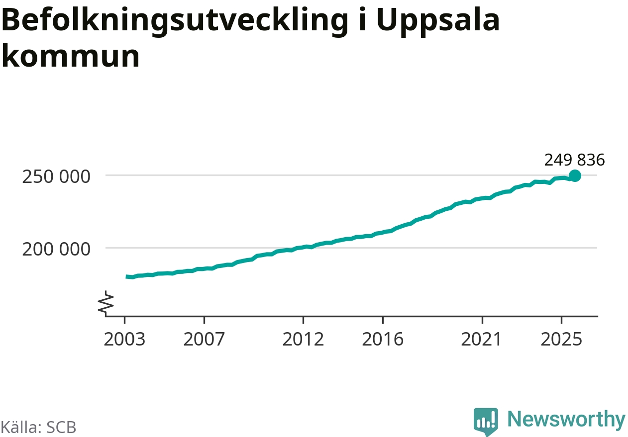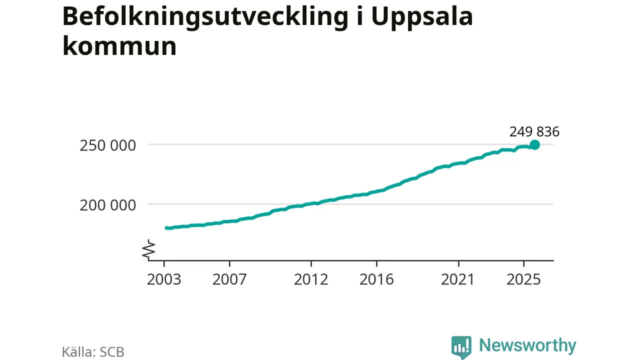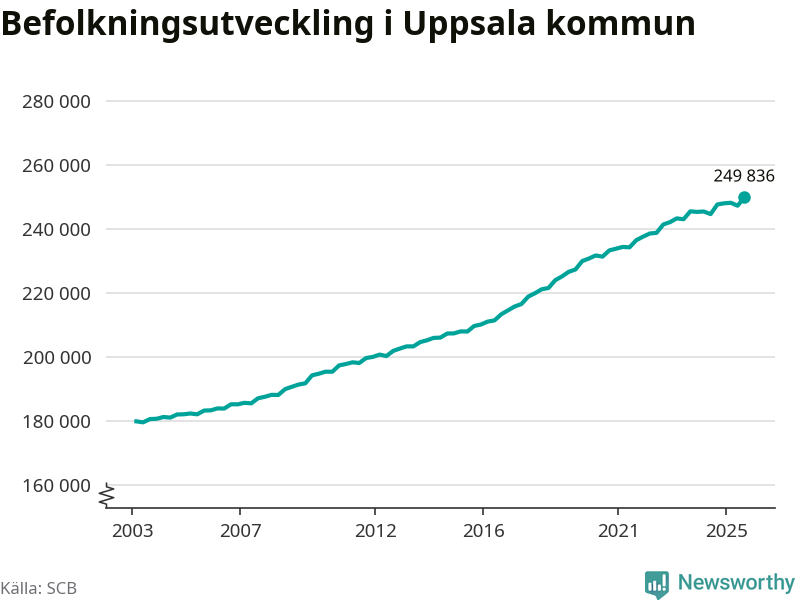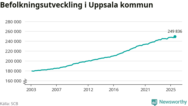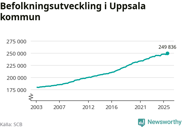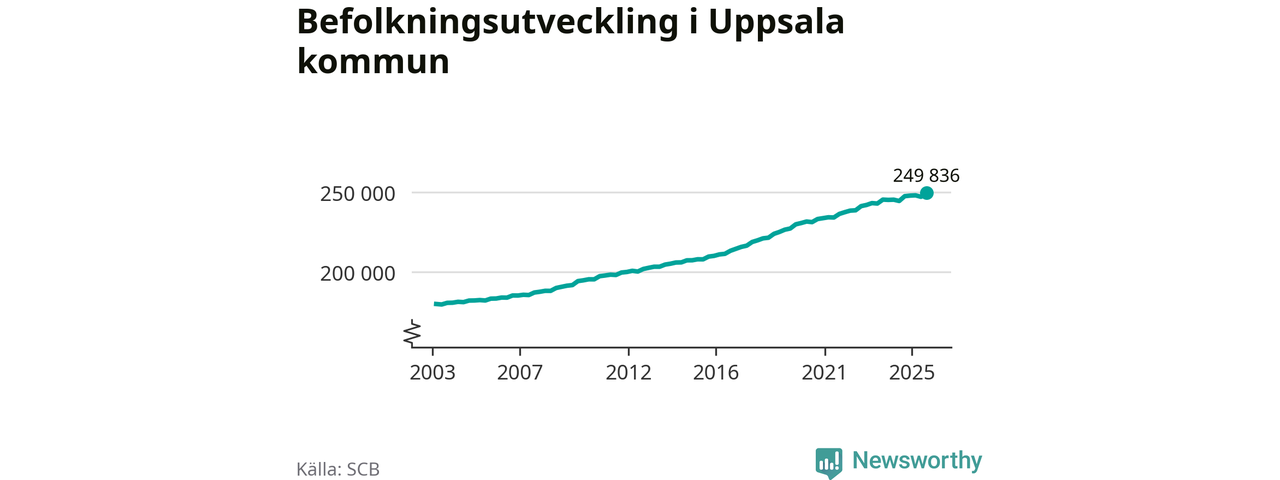 Befolkningen ökade i Uppsala kommun under det tredje kvartalet 2025. Den 30 september bodde enligt SCB:s senaste siffror 249 836 personer i kommunen, vilket är 2 567 fler än i slutet av andra kvartalet. Folkökningen är procentuellt sett en av de största i Uppsala län.