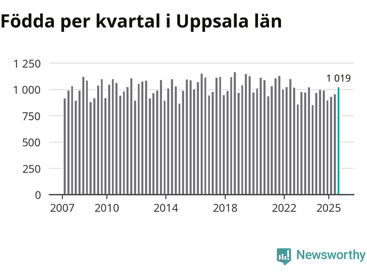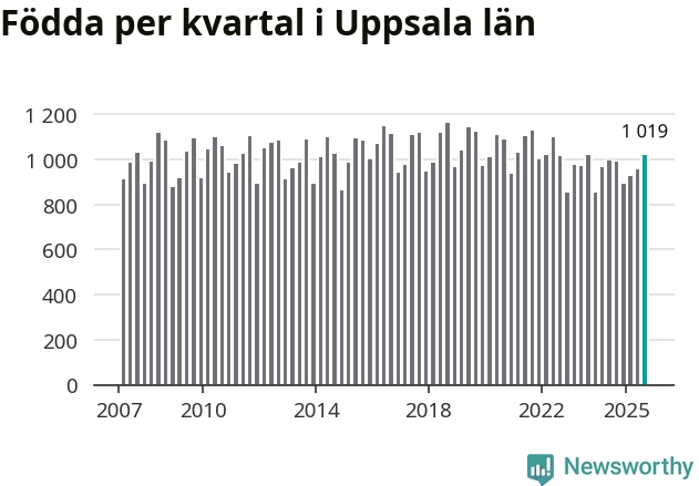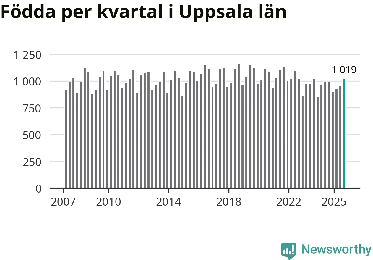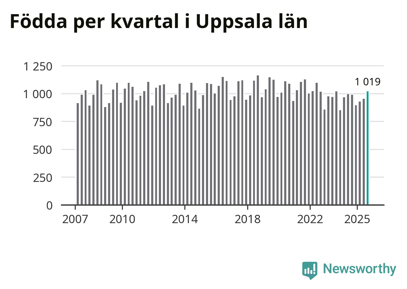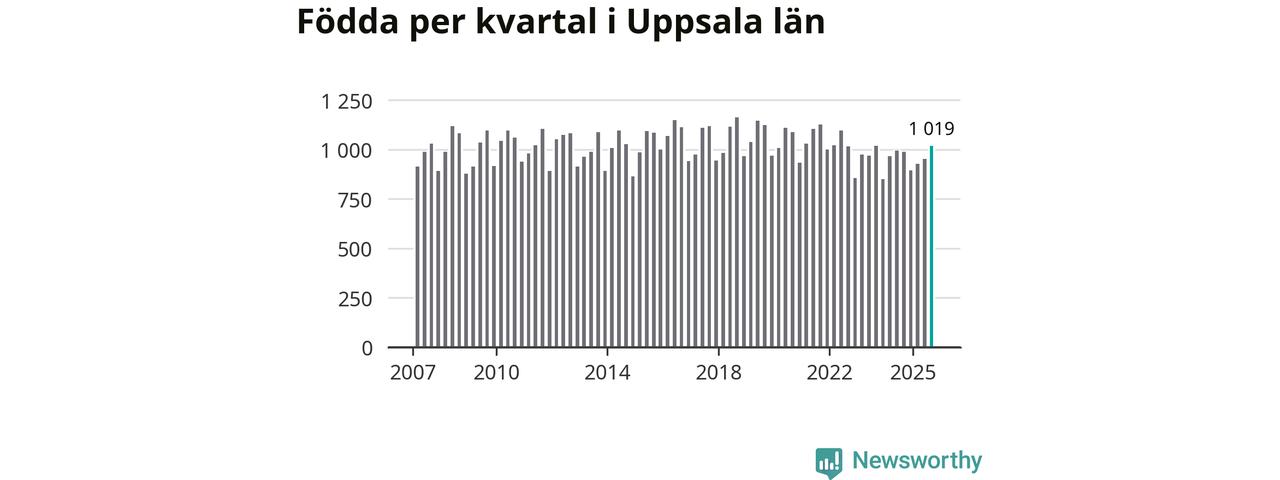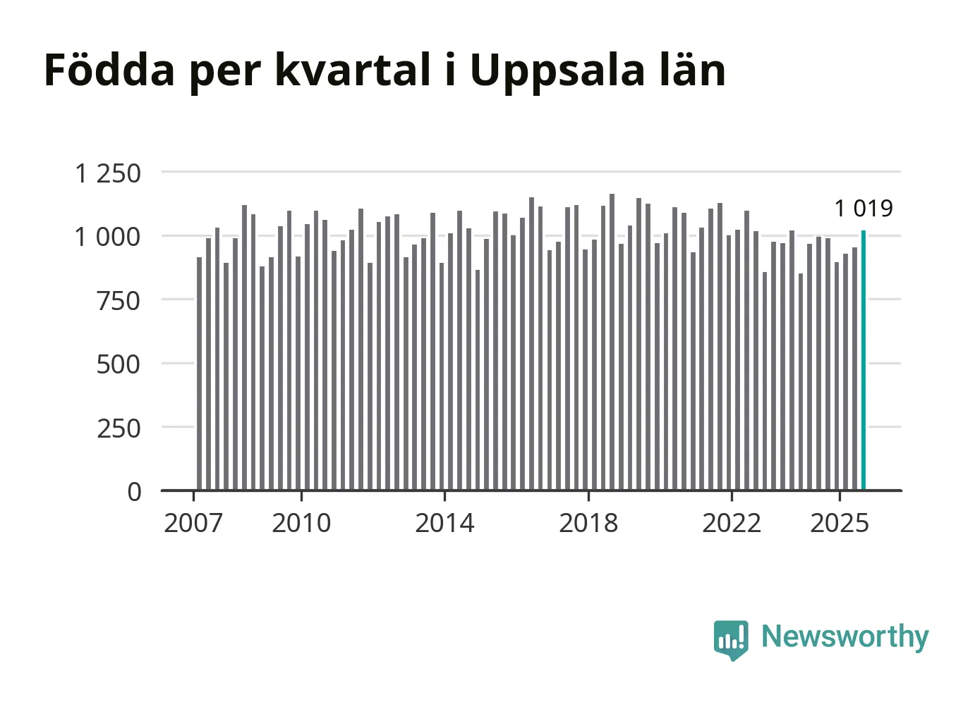 Enligt SCB:s siffror föddes 1 019 barn i Uppsala län under det senaste kvartalet. Samtidigt avled 691 personer. Uppsala hade alltså ett positivt födelsenetto, vilket länet historiskt sett nästan alltid har haft.