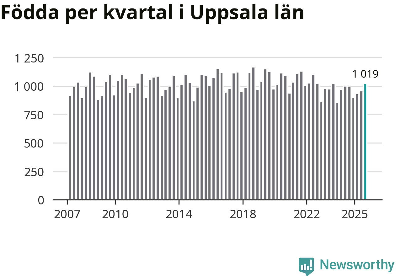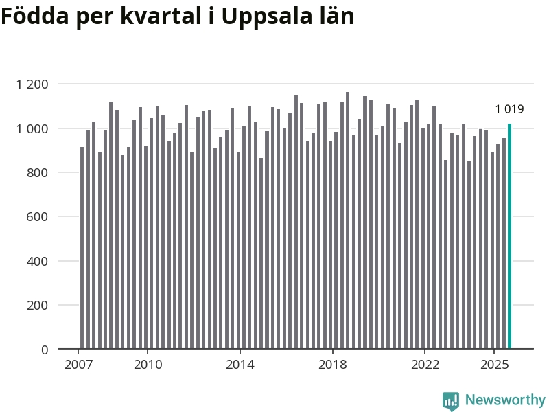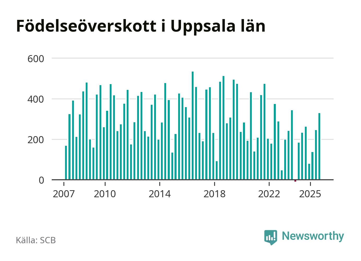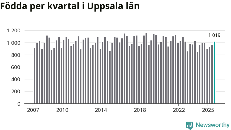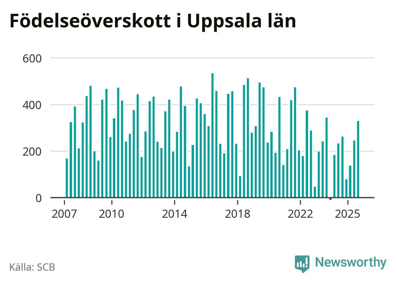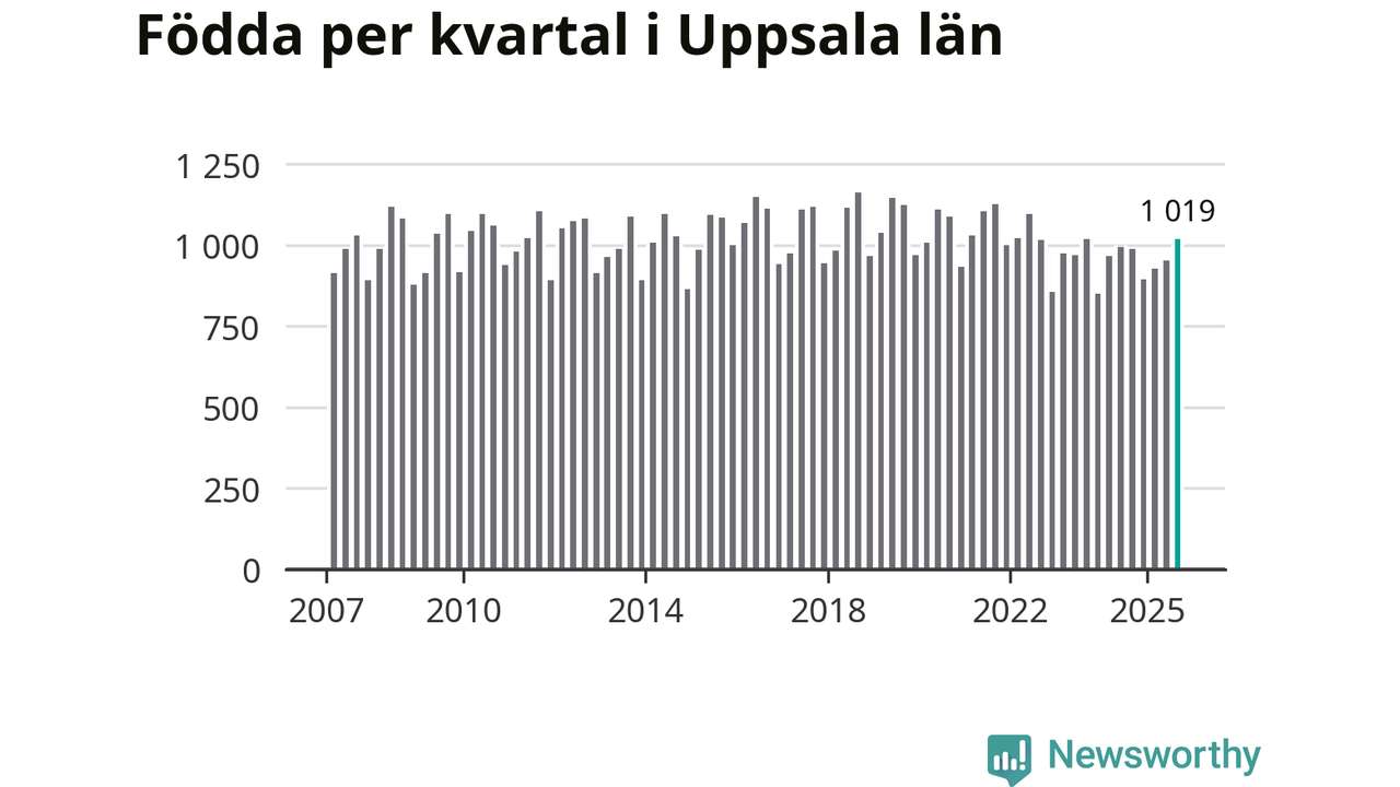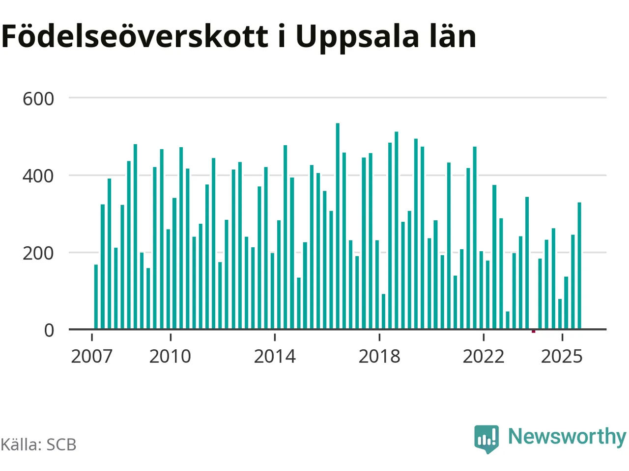 Enligt SCB:s siffror föddes 1 019 barn i Uppsala län under det senaste kvartalet. Samtidigt avled 691 personer. Uppsala hade alltså ett positivt födelsenetto, vilket länet historiskt sett nästan alltid har haft.