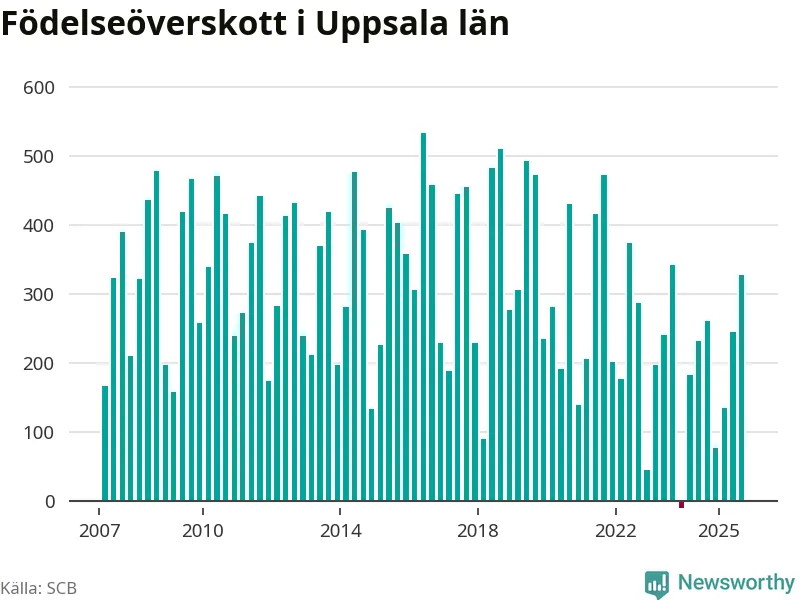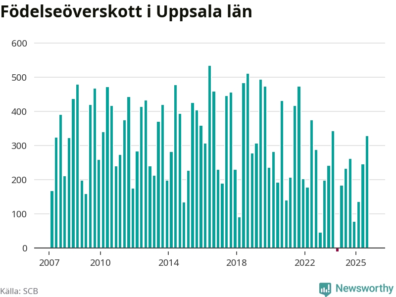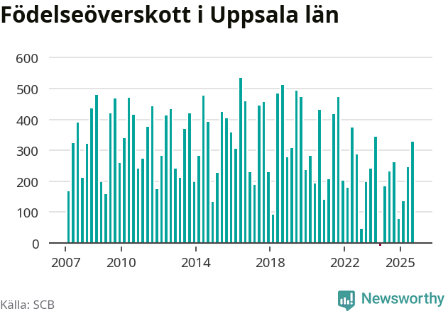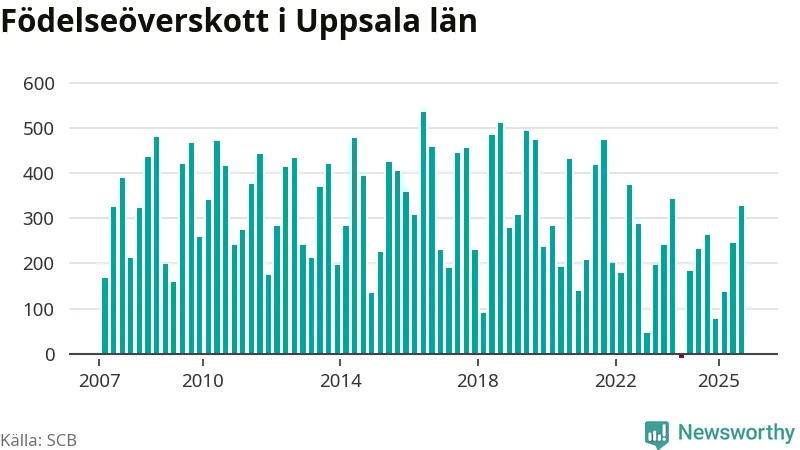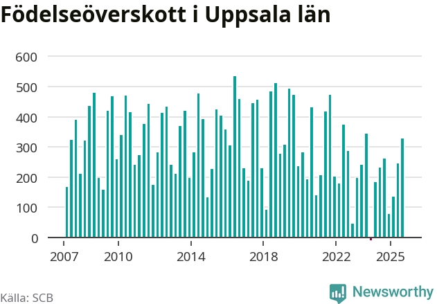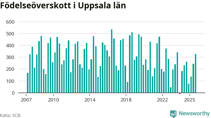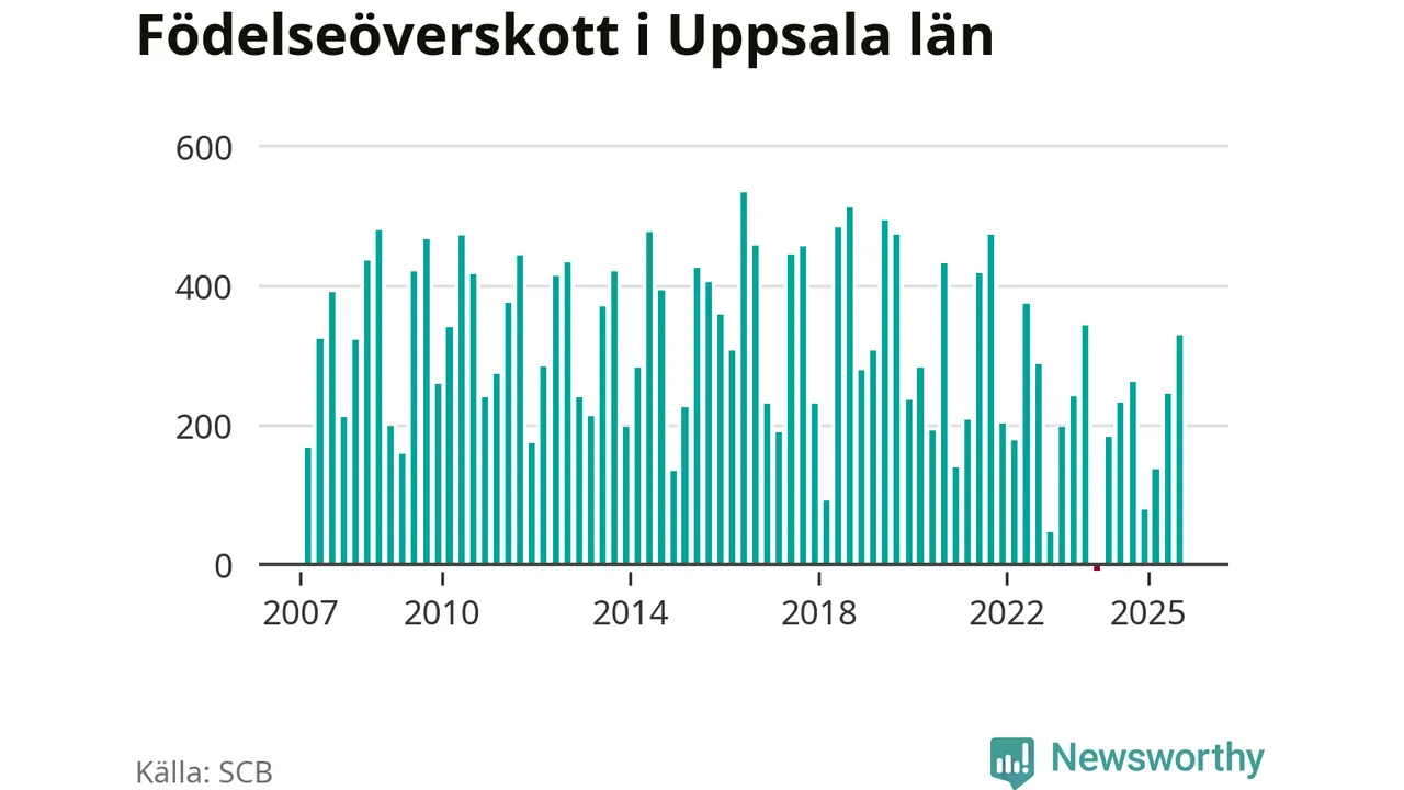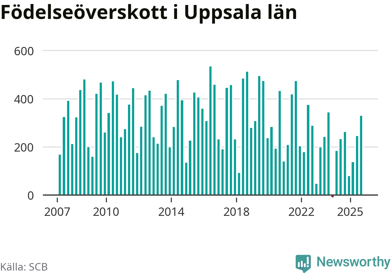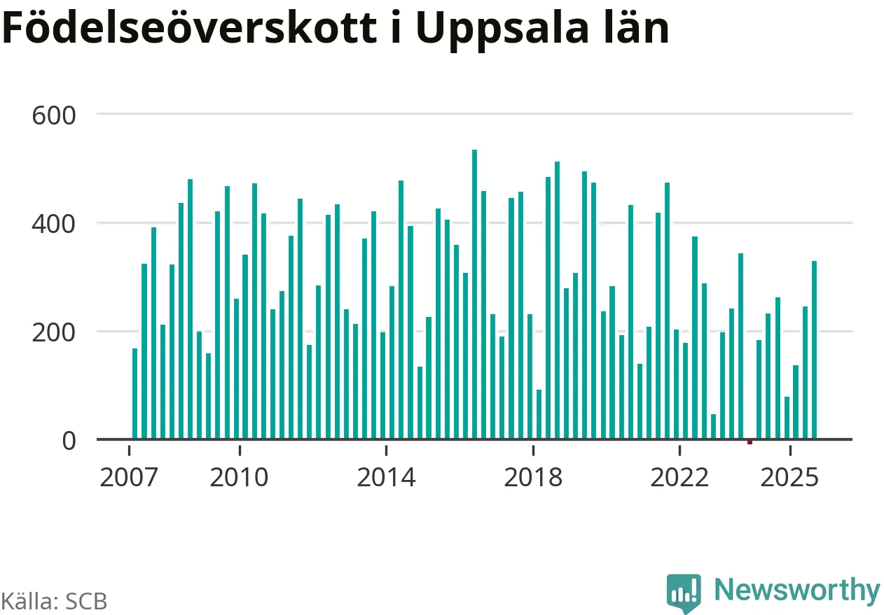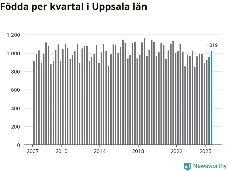 Enligt SCB:s siffror föddes 1 019 barn i Uppsala län under det senaste kvartalet. Samtidigt avled 691 personer. Uppsala hade alltså ett positivt födelsenetto, vilket länet historiskt sett nästan alltid har haft.