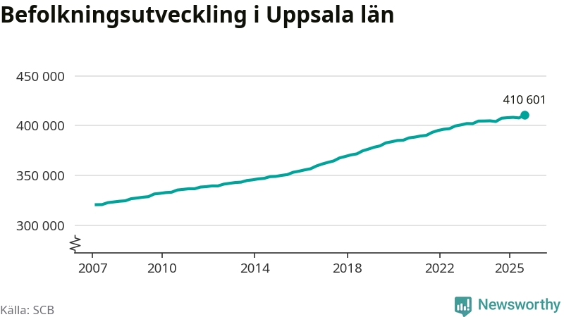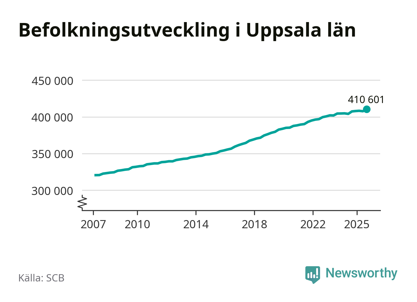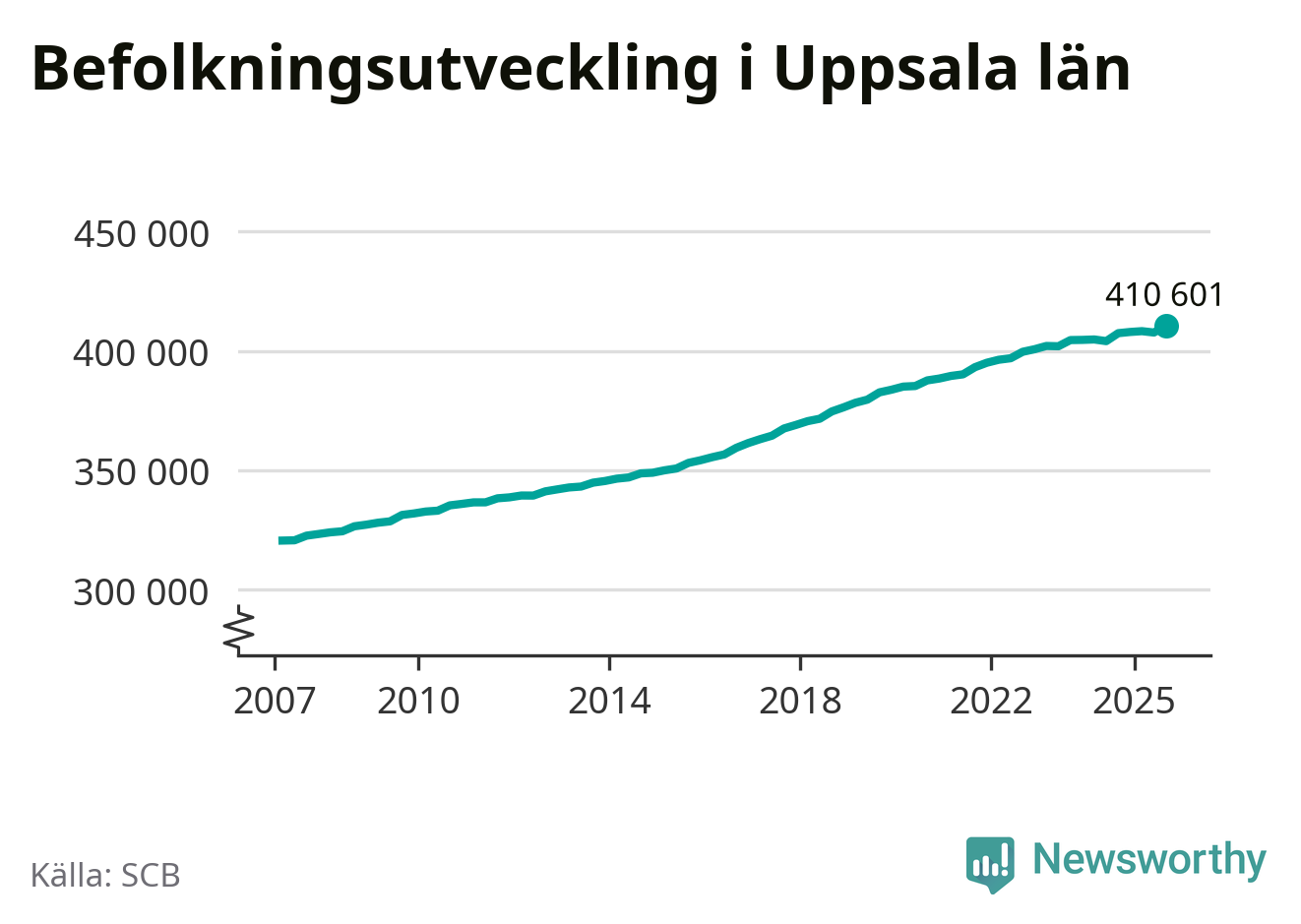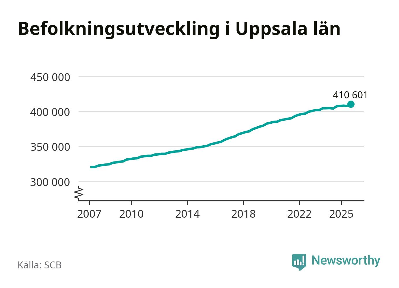 Den 30 september bodde enligt SCB:s senaste siffror 410 601 personer i länet, vilket är 2 922 fler än i slutet av andra kvartalet. Uppsala ökade därmed mest av alla län i Sverige procentuellt sett.