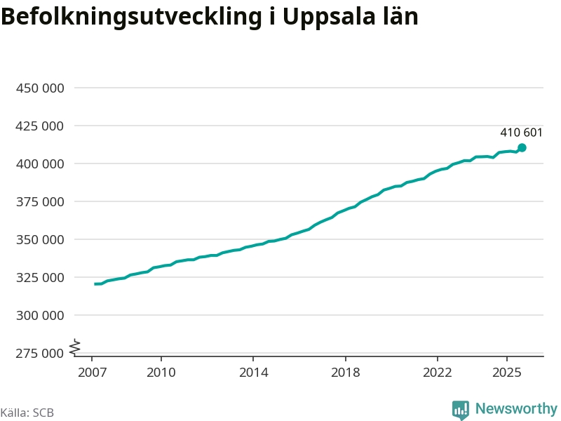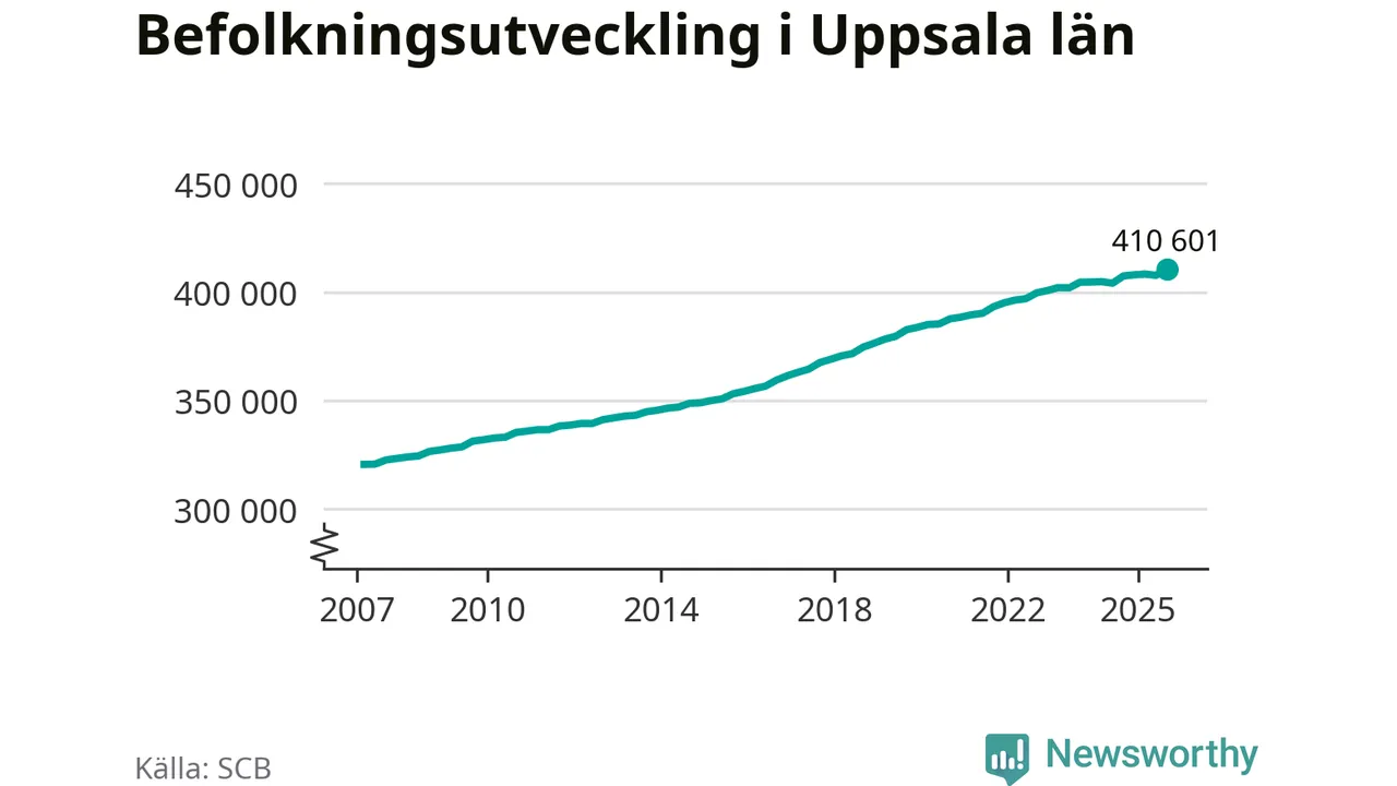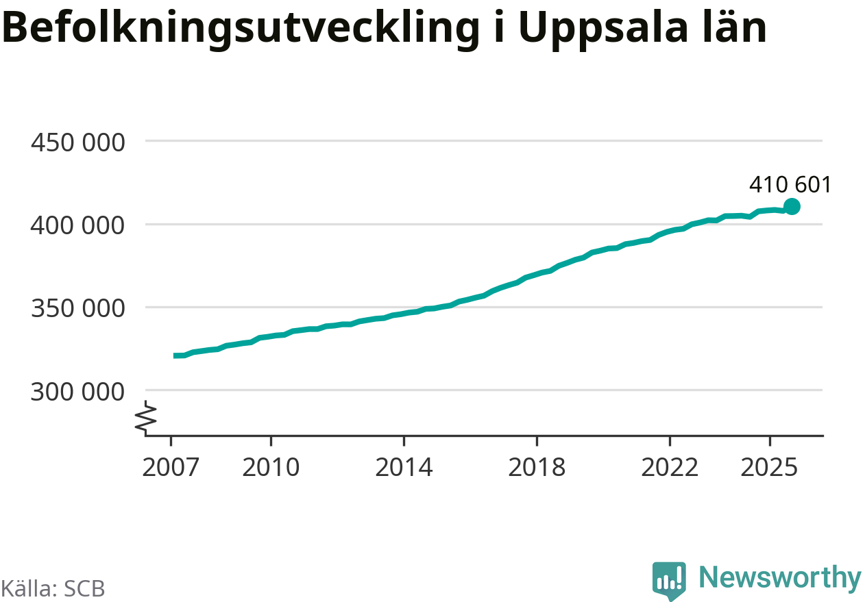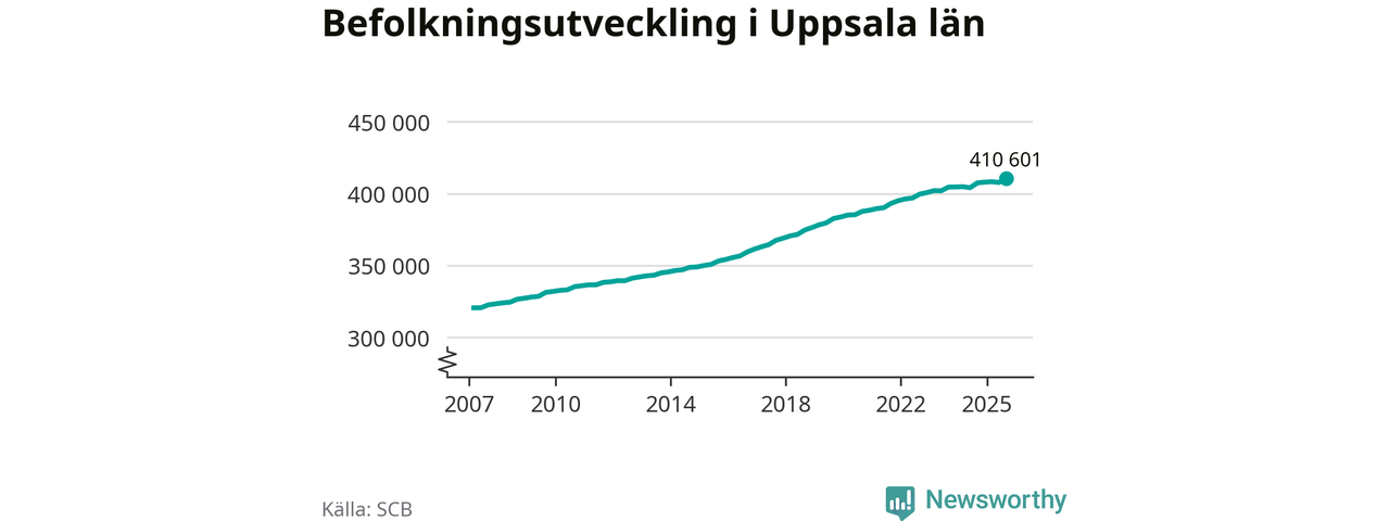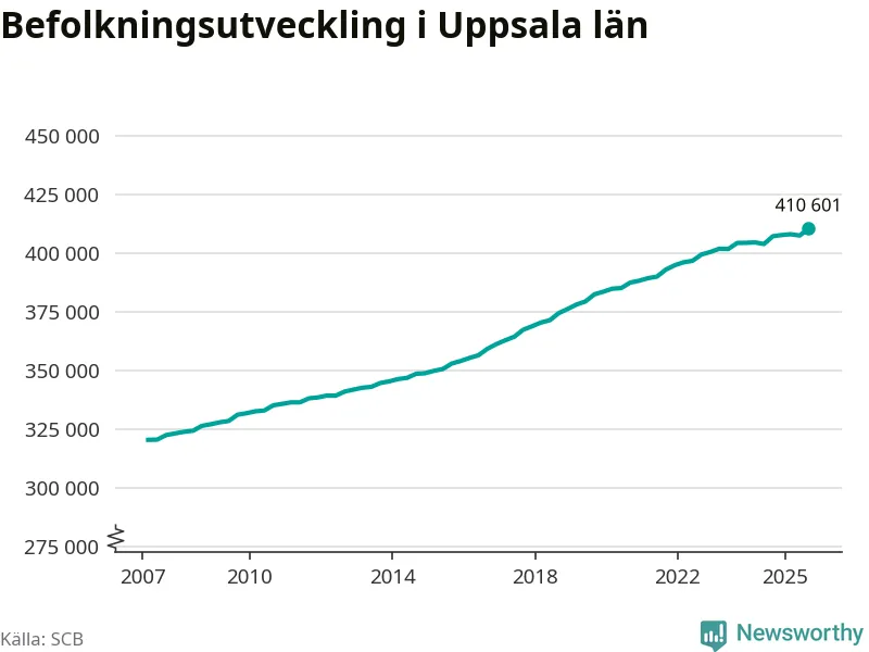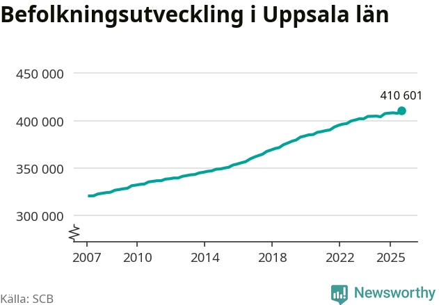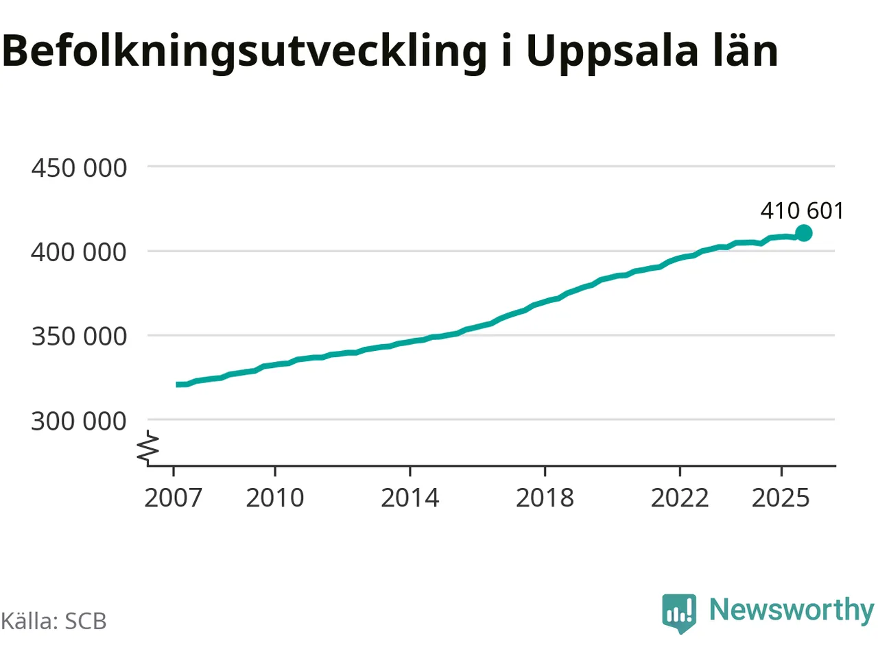 Den 30 september bodde enligt SCB:s senaste siffror 410 601 personer i länet, vilket är 2 922 fler än i slutet av andra kvartalet. Uppsala ökade därmed mest av alla län i Sverige procentuellt sett.