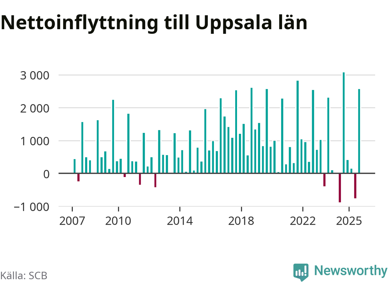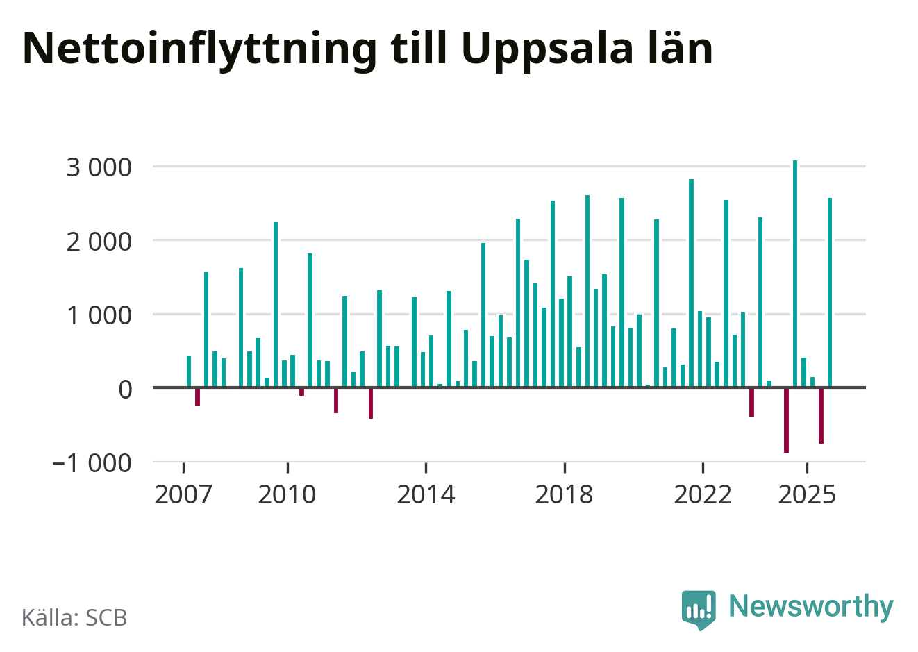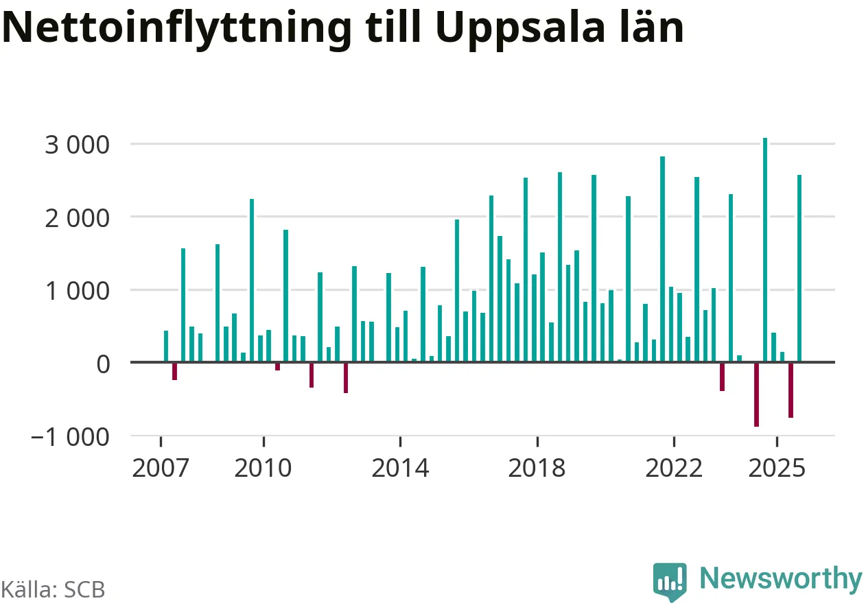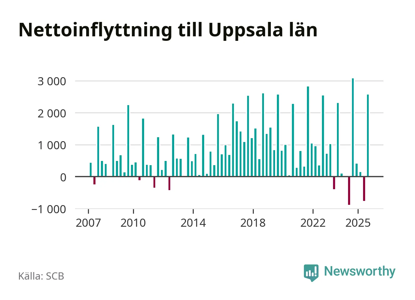 Under tredje kvartalet 2025 flyttade 8 563 personer till länet medan 5 999 personer flyttade därifrån. Det är historiskt sett en stor inflyttning under ett kvartal – men samtidigt var utflyttningen den största hittills. Sedan länet fick sin nuvarande form har Uppsala län haft ett positivt flyttnetto under nästan alla kvartal, inklusive det senaste kvartalet.