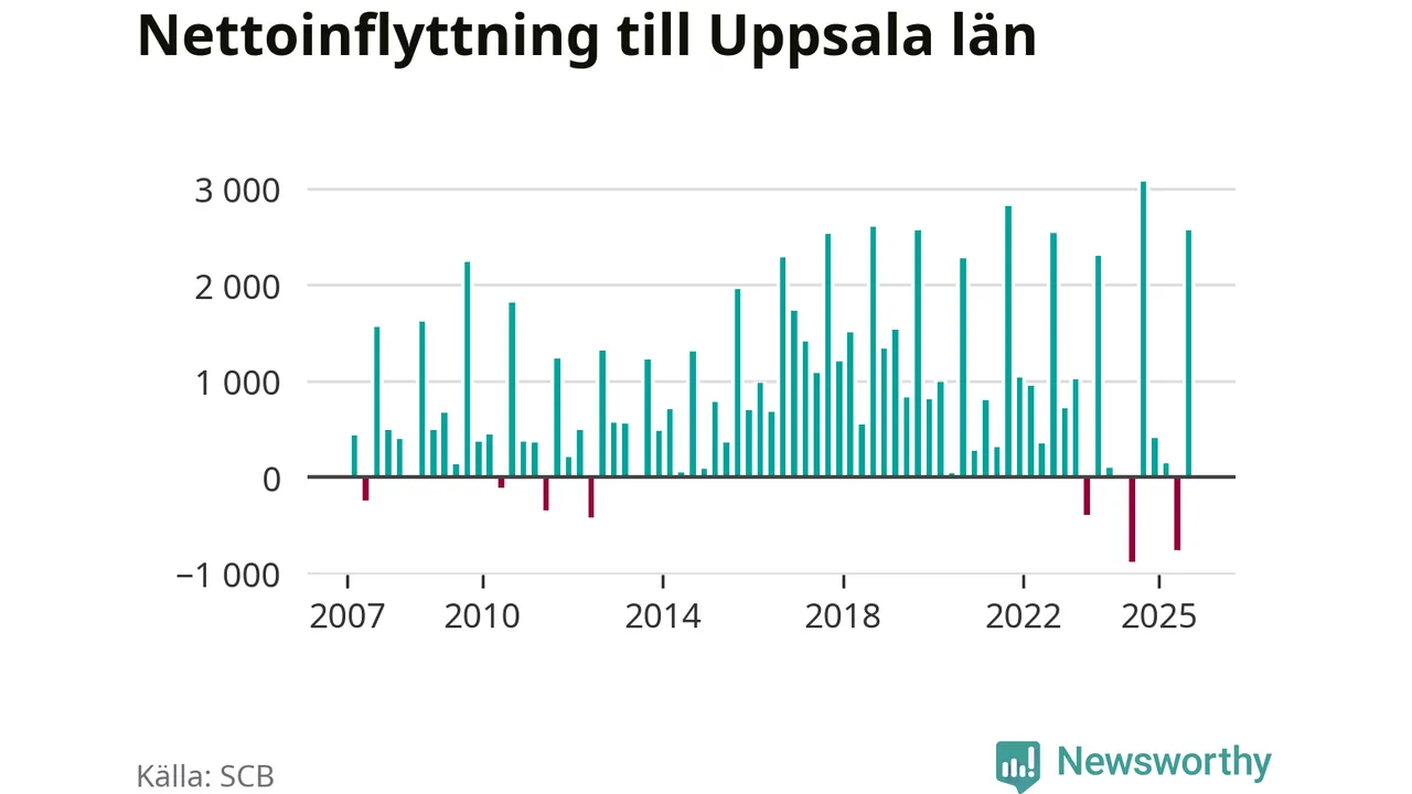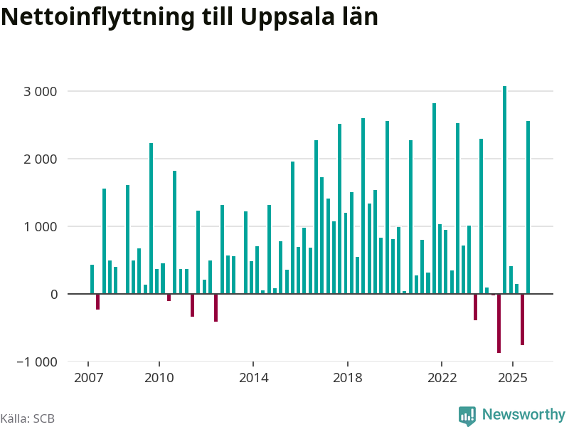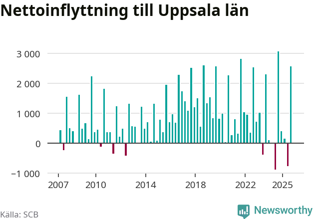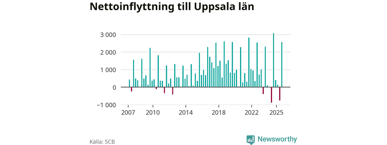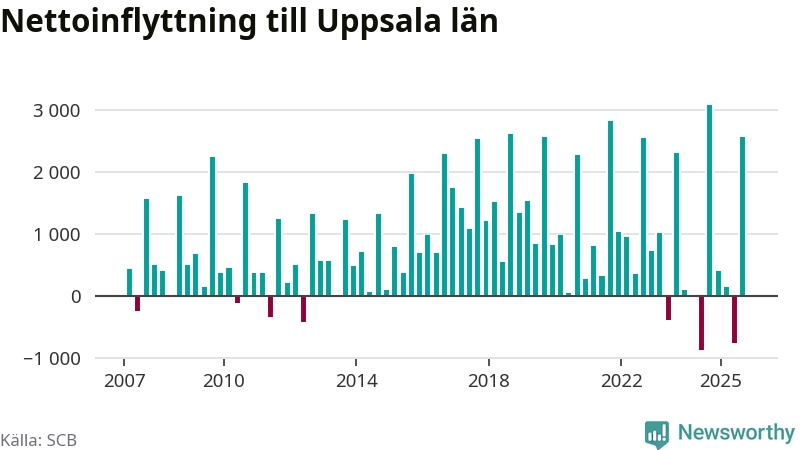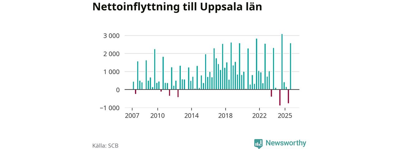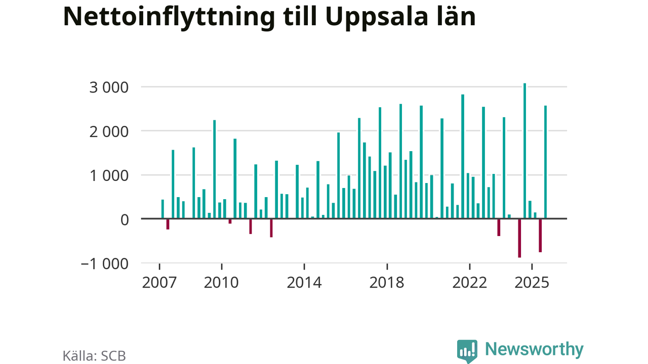 Under tredje kvartalet 2025 flyttade 8 563 personer till länet medan 5 999 personer flyttade därifrån. Det är historiskt sett en stor inflyttning under ett kvartal – men samtidigt var utflyttningen den största hittills. Sedan länet fick sin nuvarande form har Uppsala län haft ett positivt flyttnetto under nästan alla kvartal, inklusive det senaste kvartalet.
