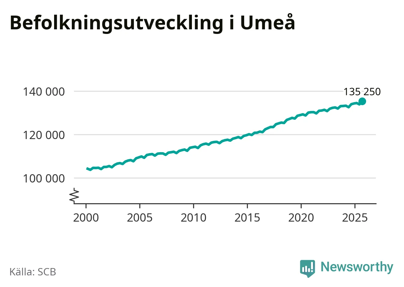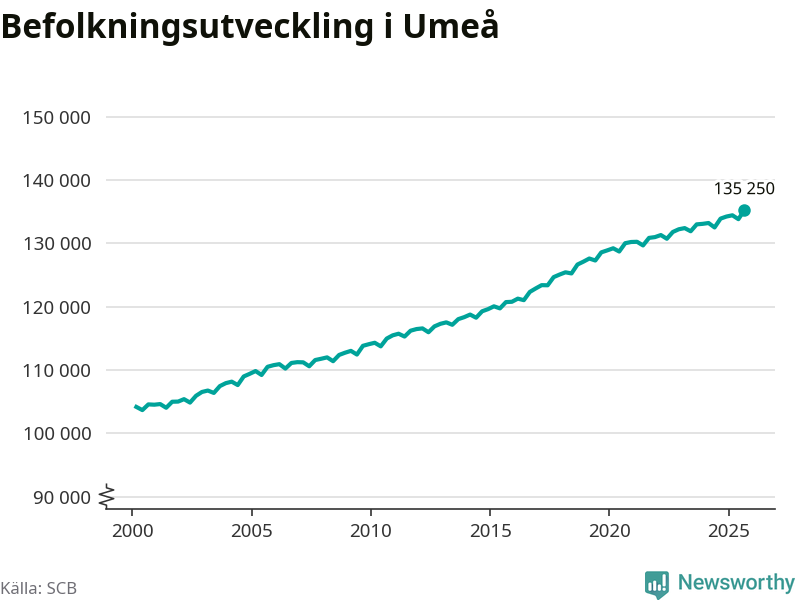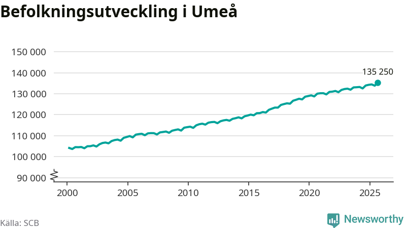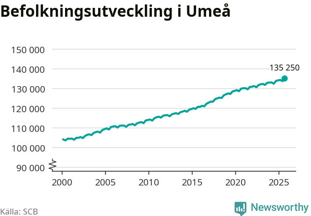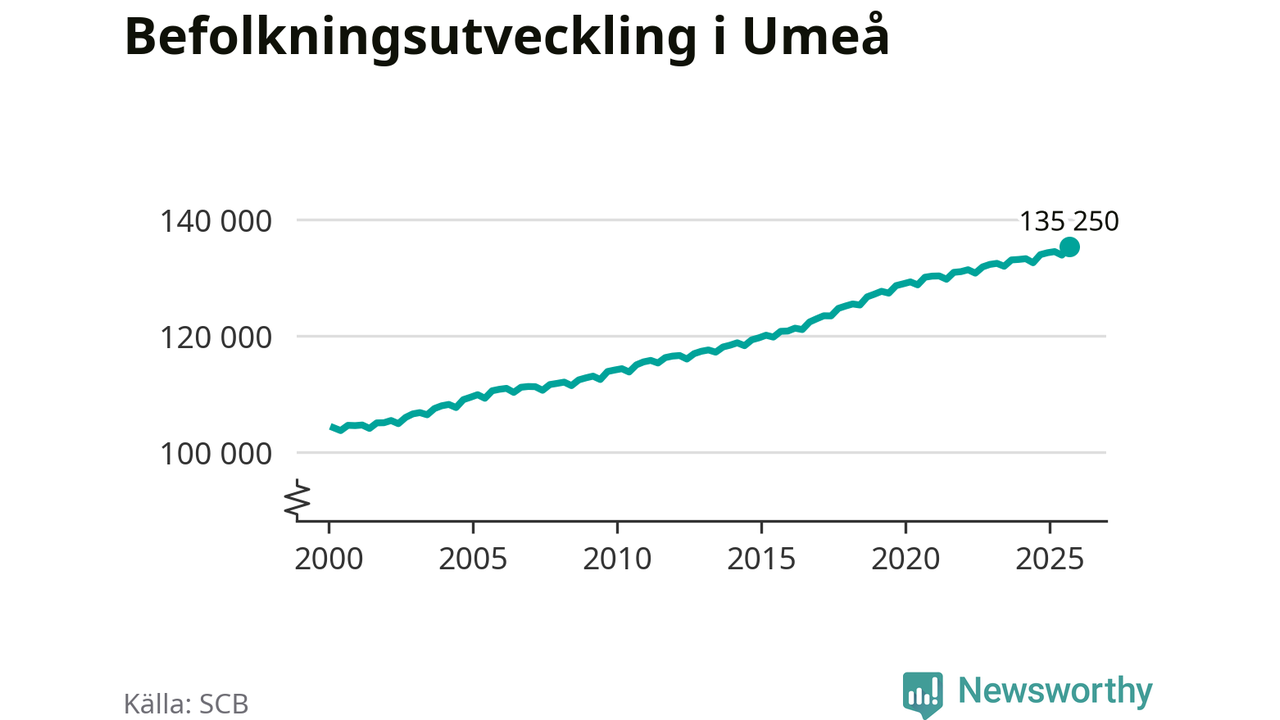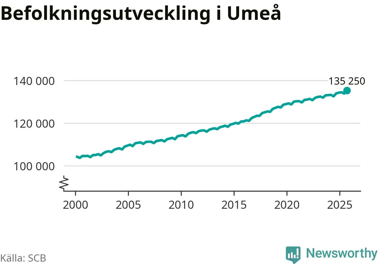 Befolkningen ökade i Umeå kommun under det tredje kvartalet 2025. Den 30 september bodde enligt SCB:s senaste siffror 135 250 personer i kommunen, vilket är 1 417 fler än i slutet av andra kvartalet. Det gör Umeå till en av de kommuner som ökar mest procentuellt i hela landet – och mest i Västerbottens län.