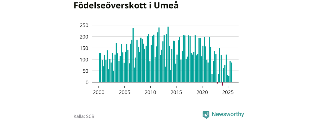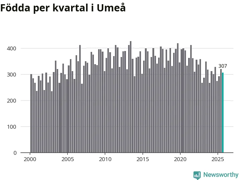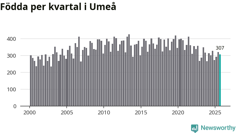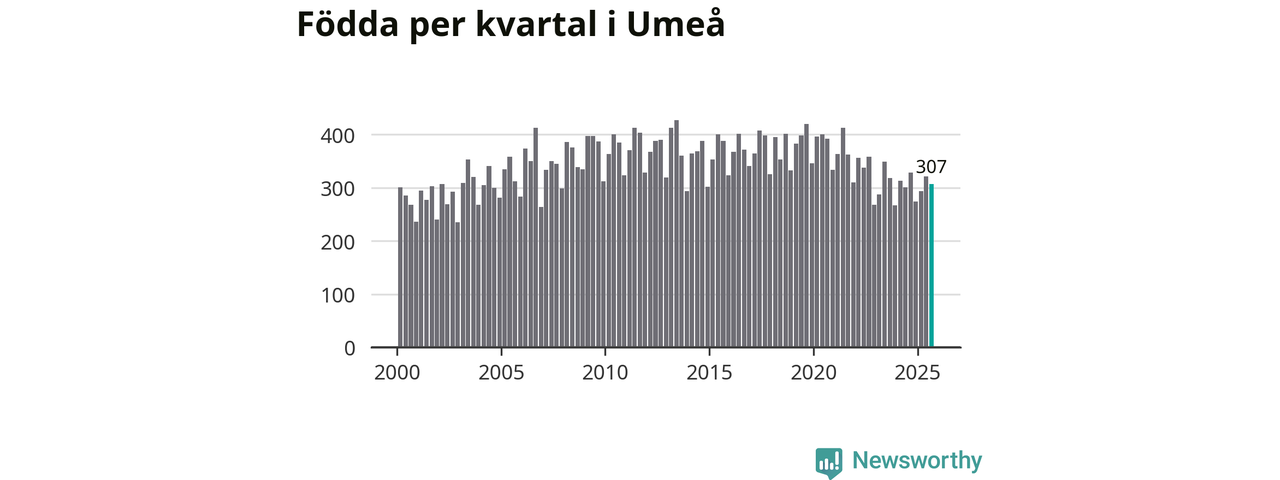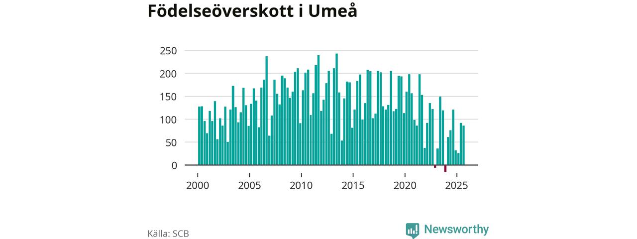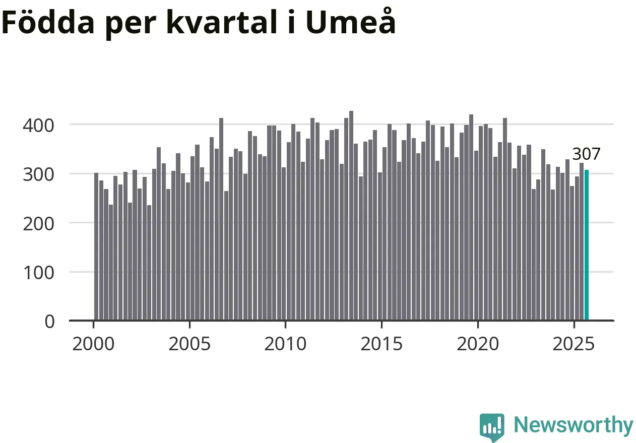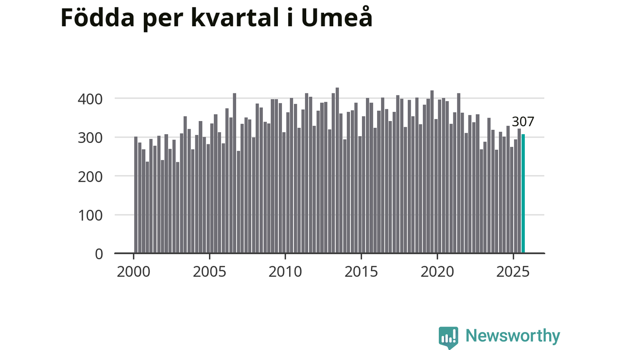 Enligt SCB:s siffror föddes 307 barn i Umeå under det senaste kvartalet. Samtidigt avled 221 personer. Umeå hade alltså ett positivt födelsenetto, vilket kommunen historiskt sett nästan alltid har haft.