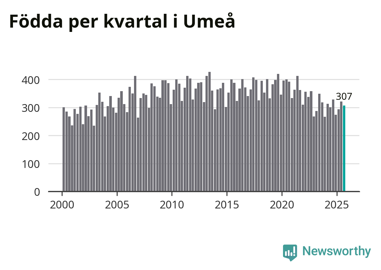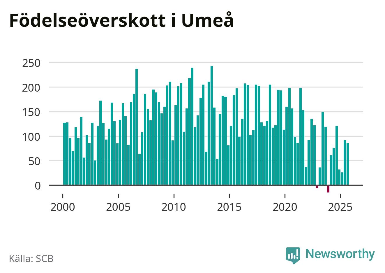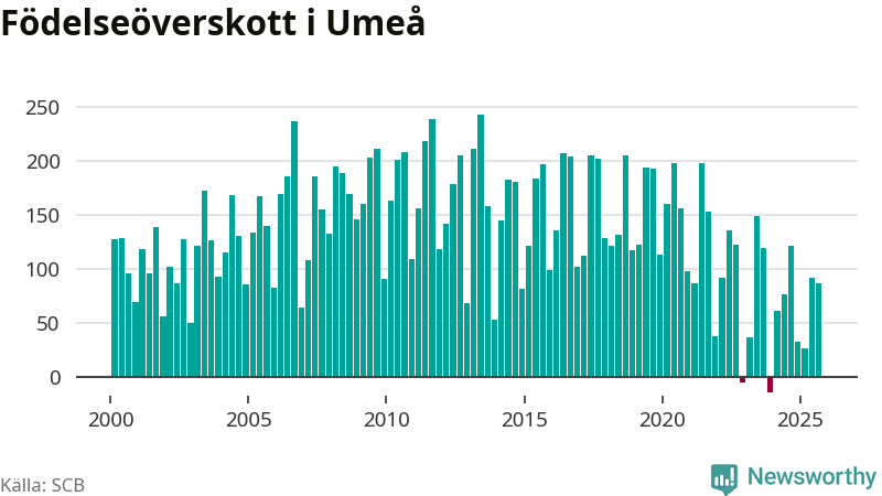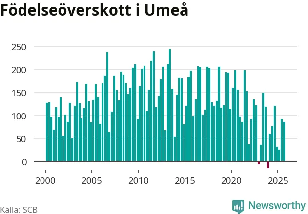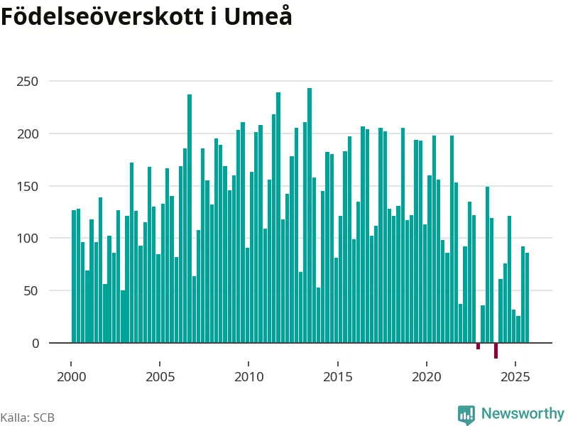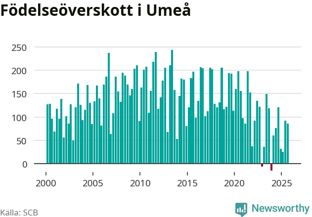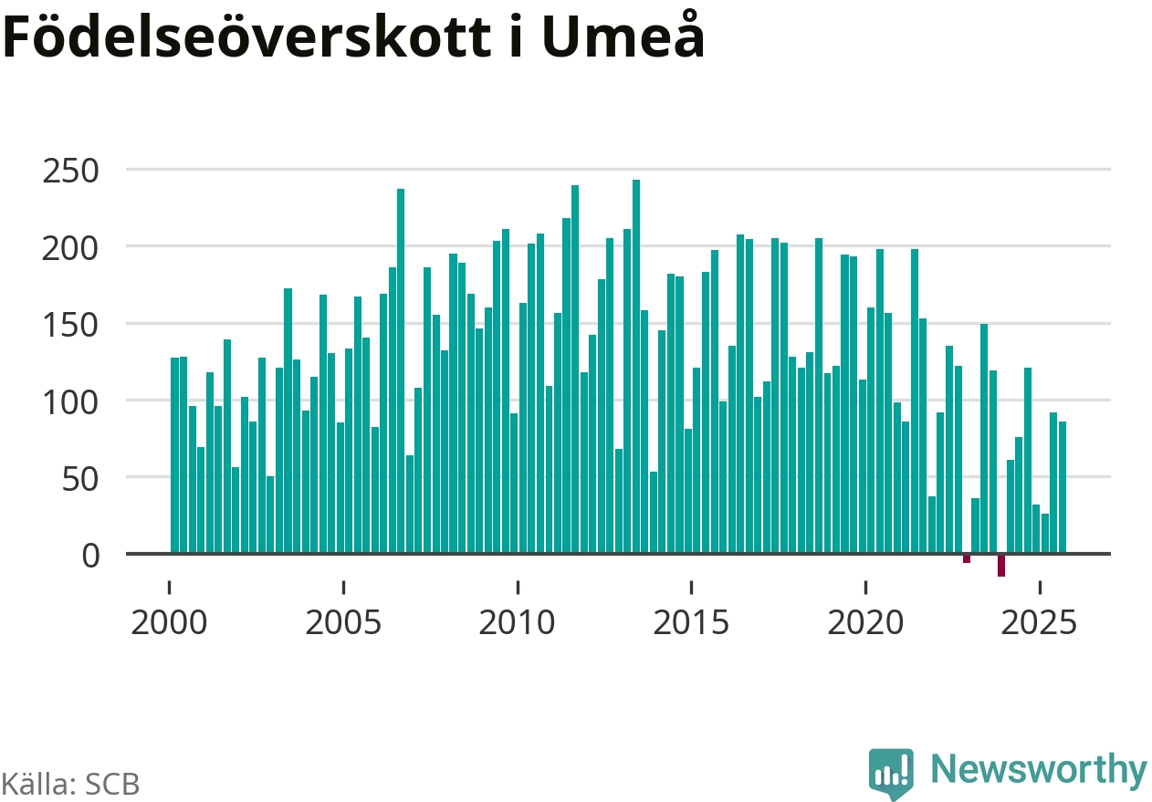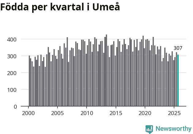 Enligt SCB:s siffror föddes 307 barn i Umeå under det senaste kvartalet. Samtidigt avled 221 personer. Umeå hade alltså ett positivt födelsenetto, vilket kommunen historiskt sett nästan alltid har haft.
