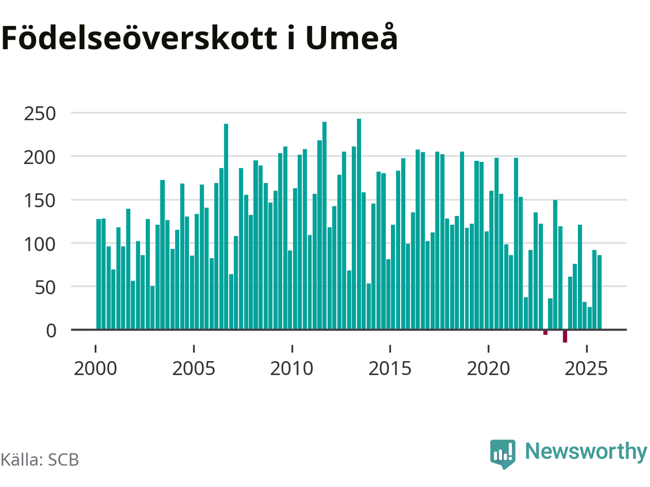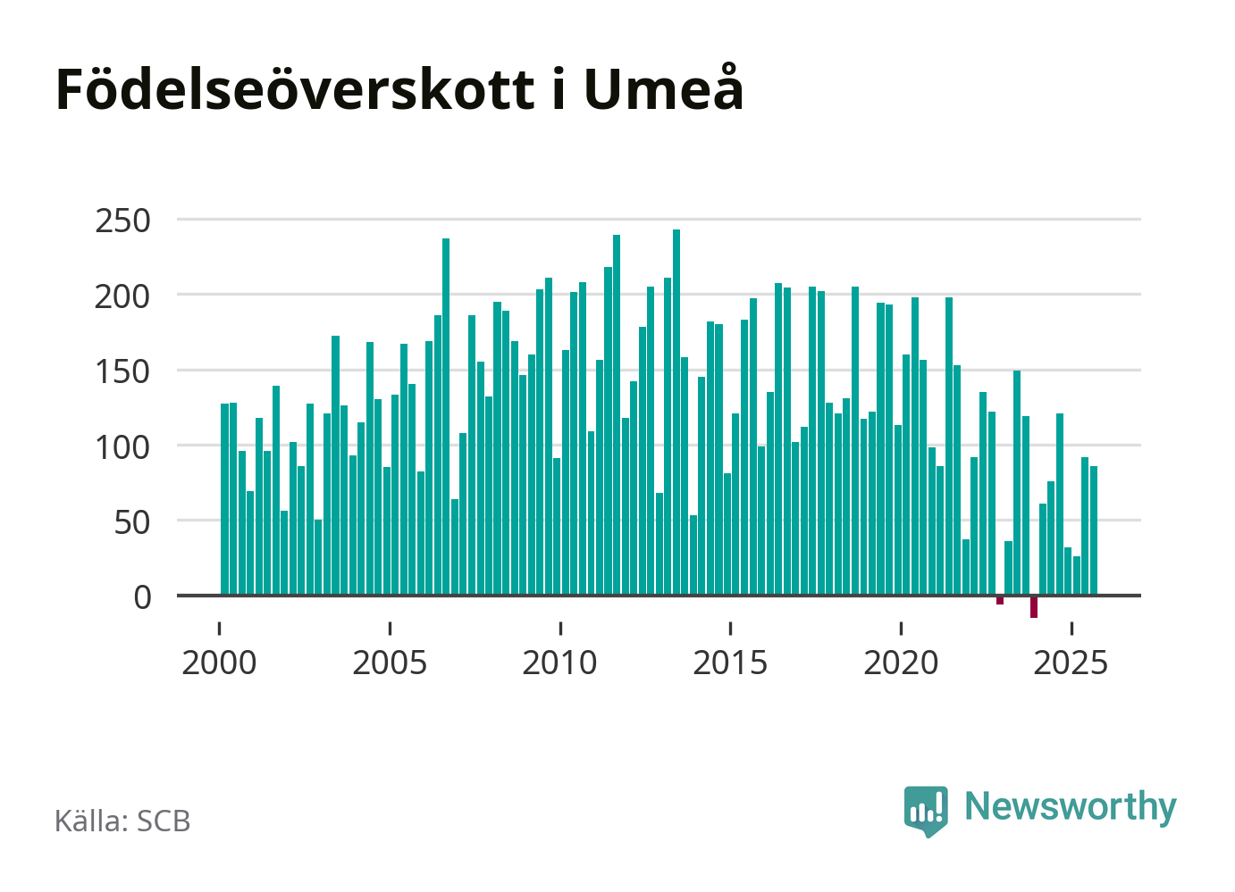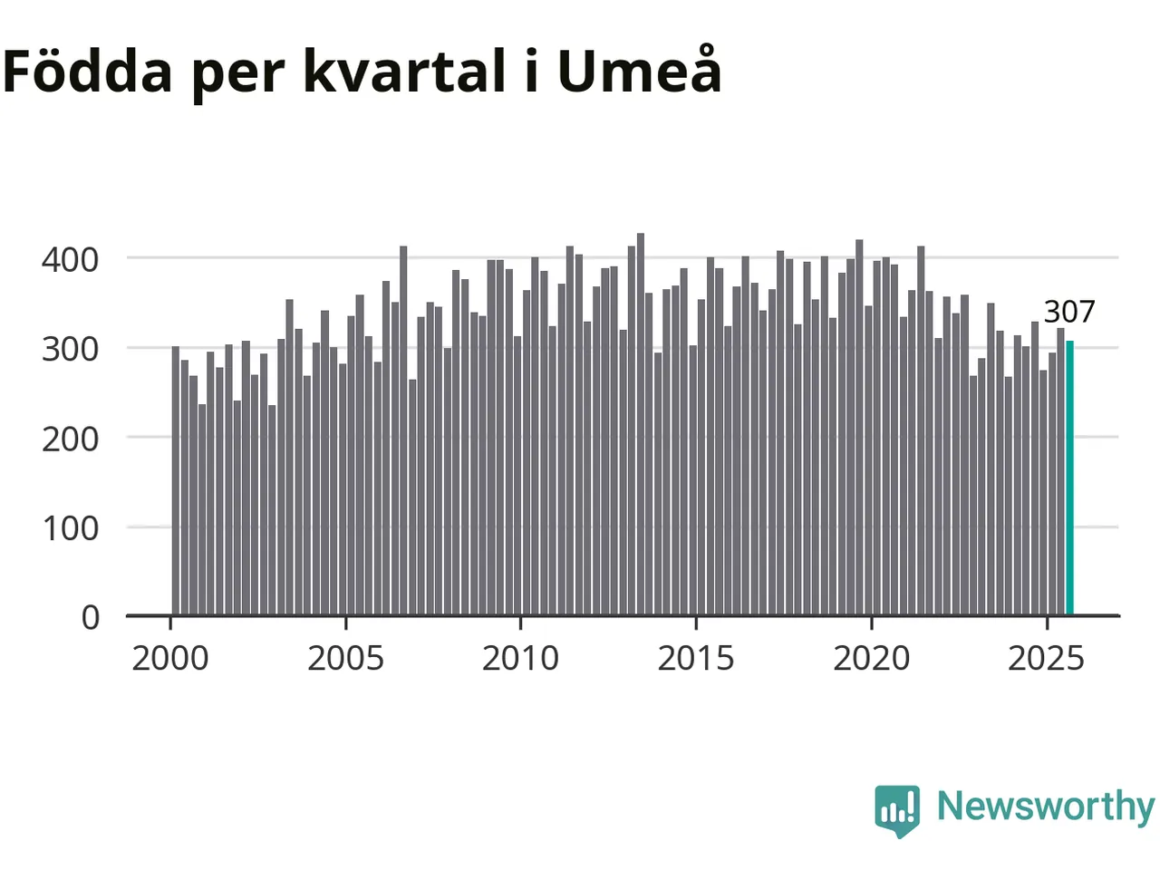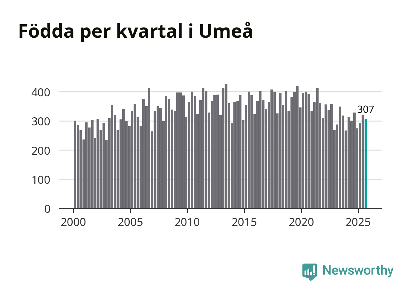 Enligt SCB:s siffror föddes 307 barn i Umeå under det senaste kvartalet. Samtidigt avled 221 personer. Umeå hade alltså ett positivt födelsenetto, vilket kommunen historiskt sett nästan alltid har haft.