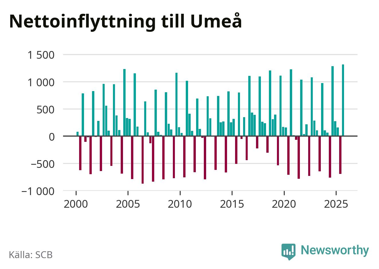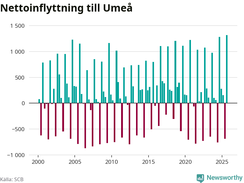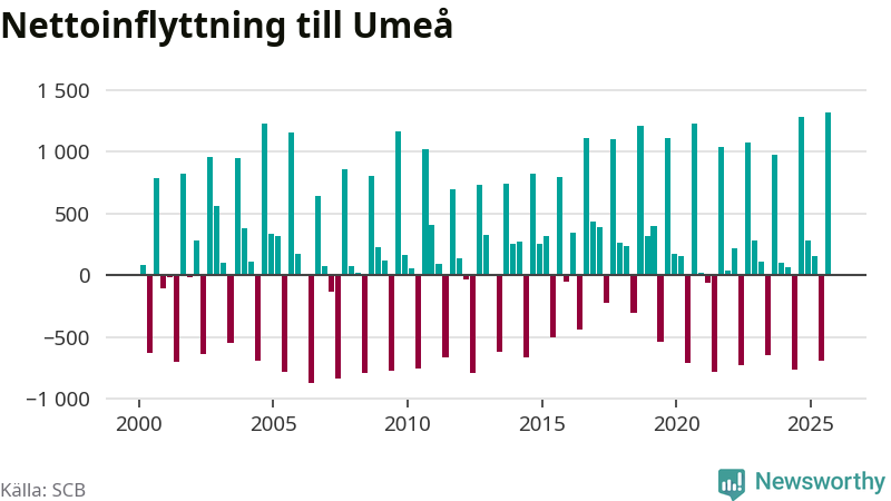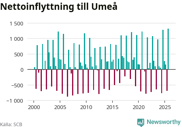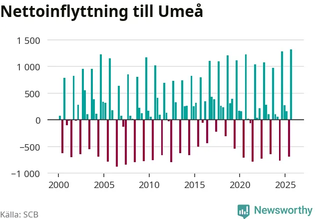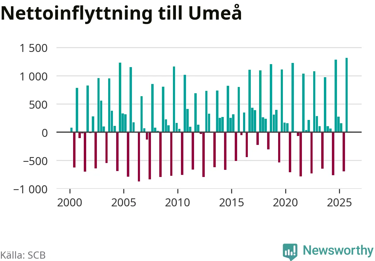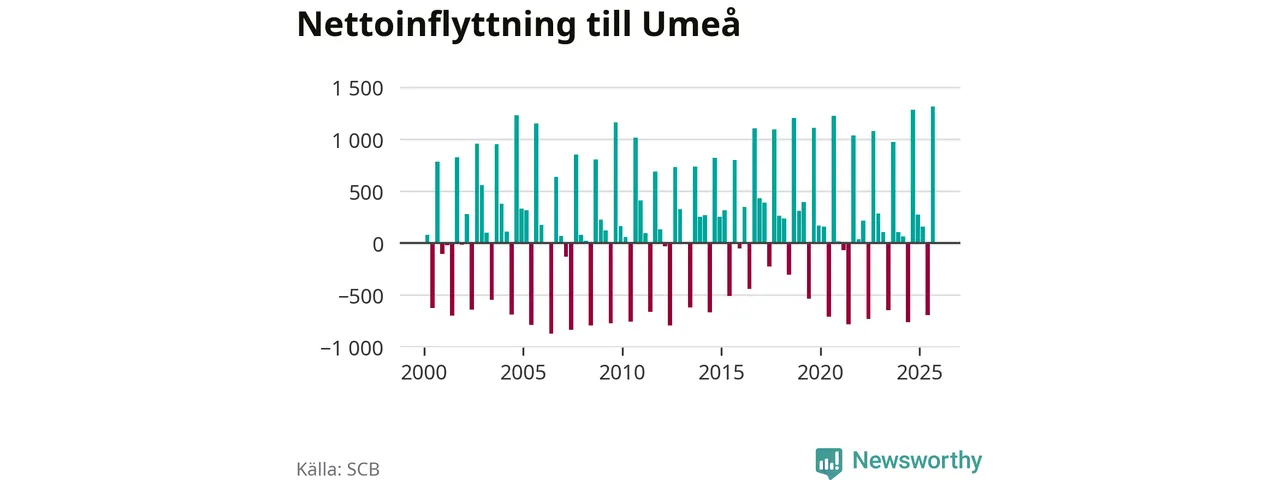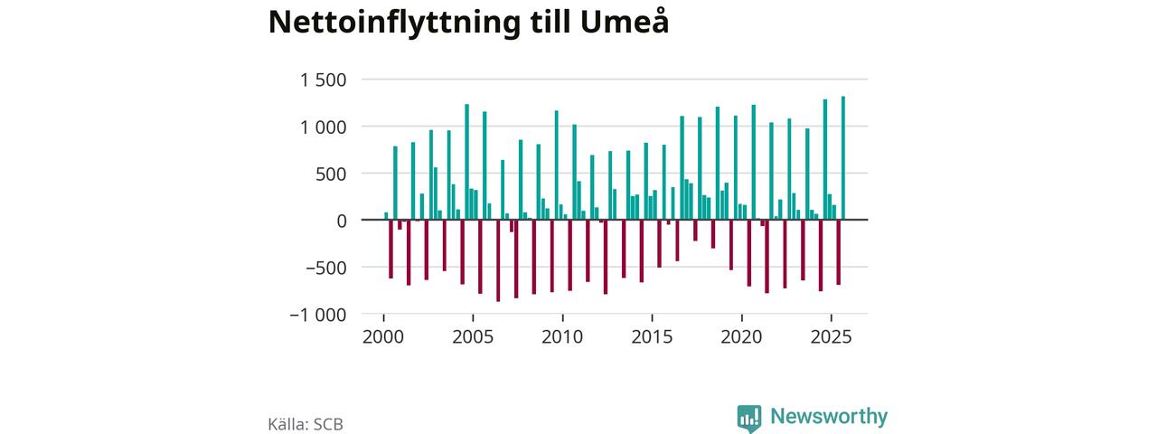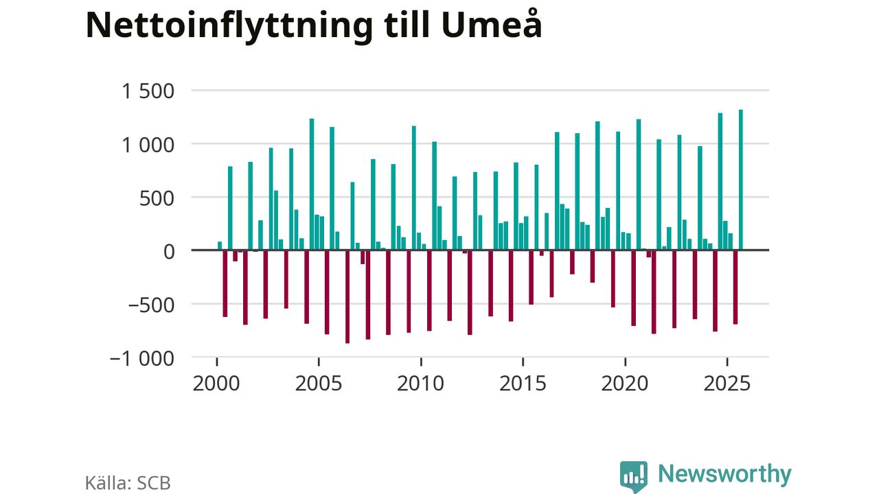 Under tredje kvartalet 2025 flyttade 3 530 personer till kommunen medan 2 214 personer flyttade därifrån. Så många har inte flyttat till Umeå under något kvartal under det här seklet – men samtidigt var utflyttningen relativt stor. Sedan seklets början har Umeå oftast haft ett positivt flyttnetto, och inget kvartal sedan millennieskiftet har nettoinflyttningen varit större än under det senaste.
