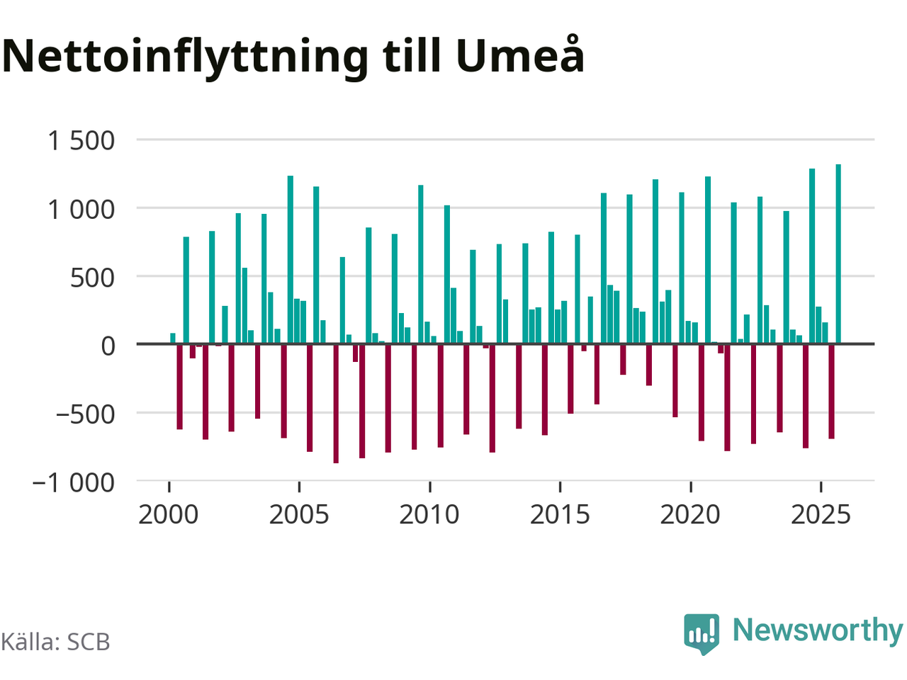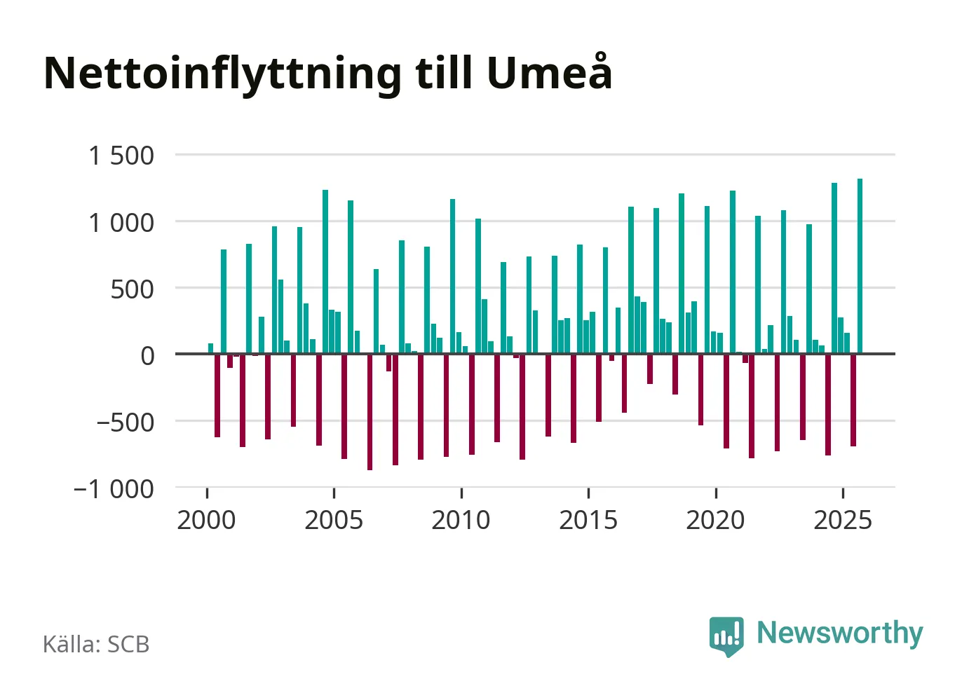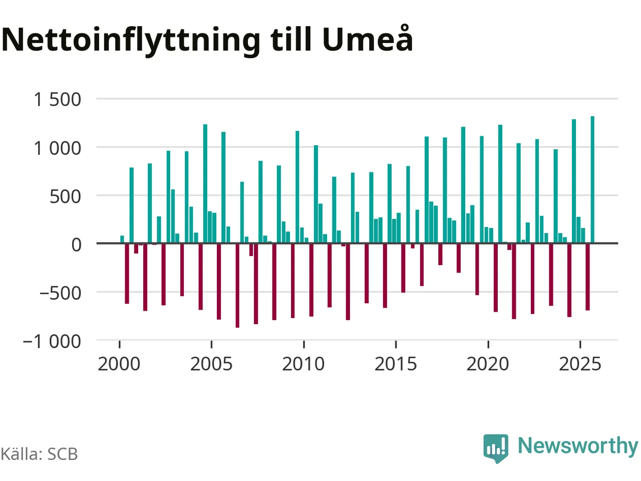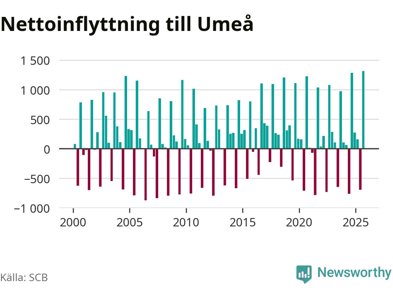 Under tredje kvartalet 2025 flyttade 3 530 personer till kommunen medan 2 214 personer flyttade därifrån. Så många har inte flyttat till Umeå under något kvartal under det här seklet – men samtidigt var utflyttningen relativt stor. Sedan seklets början har Umeå oftast haft ett positivt flyttnetto, och inget kvartal sedan millennieskiftet har nettoinflyttningen varit större än under det senaste.