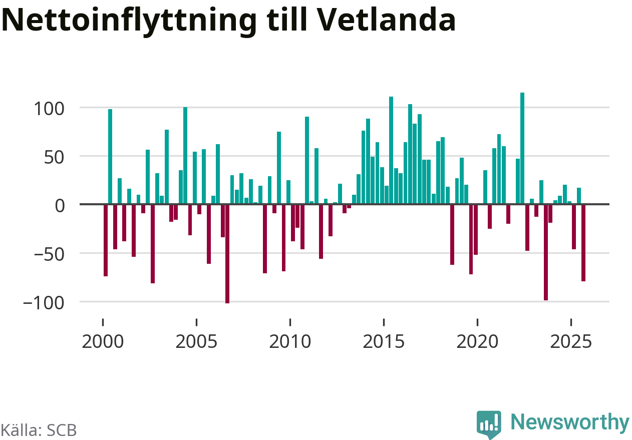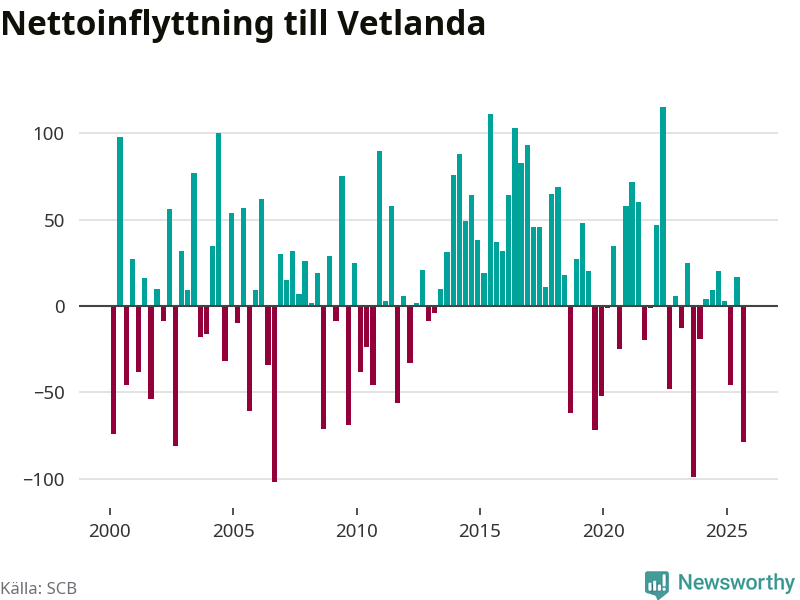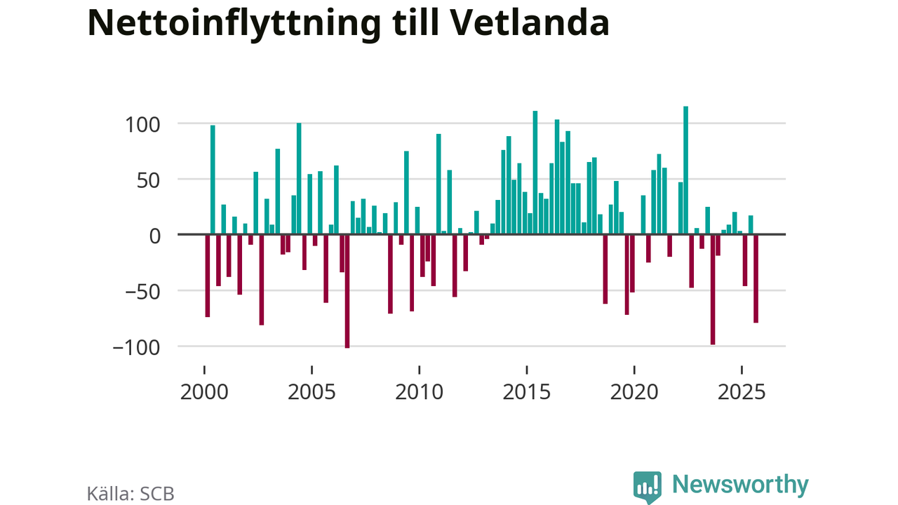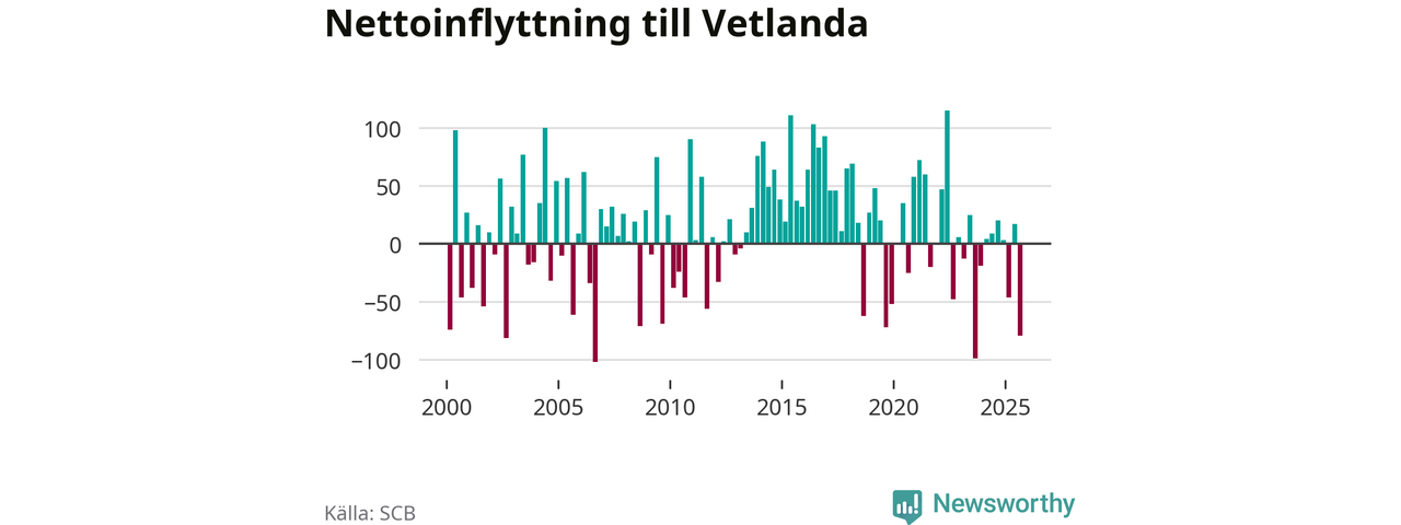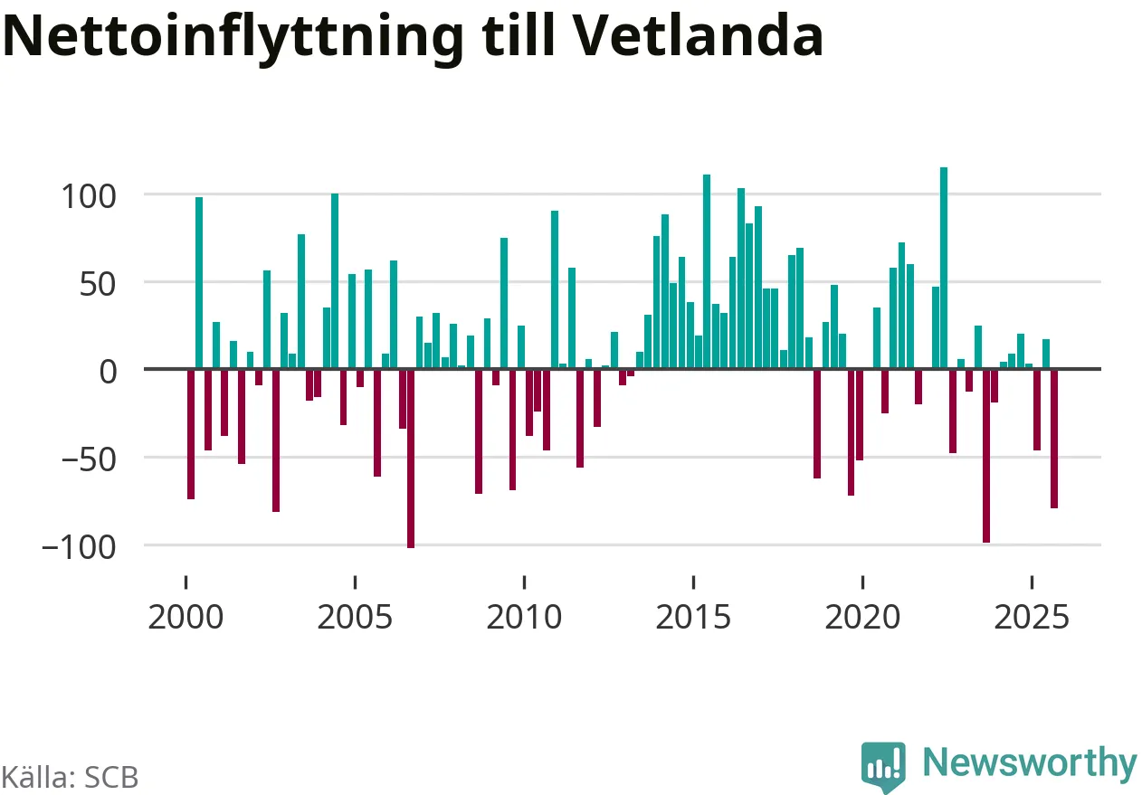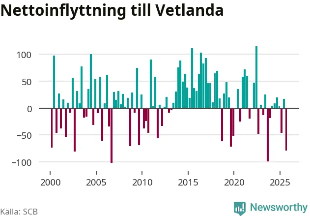Under tredje kvartalet 2025 flyttade 284 personer till kommunen medan 363 personer flyttade därifrån. Det är historiskt sett en stor utflyttning under ett kvartal. Sedan seklets början har Vetlanda oftast haft ett positivt flyttnetto.