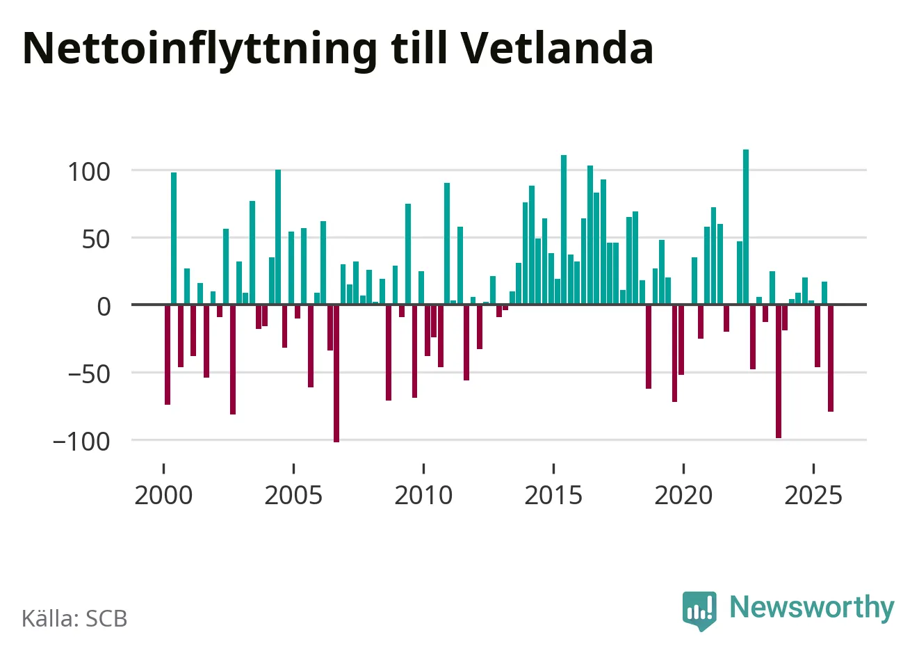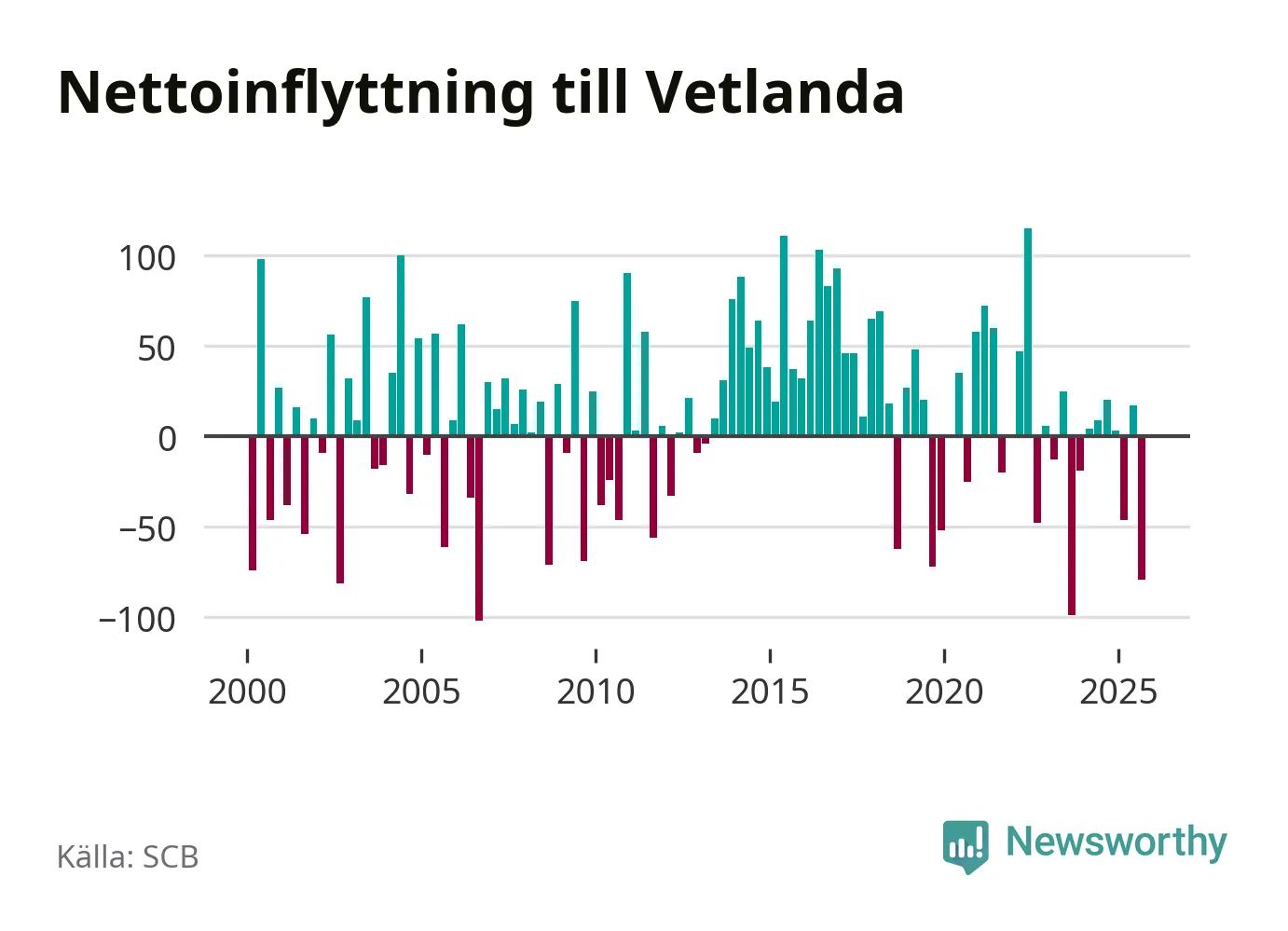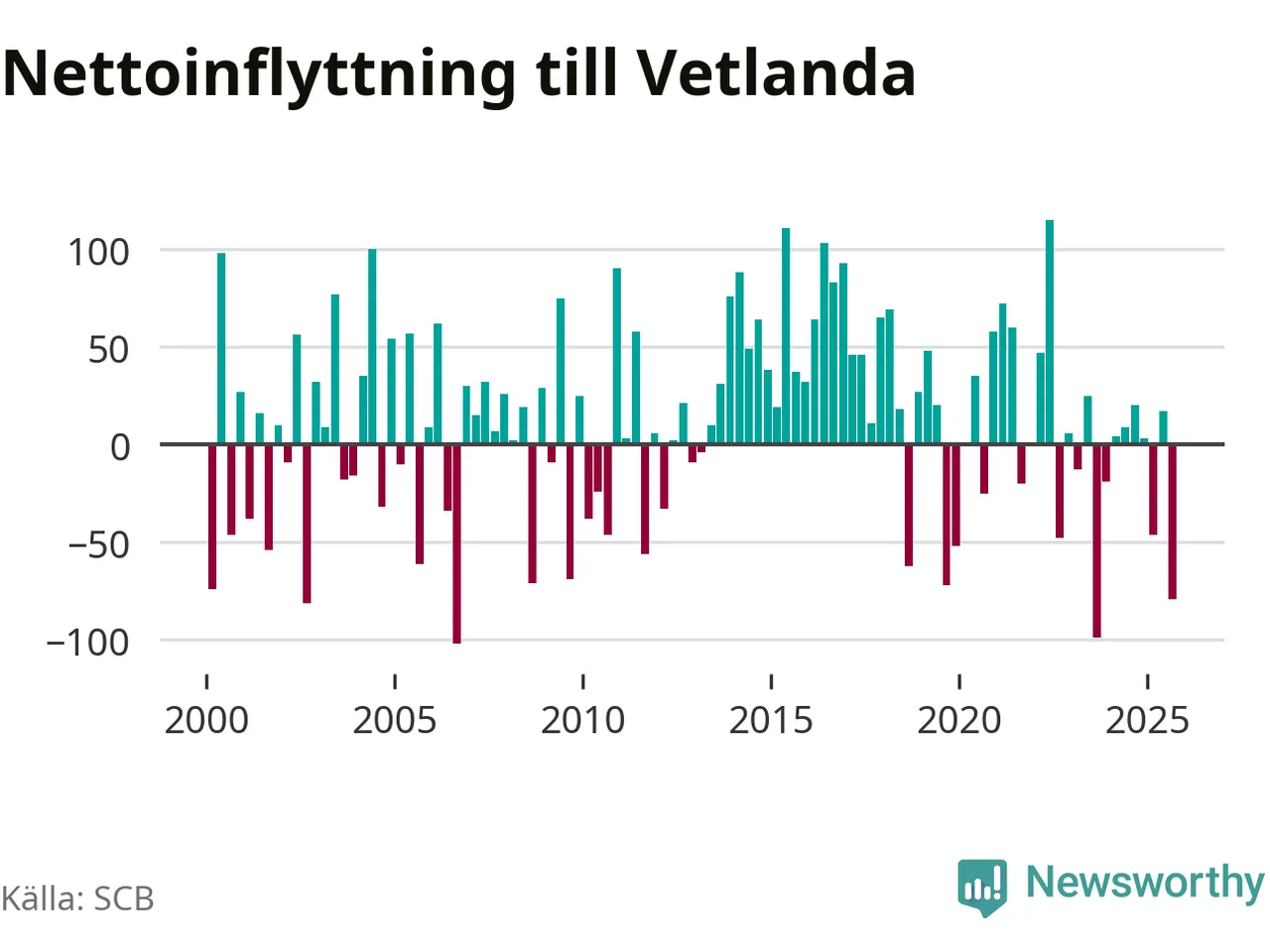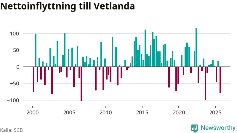Under tredje kvartalet 2025 flyttade 284 personer till kommunen medan 363 personer flyttade därifrån. Det är historiskt sett en stor utflyttning under ett kvartal. Sedan seklets början har Vetlanda oftast haft ett positivt flyttnetto.