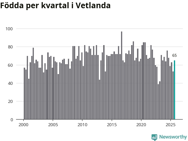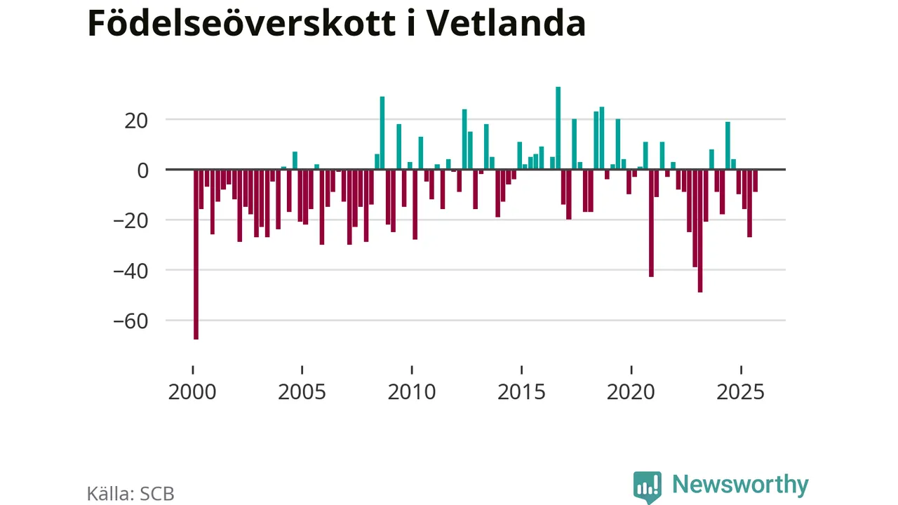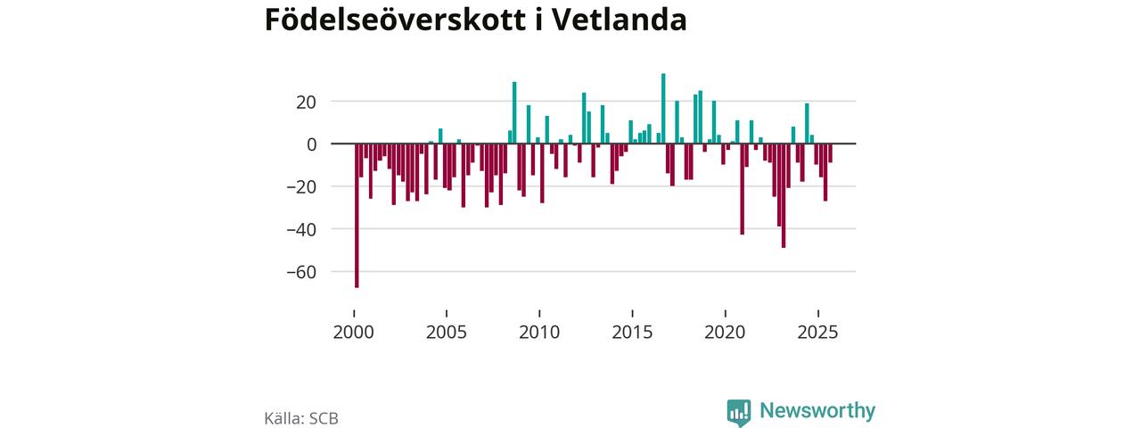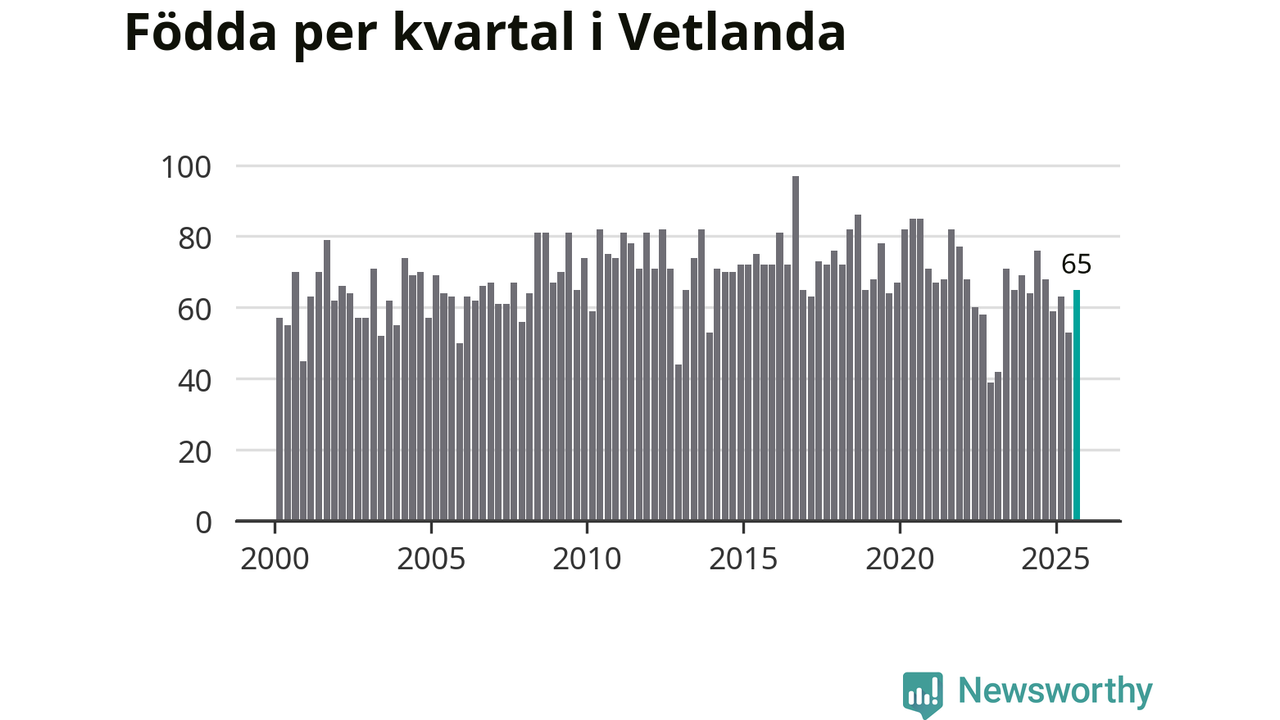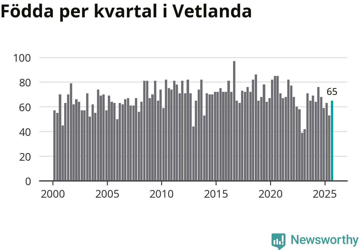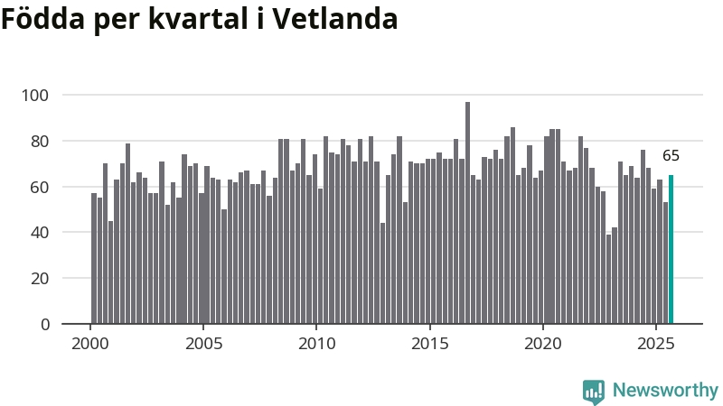 Enligt SCB:s siffror föddes 65 barn i Vetlanda under det senaste kvartalet. Samtidigt avled 74 personer. Skillnaden mellan antal födda och döda är så liten att det inte går att säga om det beror på något annat än SCB:s röjandeskydd. Kommunen har historiskt sett haft ungefär lika många kvartal med positivt födelsenetto som negativt.