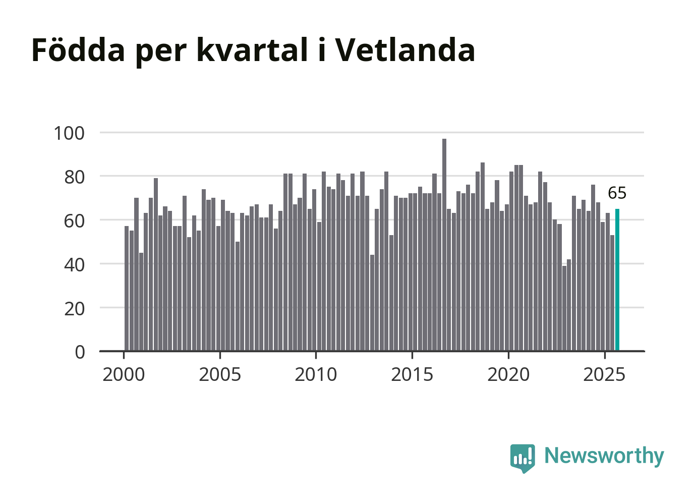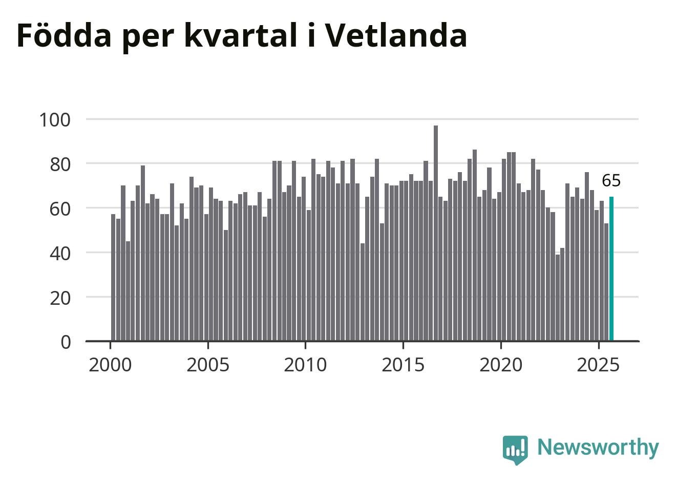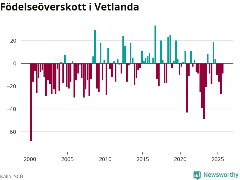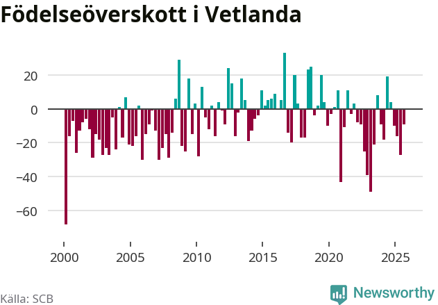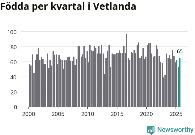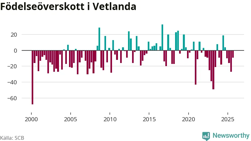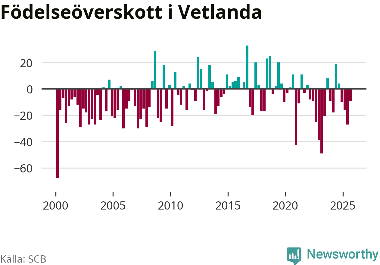 Enligt SCB:s siffror föddes 65 barn i Vetlanda under det senaste kvartalet. Samtidigt avled 74 personer. Skillnaden mellan antal födda och döda är så liten att det inte går att säga om det beror på något annat än SCB:s röjandeskydd. Kommunen har historiskt sett haft ungefär lika många kvartal med positivt födelsenetto som negativt.