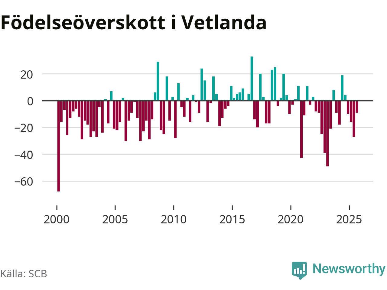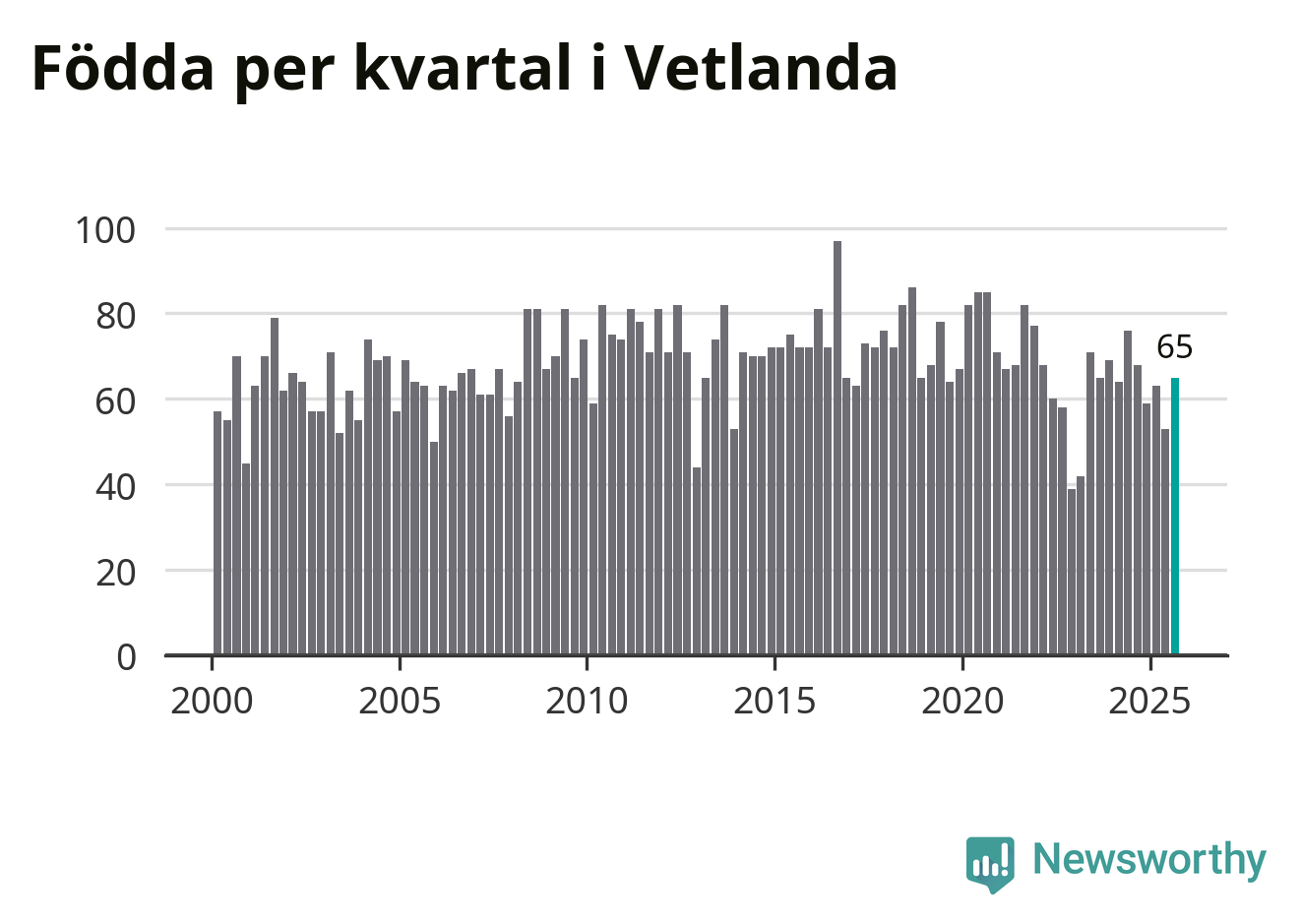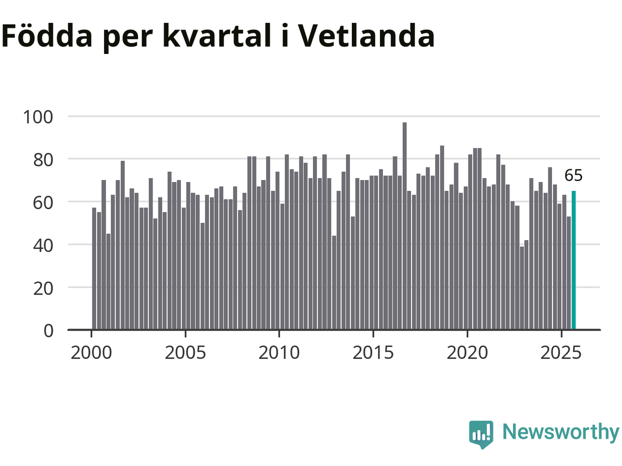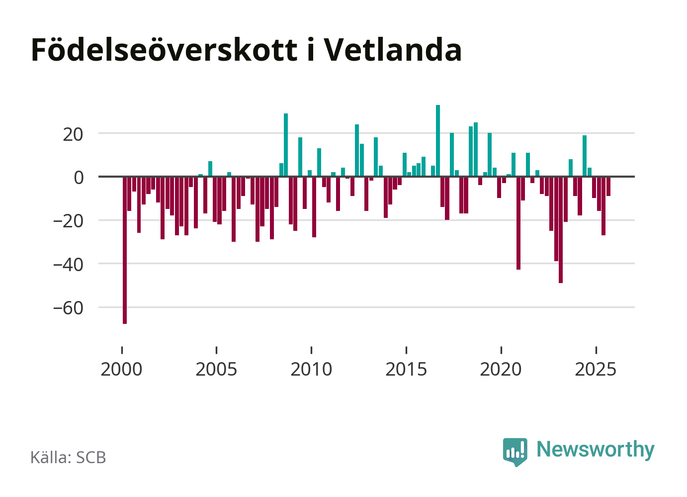 Enligt SCB:s siffror föddes 65 barn i Vetlanda under det senaste kvartalet. Samtidigt avled 74 personer. Skillnaden mellan antal födda och döda är så liten att det inte går att säga om det beror på något annat än SCB:s röjandeskydd. Kommunen har historiskt sett haft ungefär lika många kvartal med positivt födelsenetto som negativt.