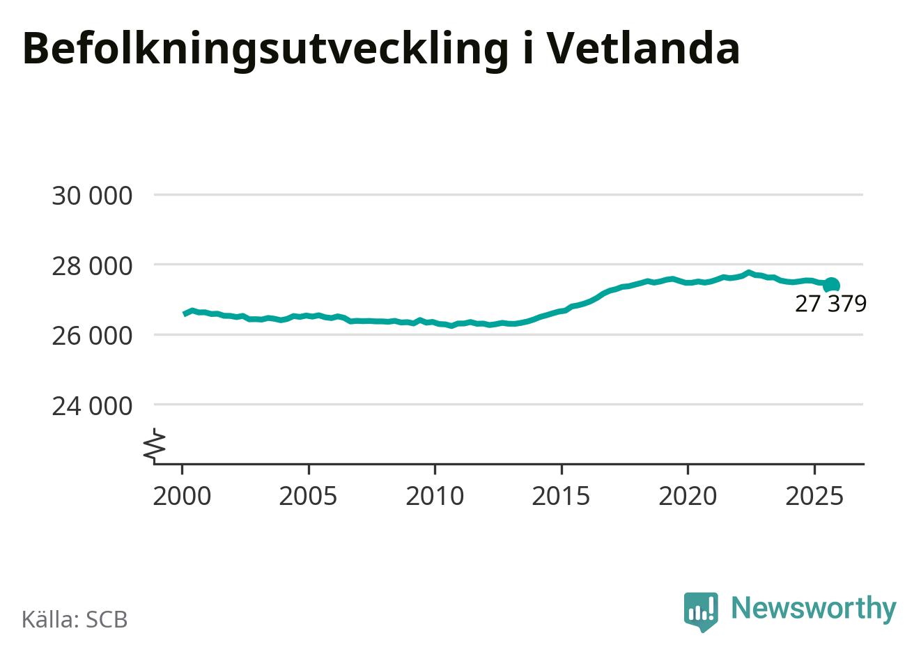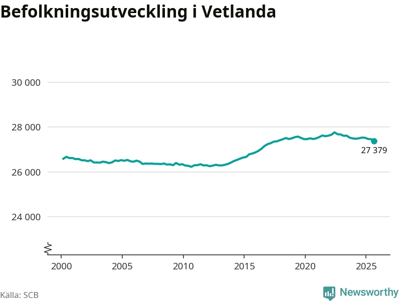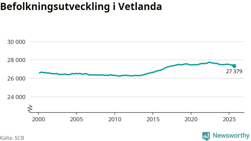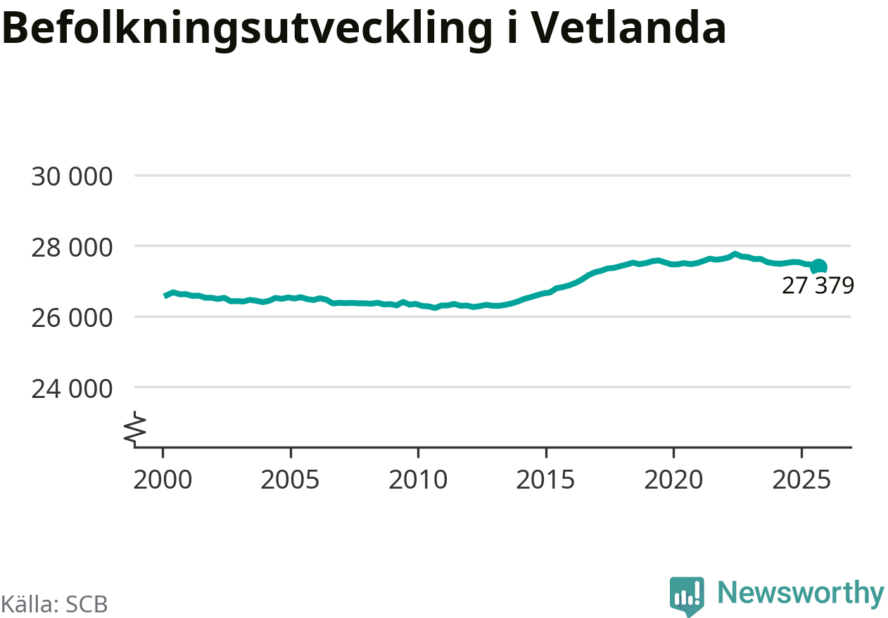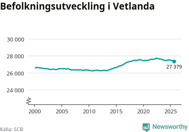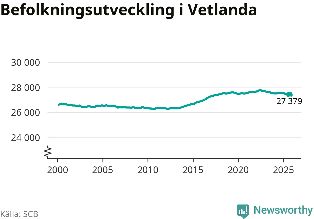 Befolkningen minskade i Vetlanda kommun under det tredje kvartalet 2025. Den 30 september bodde enligt SCB:s senaste siffror 27 379 personer i kommunen, vilket är 83 färre än i slutet av andra kvartalet.