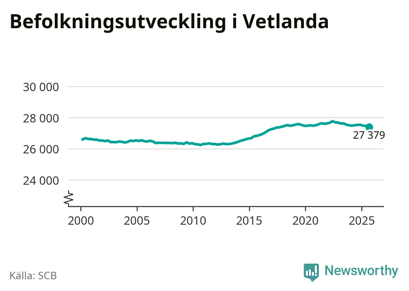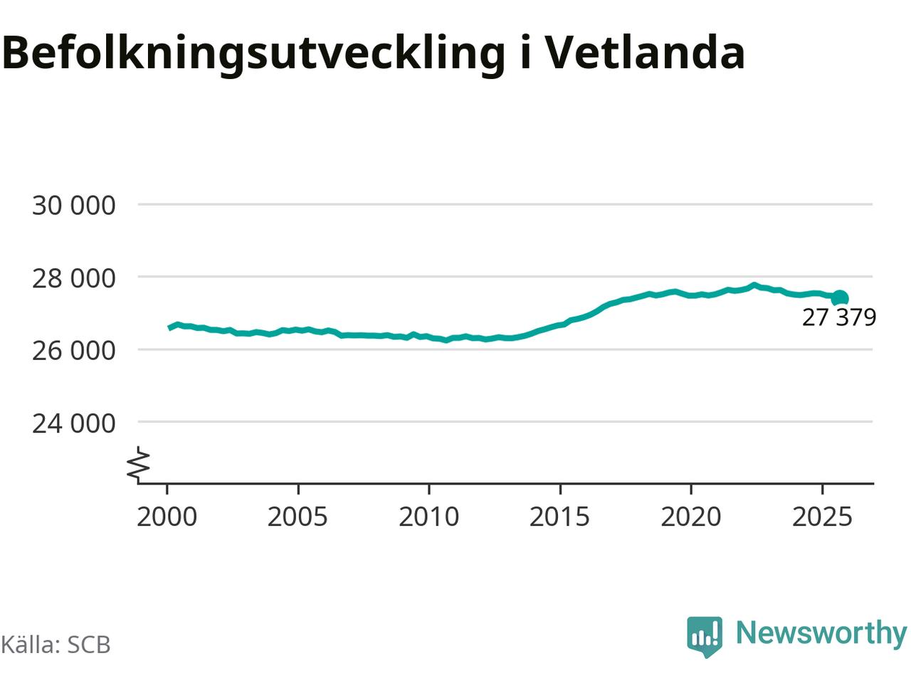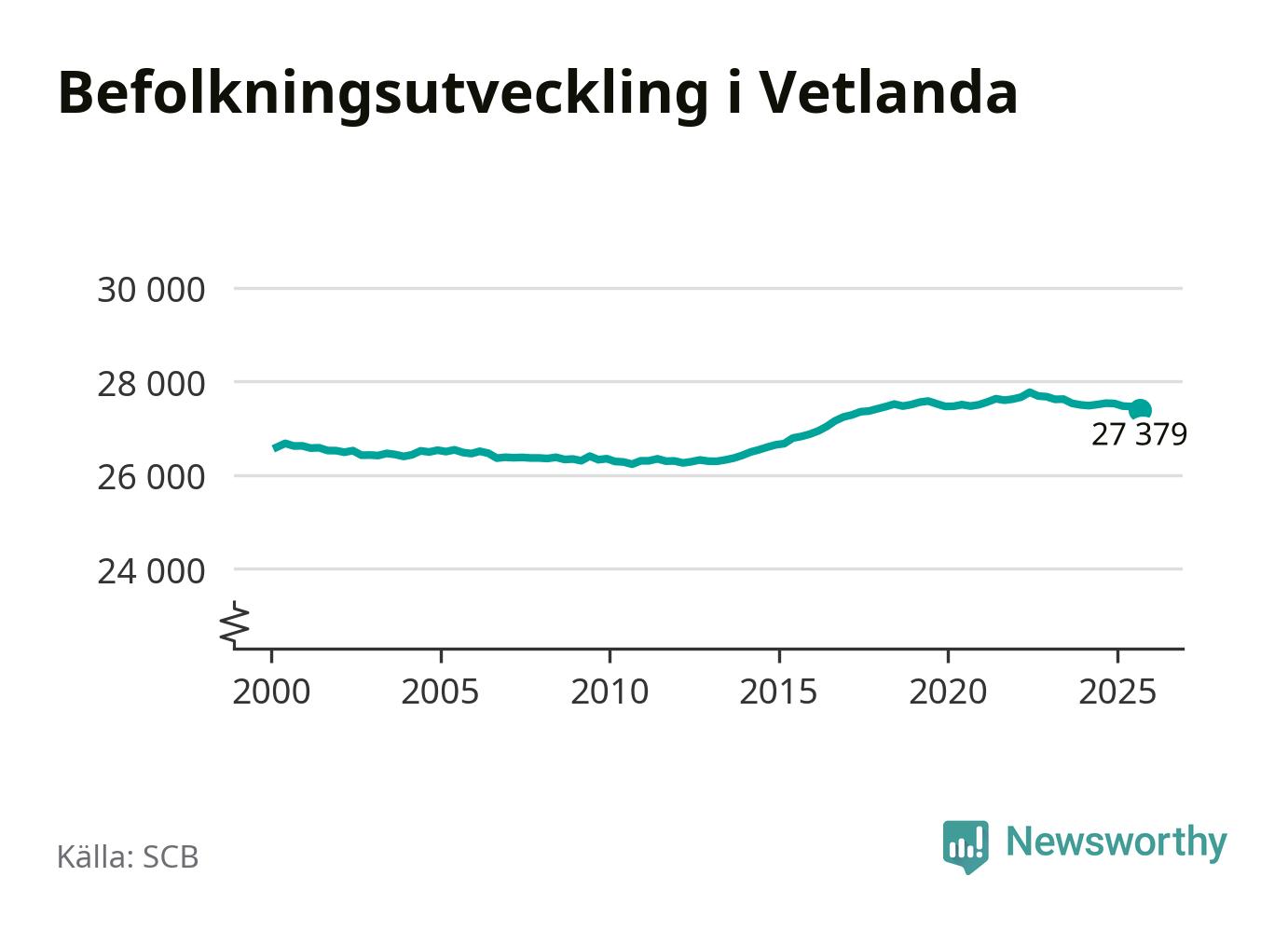 Jämfört med för ett år sedan har befolkningen i Vetlanda minskat med knappt 160 personer – vilket motsvarar en nedgång på 0,6 procent. Sedan millennieskiftet har folkmängden ökat med runt 790 personer, eller 3 procent.