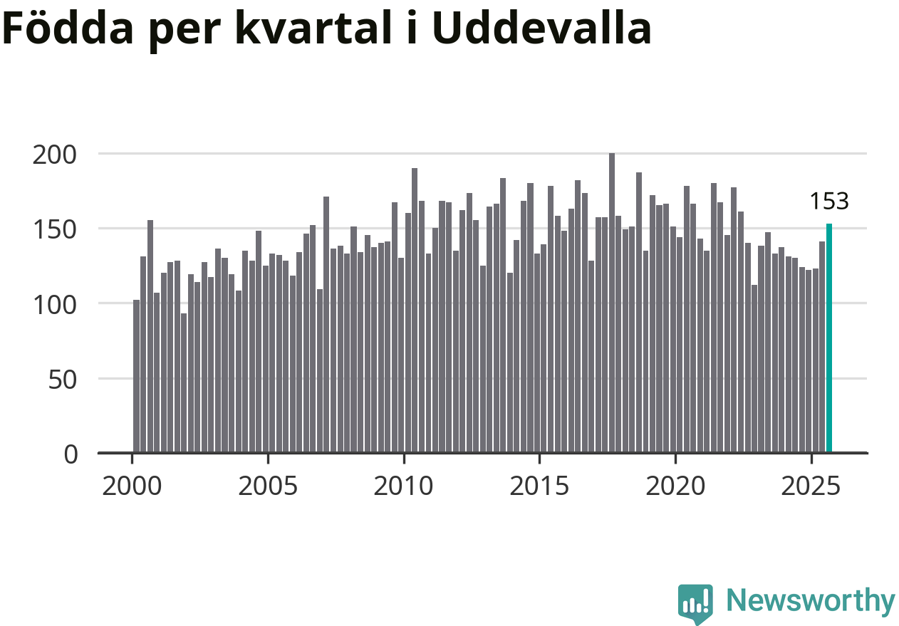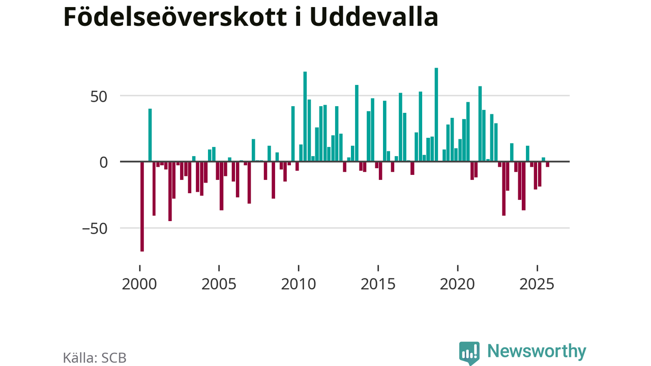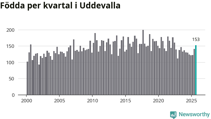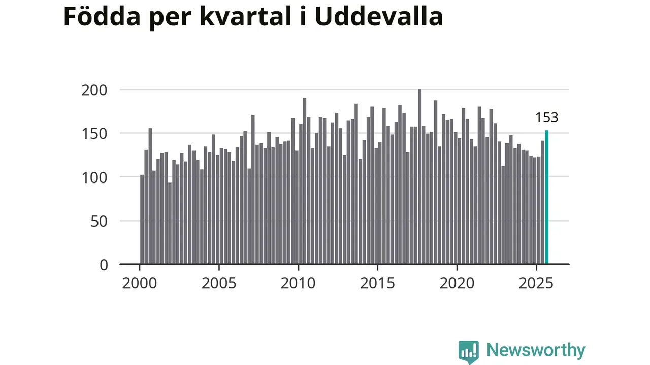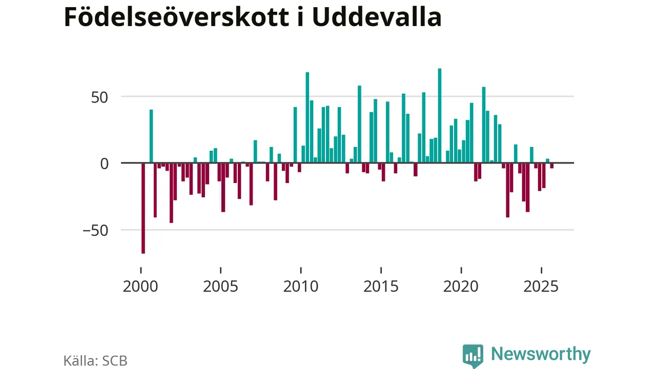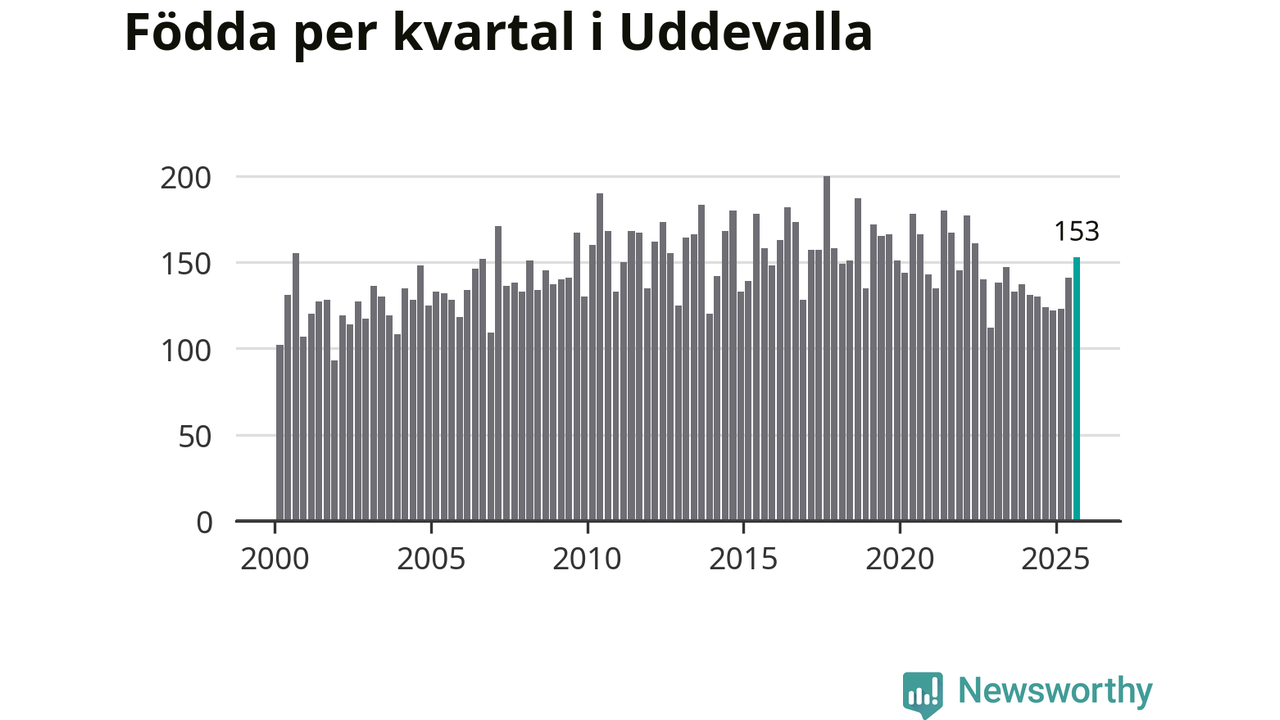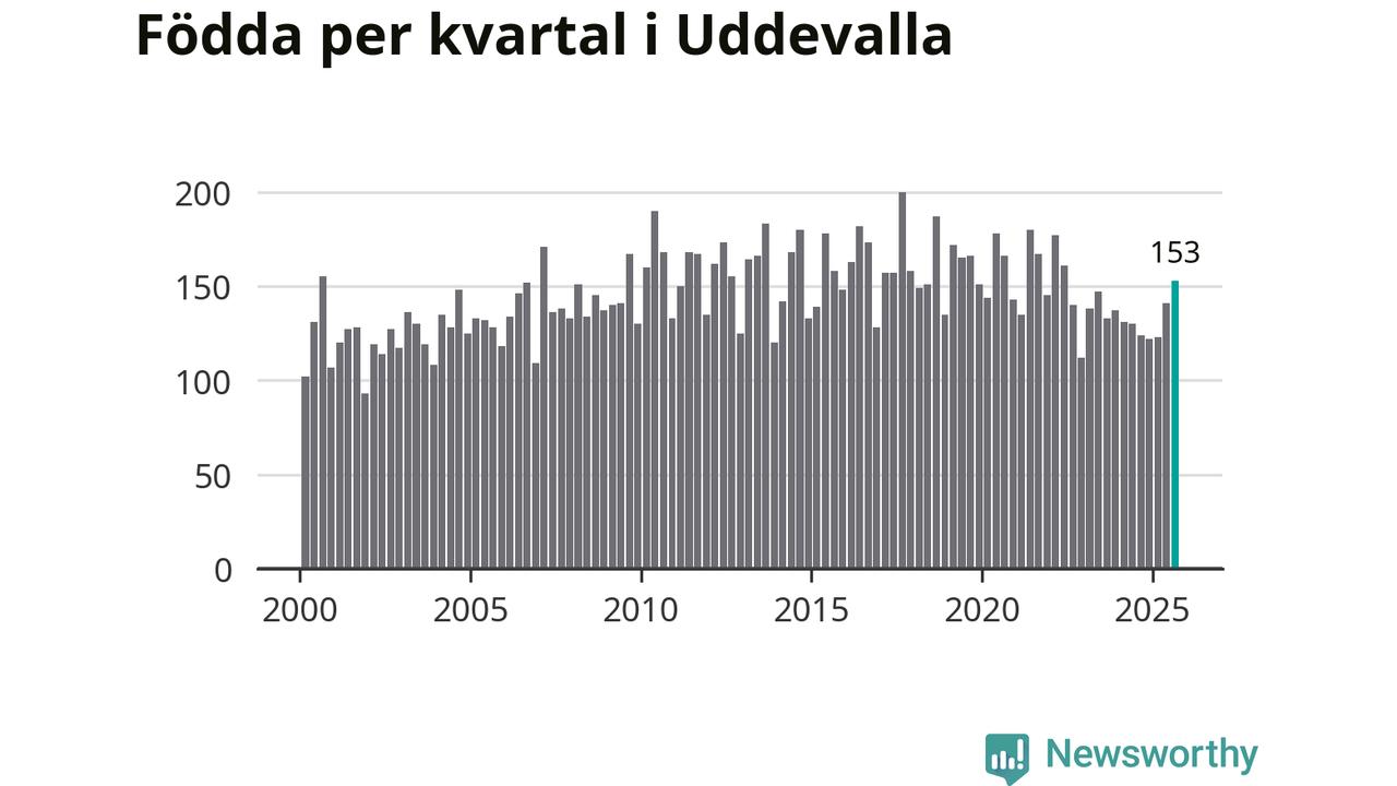 Enligt SCB:s siffror föddes 153 barn i Uddevalla under det senaste kvartalet. Samtidigt avled 157 personer. Skillnaden mellan antal födda och döda är så liten att det inte går att säga om det beror på något annat än SCB:s röjandeskydd. Kommunen har oftast haft positivt födelsenetto tidigare.