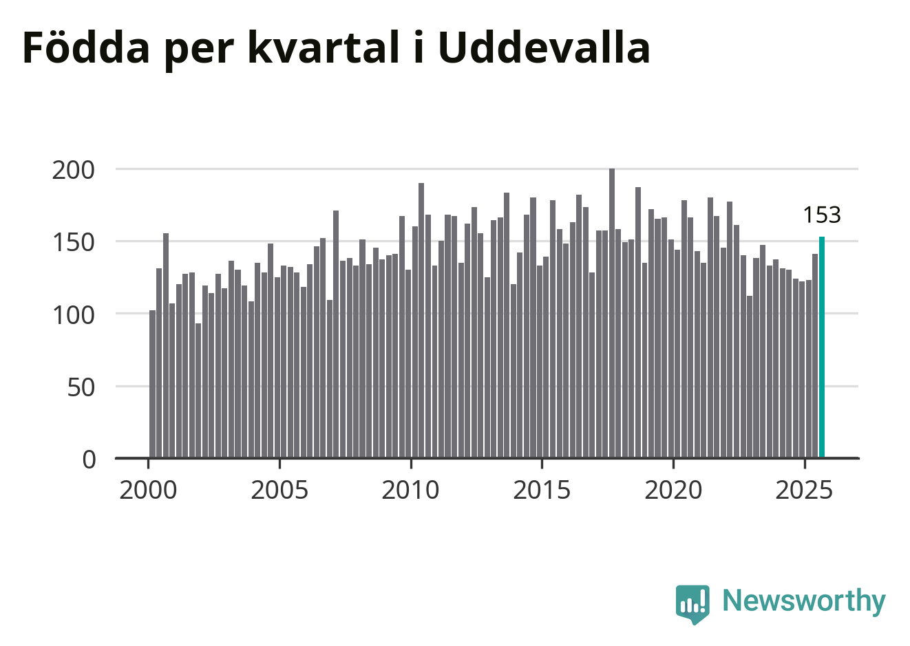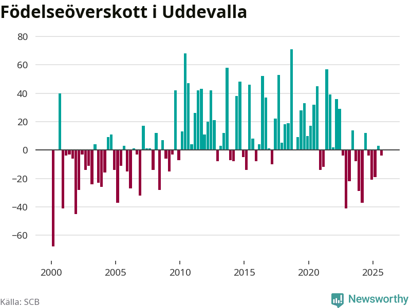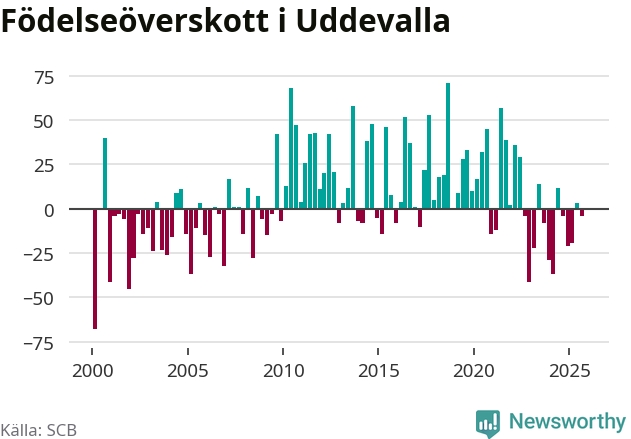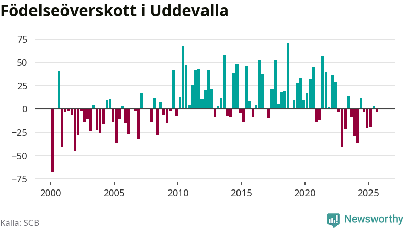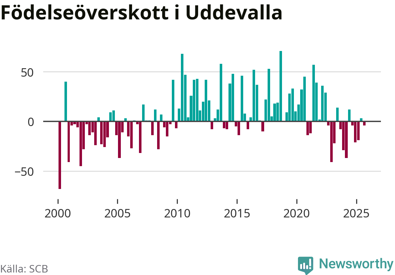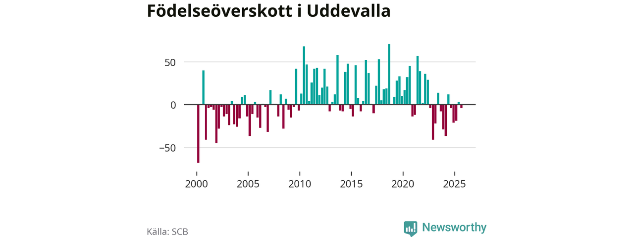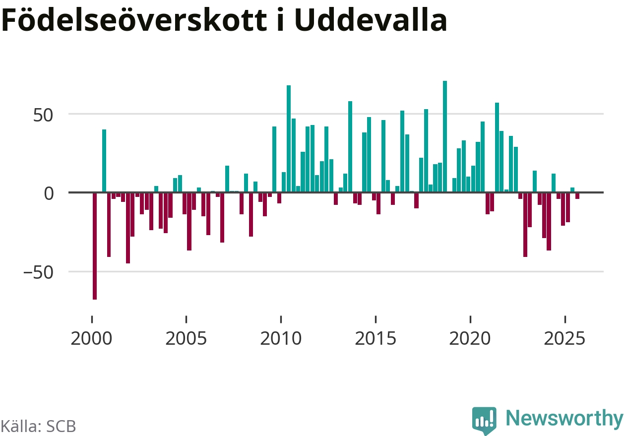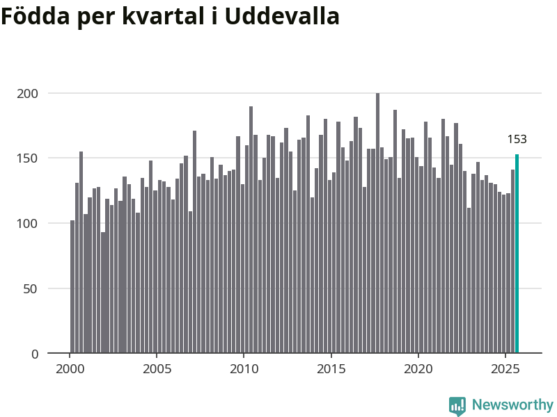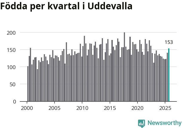Enligt SCB:s siffror föddes 153 barn i Uddevalla under det senaste kvartalet. Samtidigt avled 157 personer. Skillnaden mellan antal födda och döda är så liten att det inte går att säga om det beror på något annat än SCB:s röjandeskydd. Kommunen har oftast haft positivt födelsenetto tidigare.