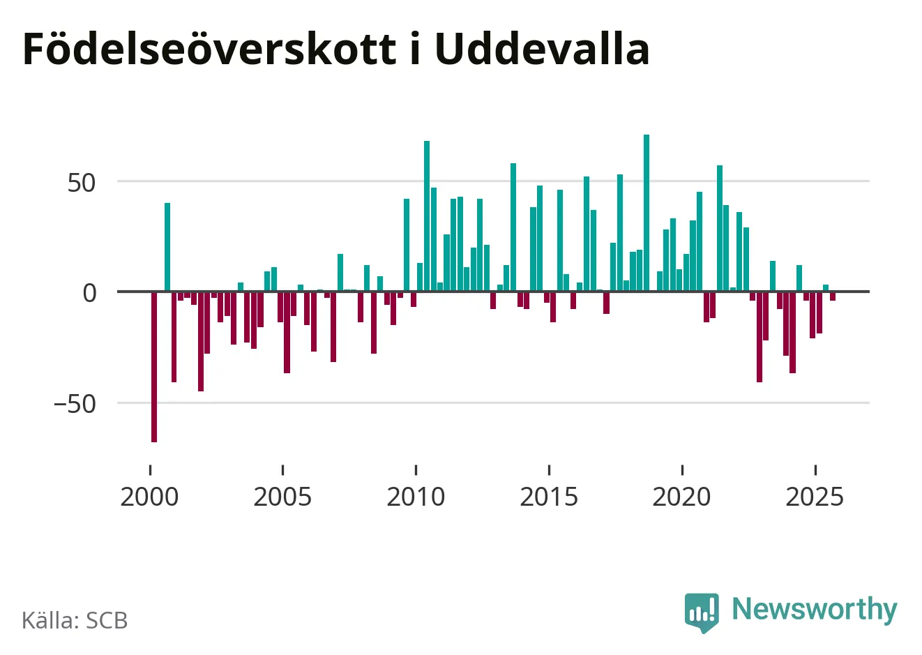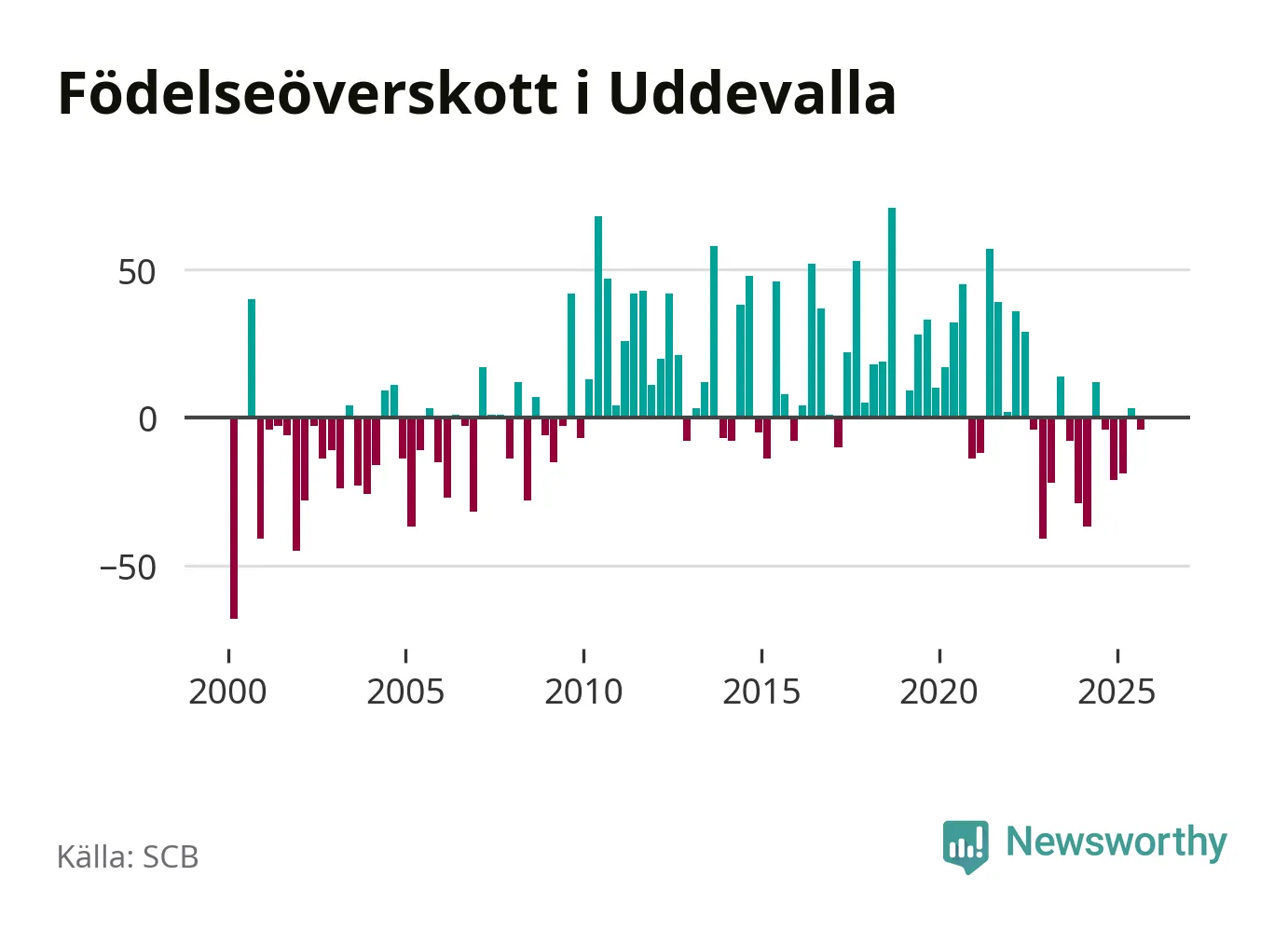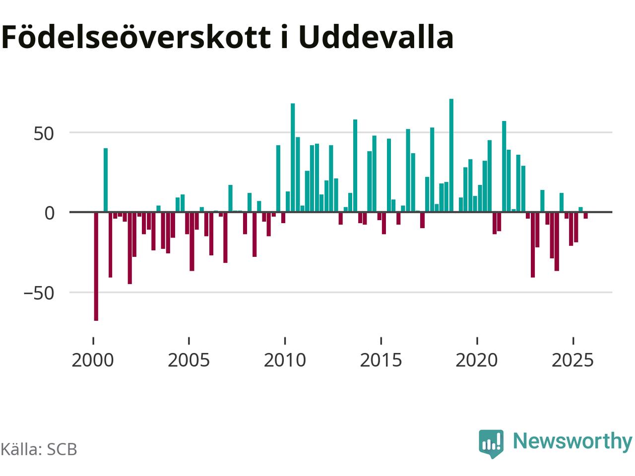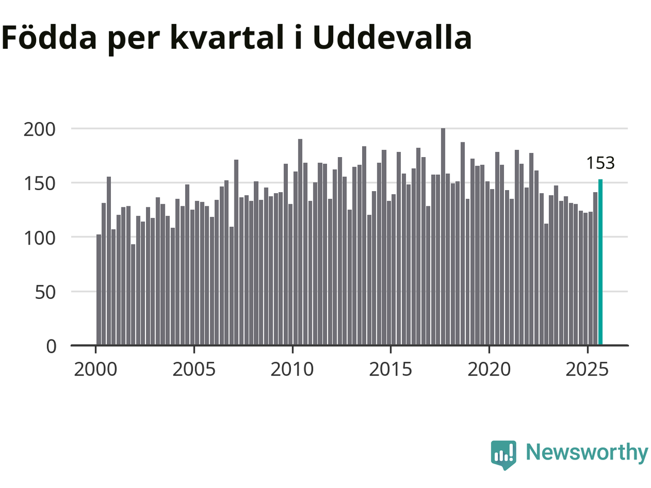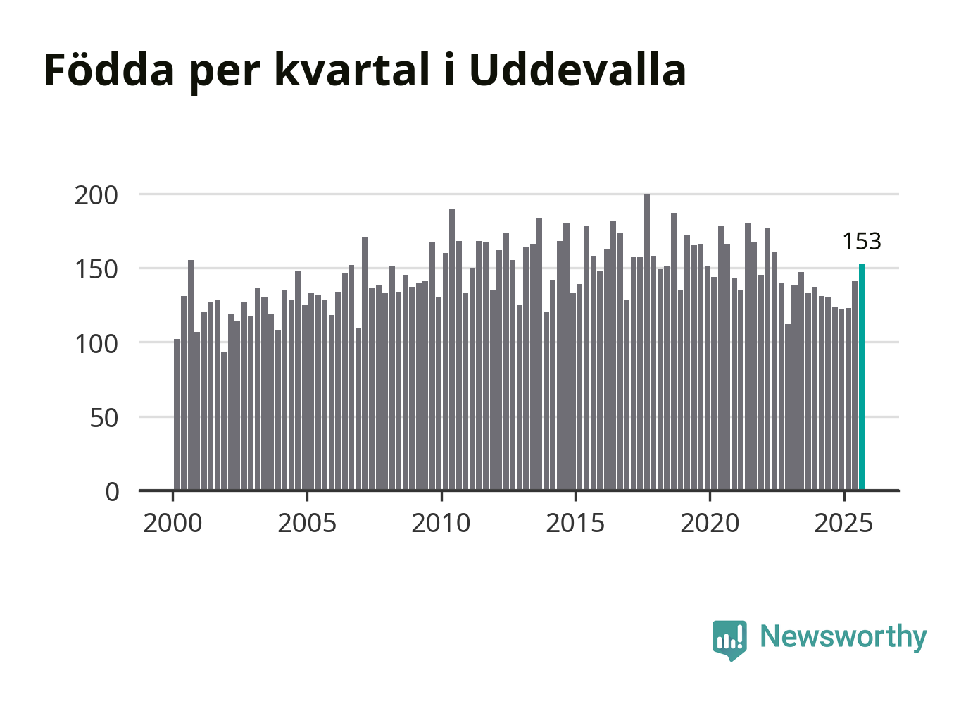 Enligt SCB:s siffror föddes 153 barn i Uddevalla under det senaste kvartalet. Samtidigt avled 157 personer. Skillnaden mellan antal födda och döda är så liten att det inte går att säga om det beror på något annat än SCB:s röjandeskydd. Kommunen har oftast haft positivt födelsenetto tidigare.