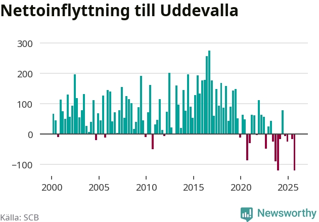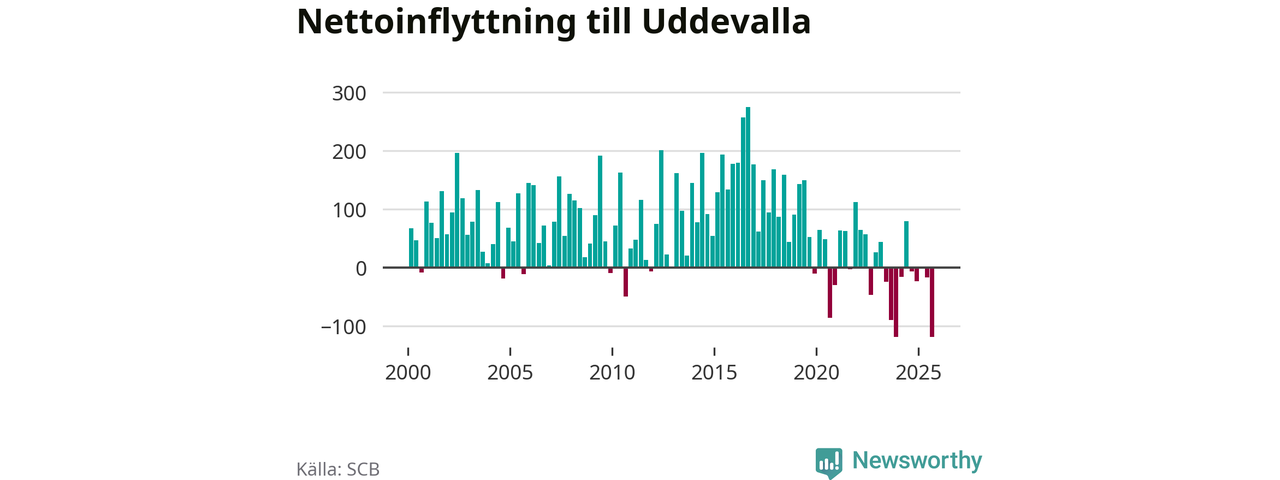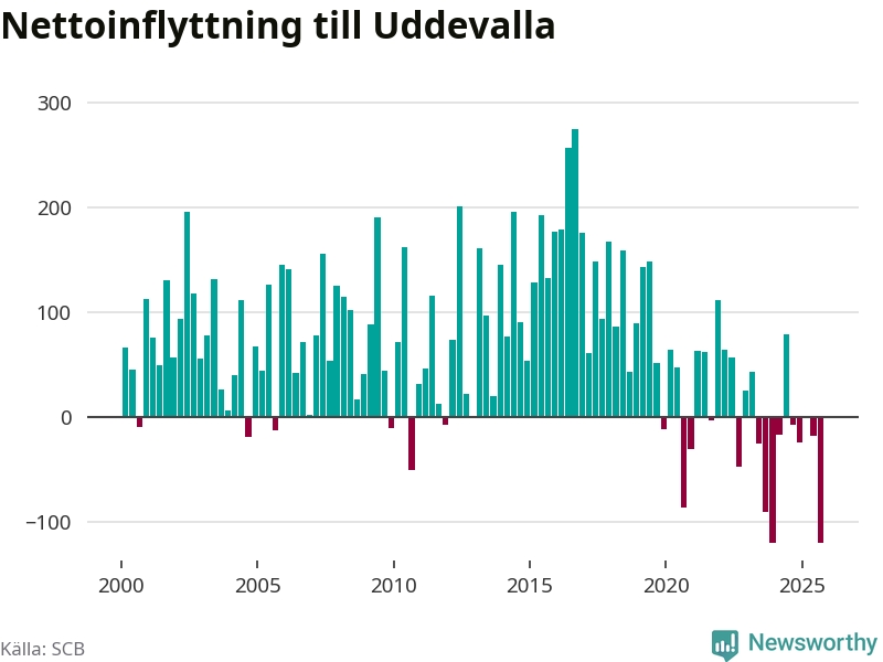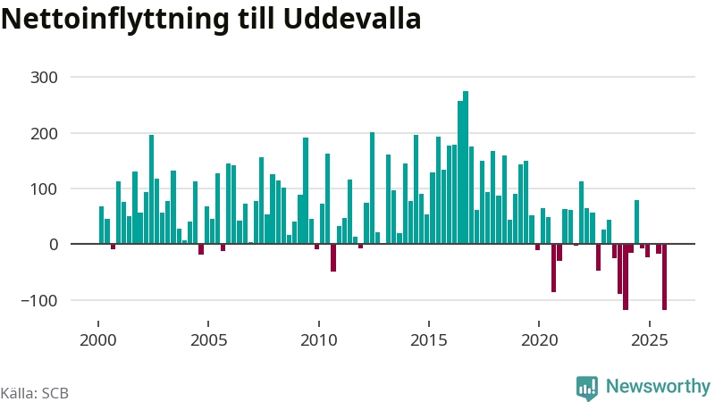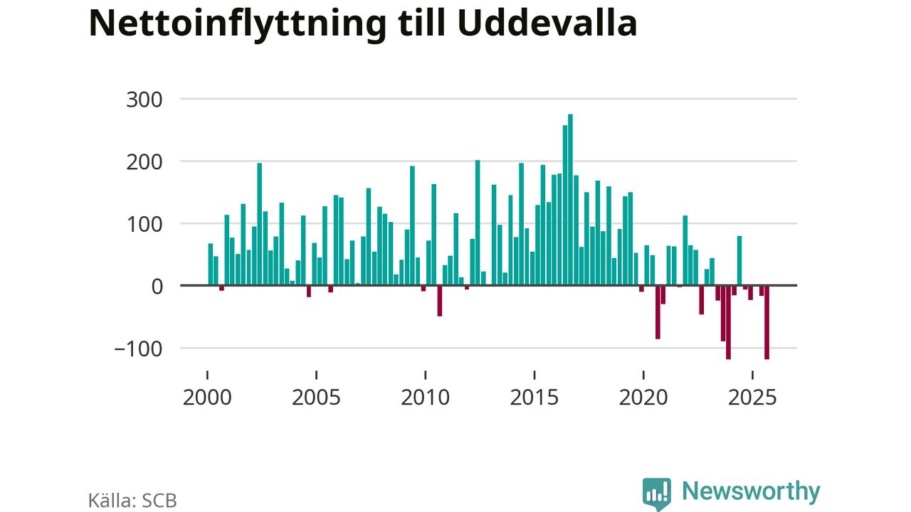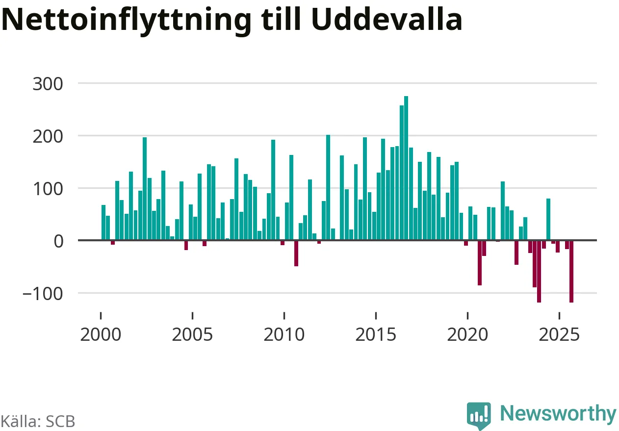Under tredje kvartalet 2025 flyttade 749 personer till kommunen medan 868 personer flyttade därifrån. Så många har inte flyttat från Uddevalla under något kvartal under det här seklet. Det ger den största nettoutflyttningen under ett kvartal sedan åtminstone år 2000. Sedan seklets början har Uddevalla oftast haft ett positivt flyttnetto.