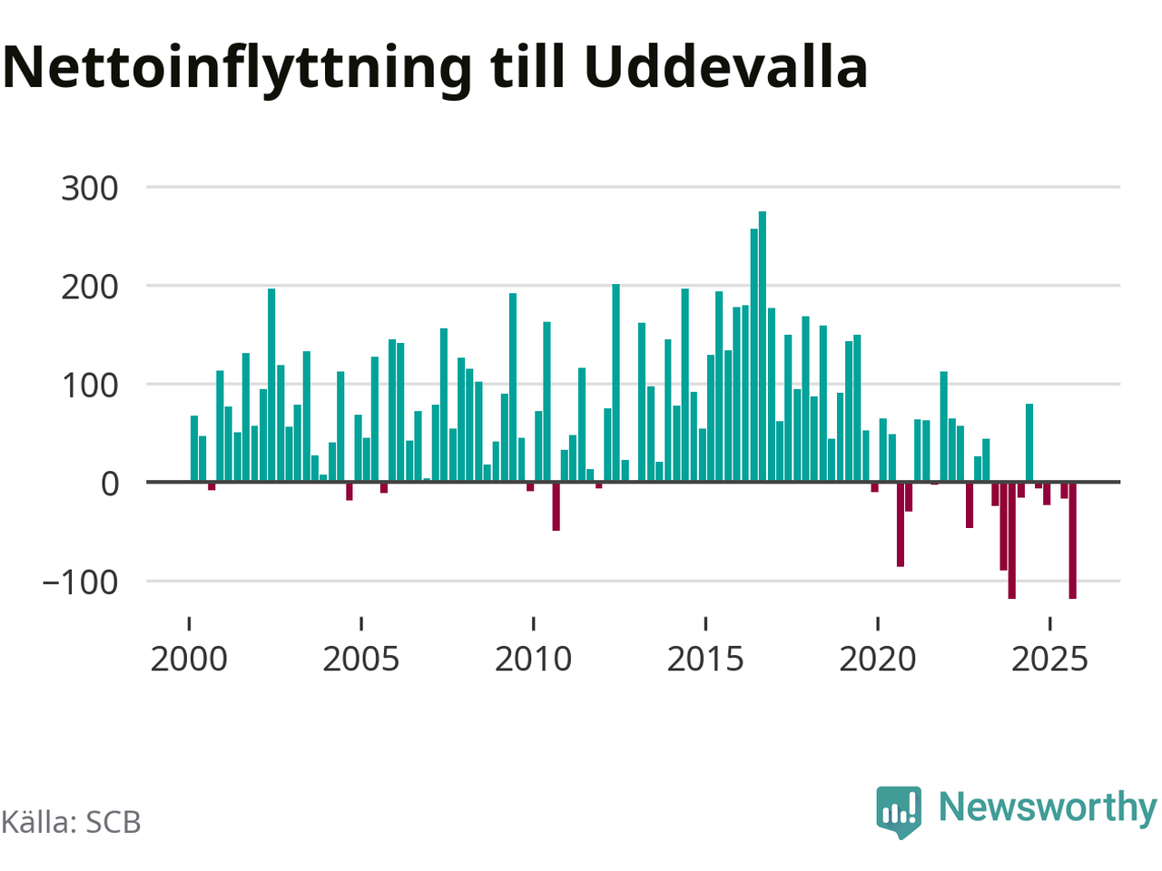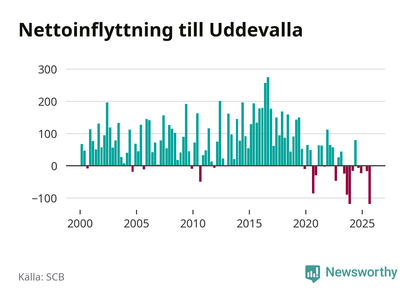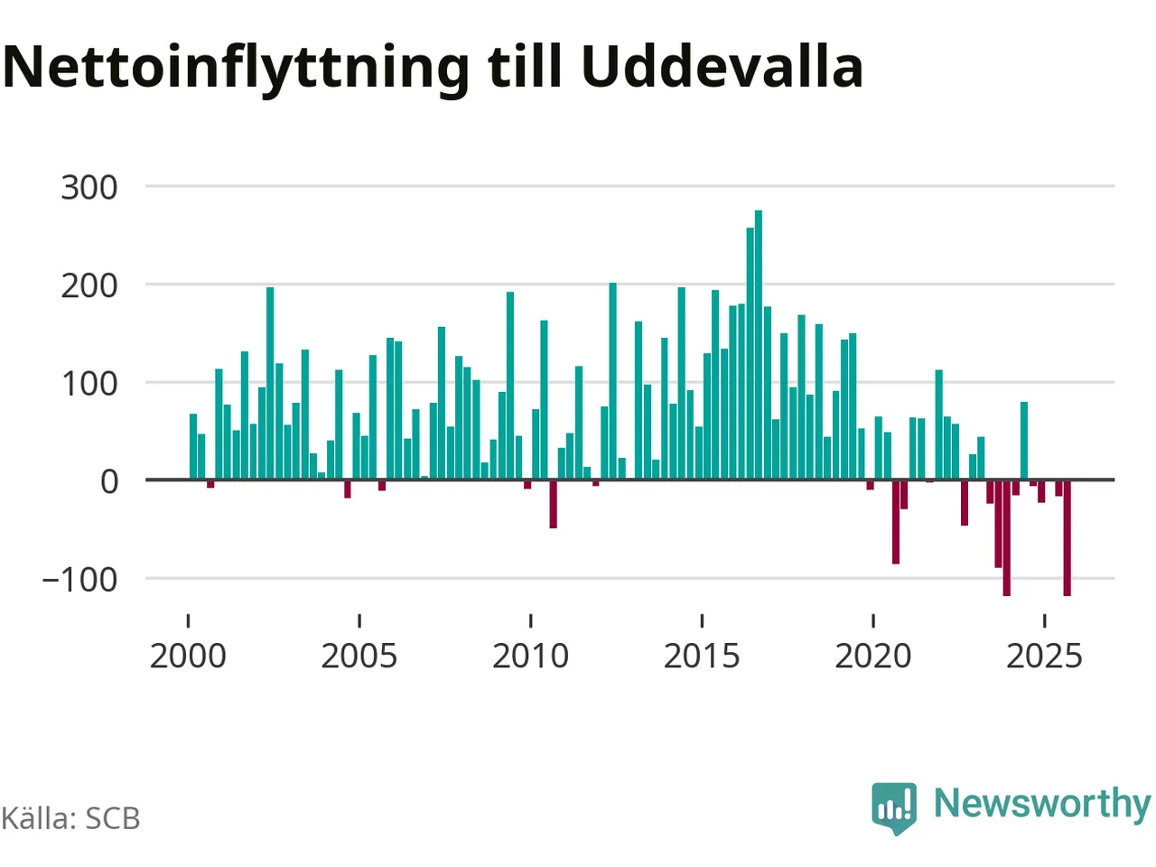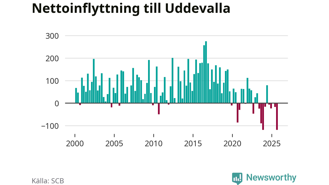 Under tredje kvartalet 2025 flyttade 749 personer till kommunen medan 868 personer flyttade därifrån. Så många har inte flyttat från Uddevalla under något kvartal under det här seklet. Det ger den största nettoutflyttningen under ett kvartal sedan åtminstone år 2000. Sedan seklets början har Uddevalla oftast haft ett positivt flyttnetto.