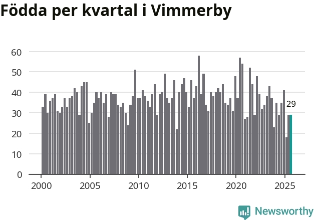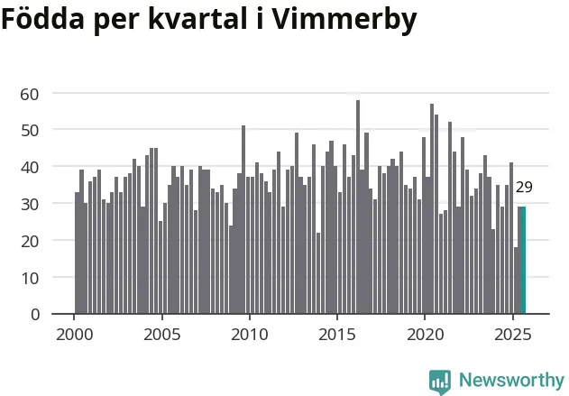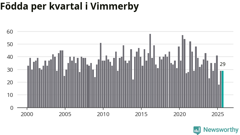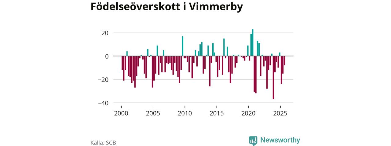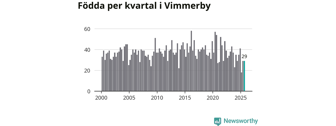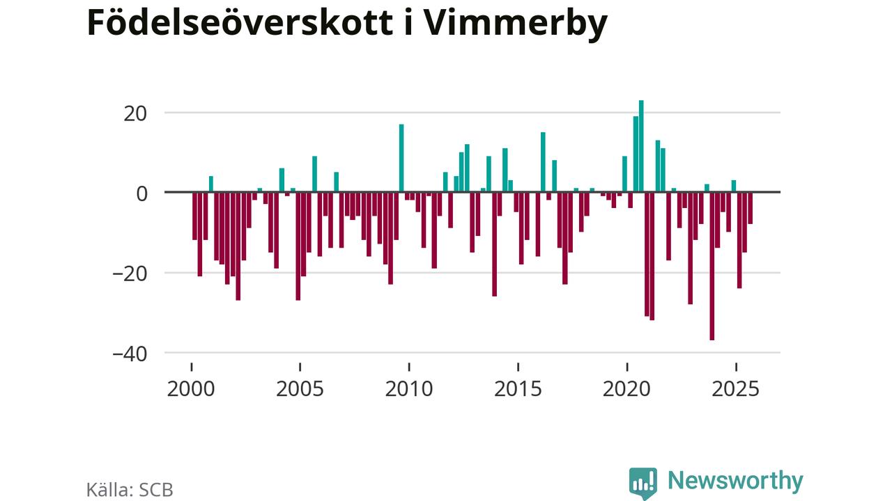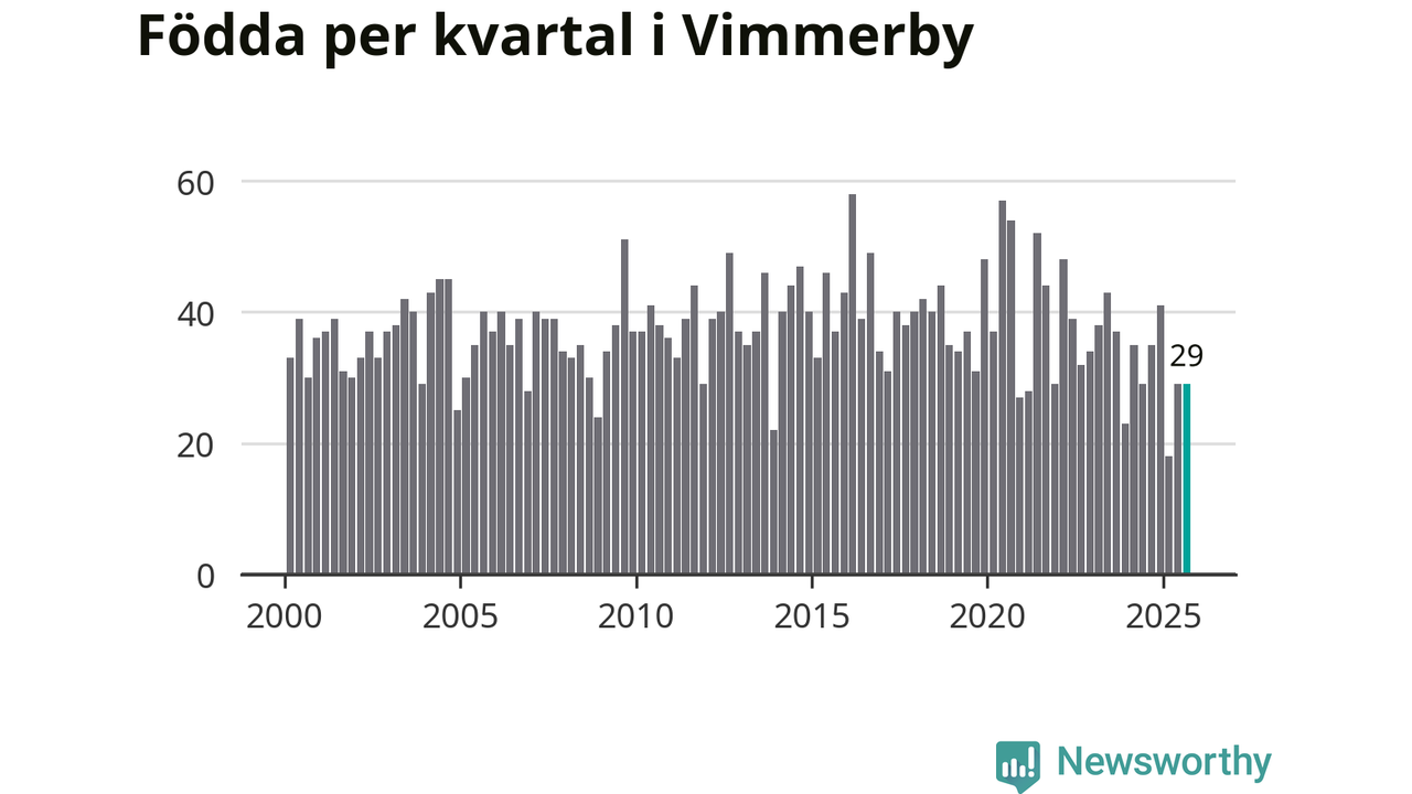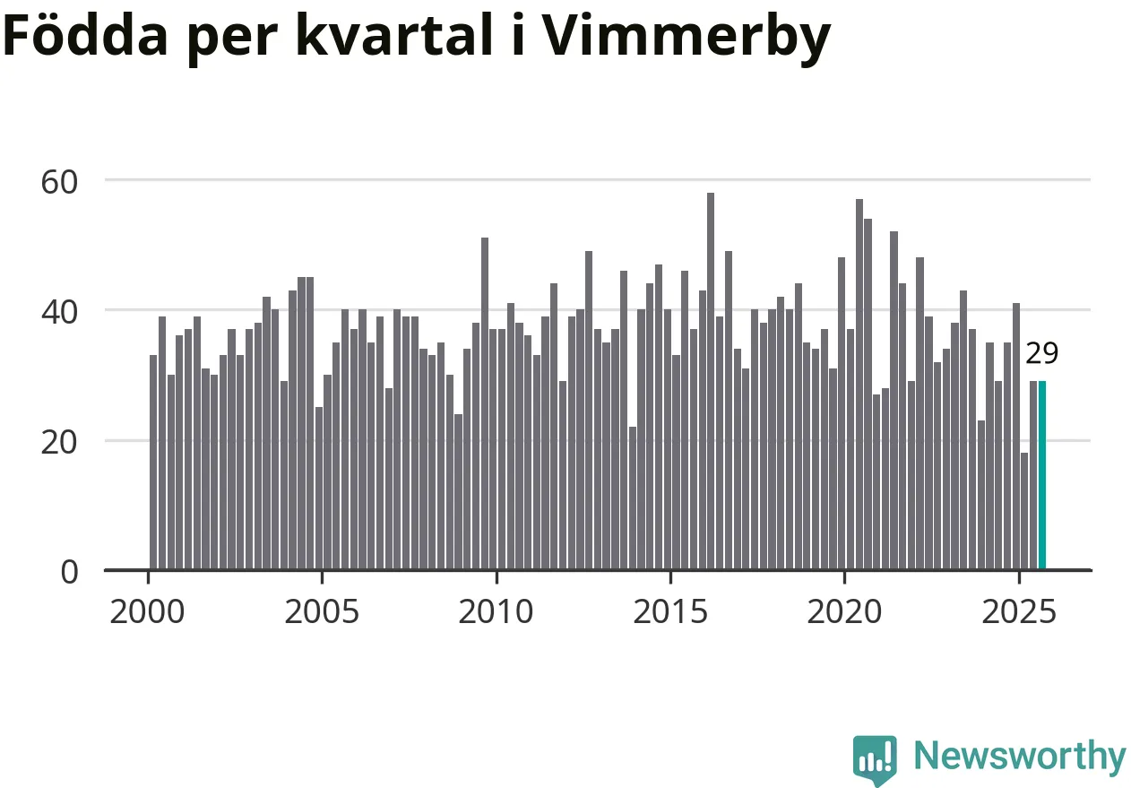 Enligt SCB:s siffror föddes 29 barn i Vimmerby under det senaste kvartalet. Samtidigt avled 37 personer. Skillnaden mellan antal födda och döda är så liten att det inte går att säga om det beror på något annat än SCB:s röjandeskydd. Kommunen har oftast haft negativt födelsenetto tidigare.