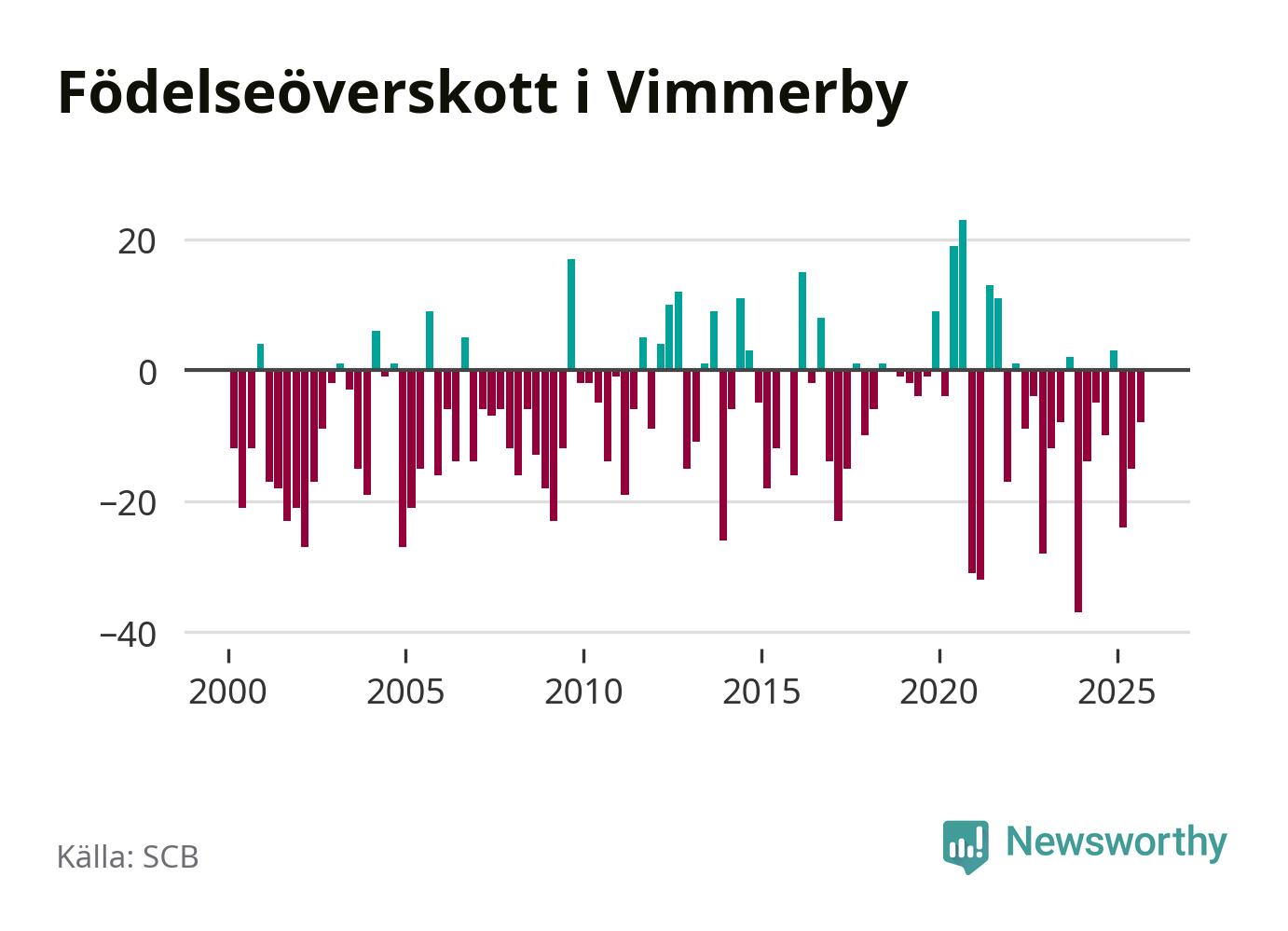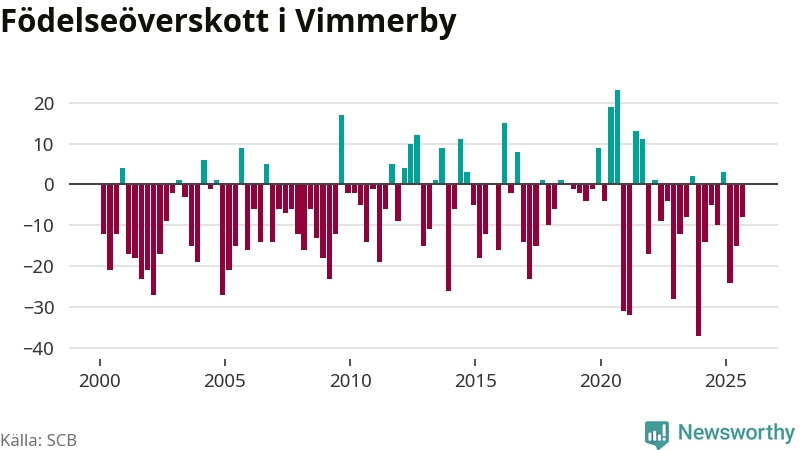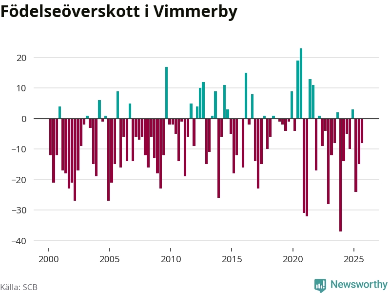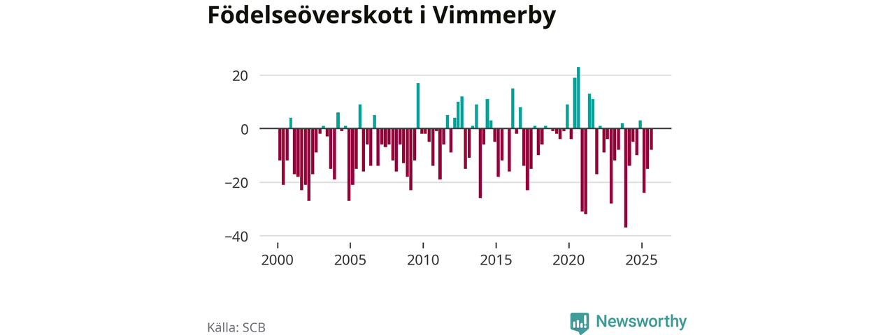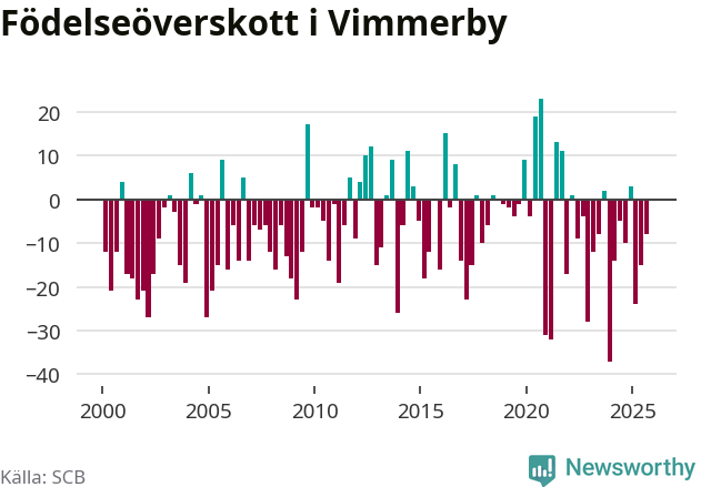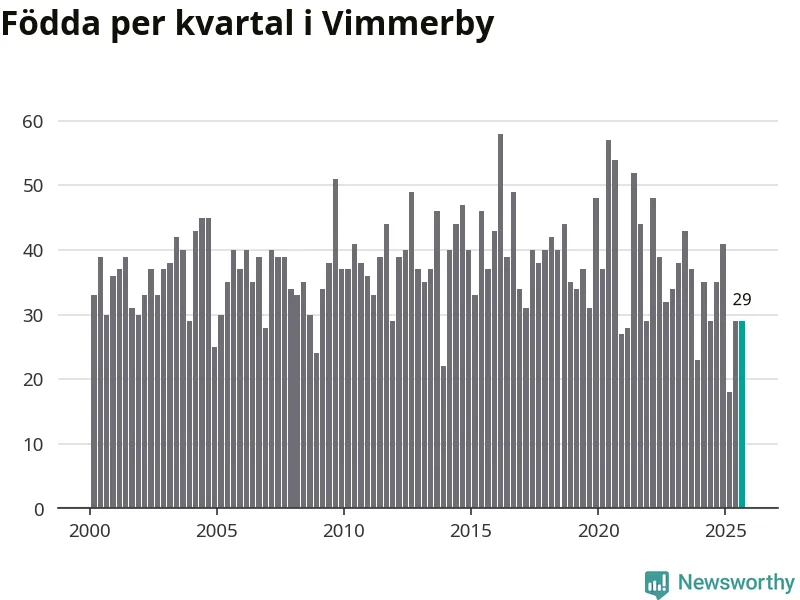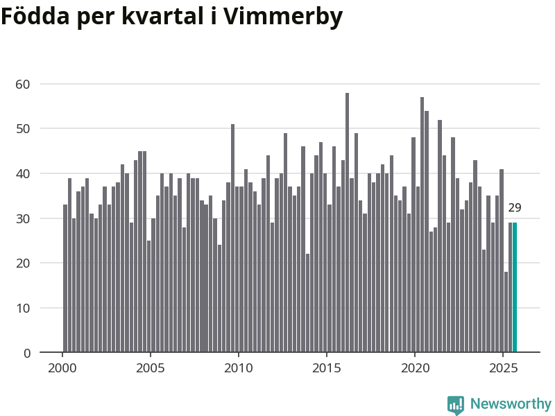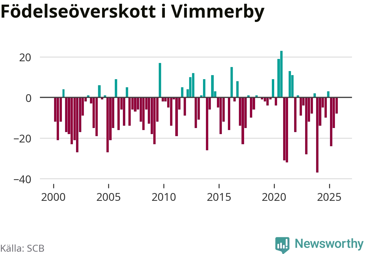 Enligt SCB:s siffror föddes 29 barn i Vimmerby under det senaste kvartalet. Samtidigt avled 37 personer. Skillnaden mellan antal födda och döda är så liten att det inte går att säga om det beror på något annat än SCB:s röjandeskydd. Kommunen har oftast haft negativt födelsenetto tidigare.