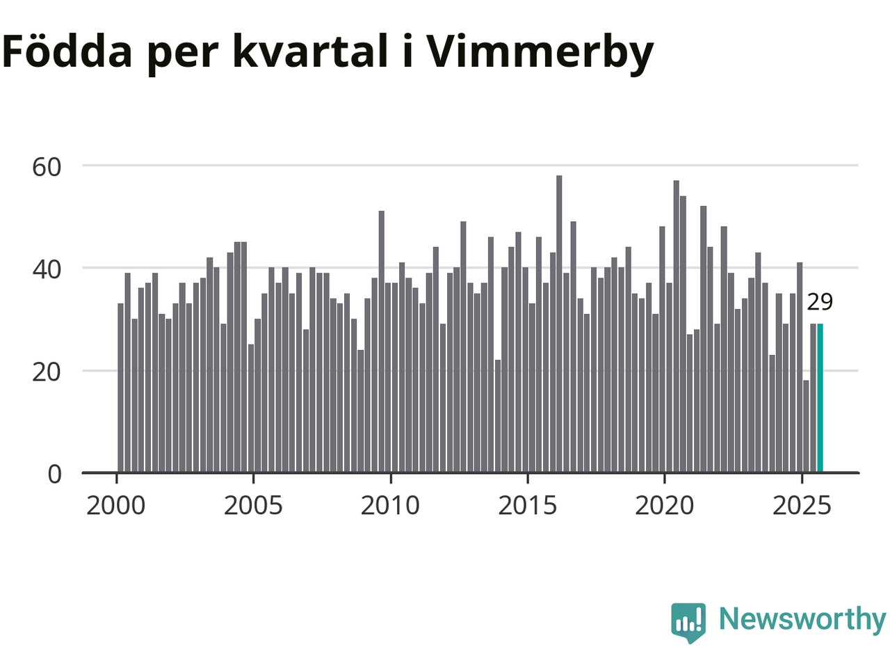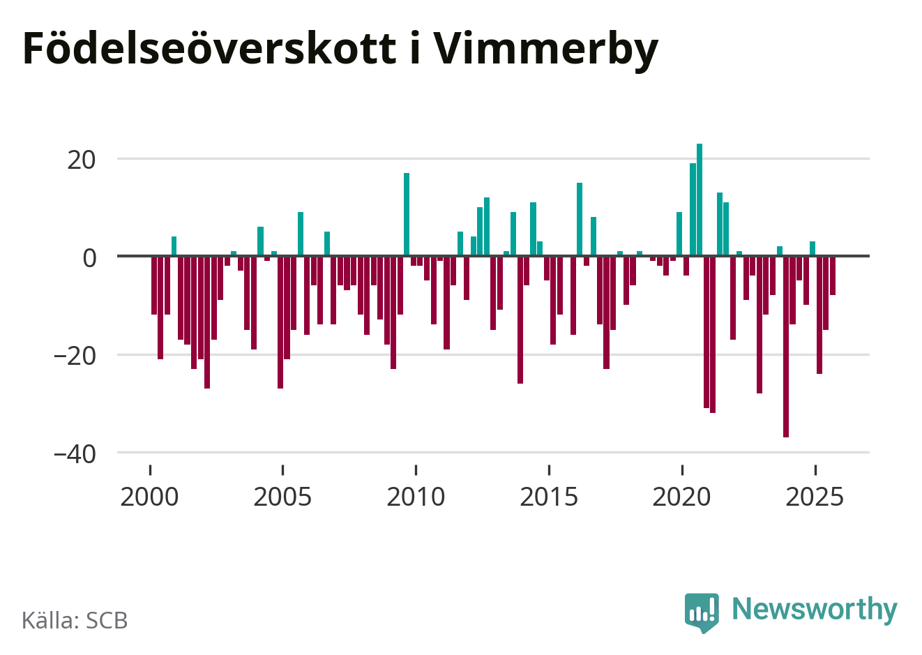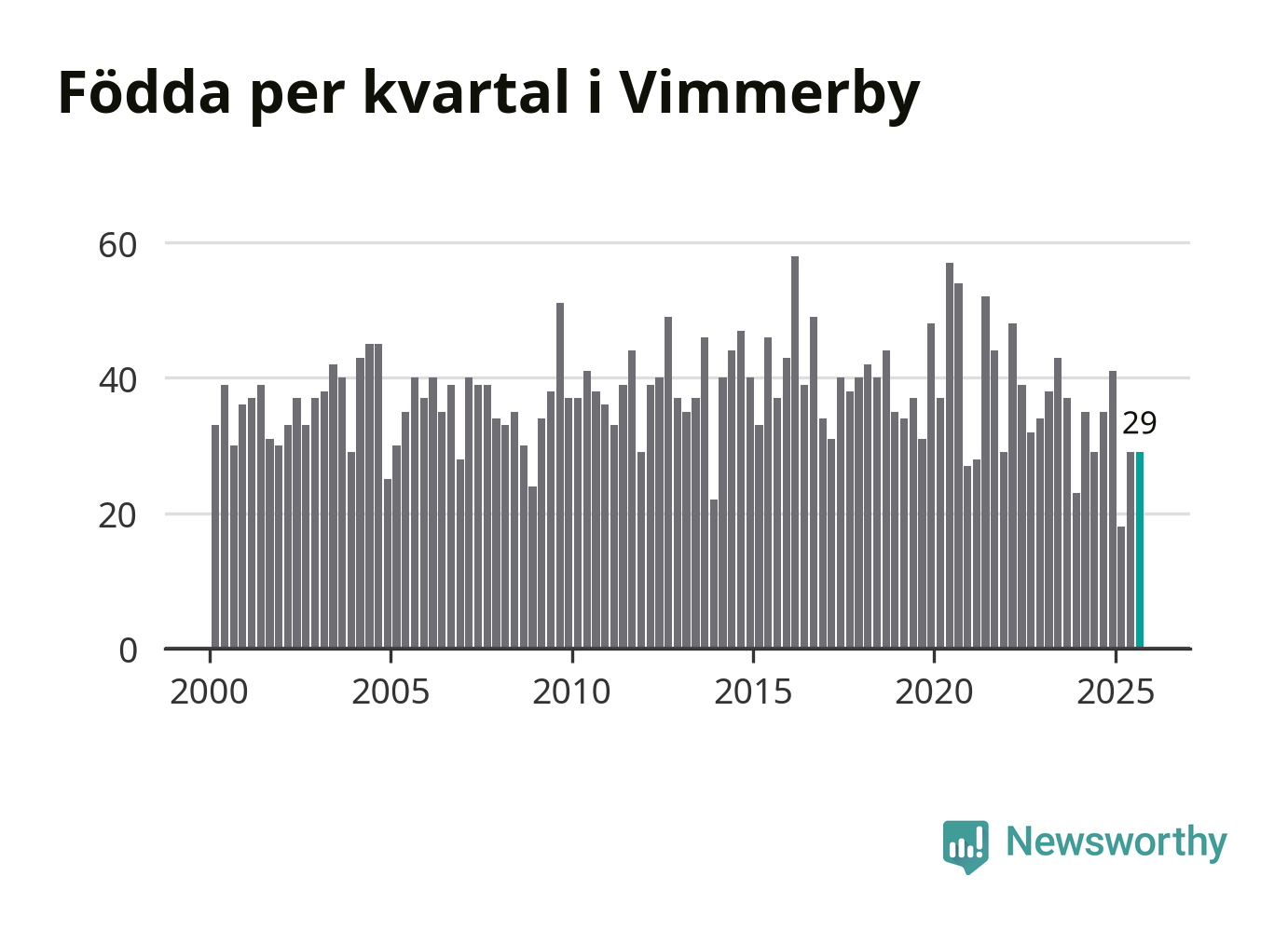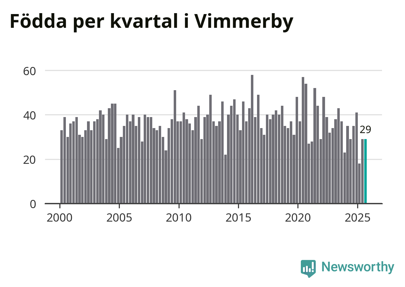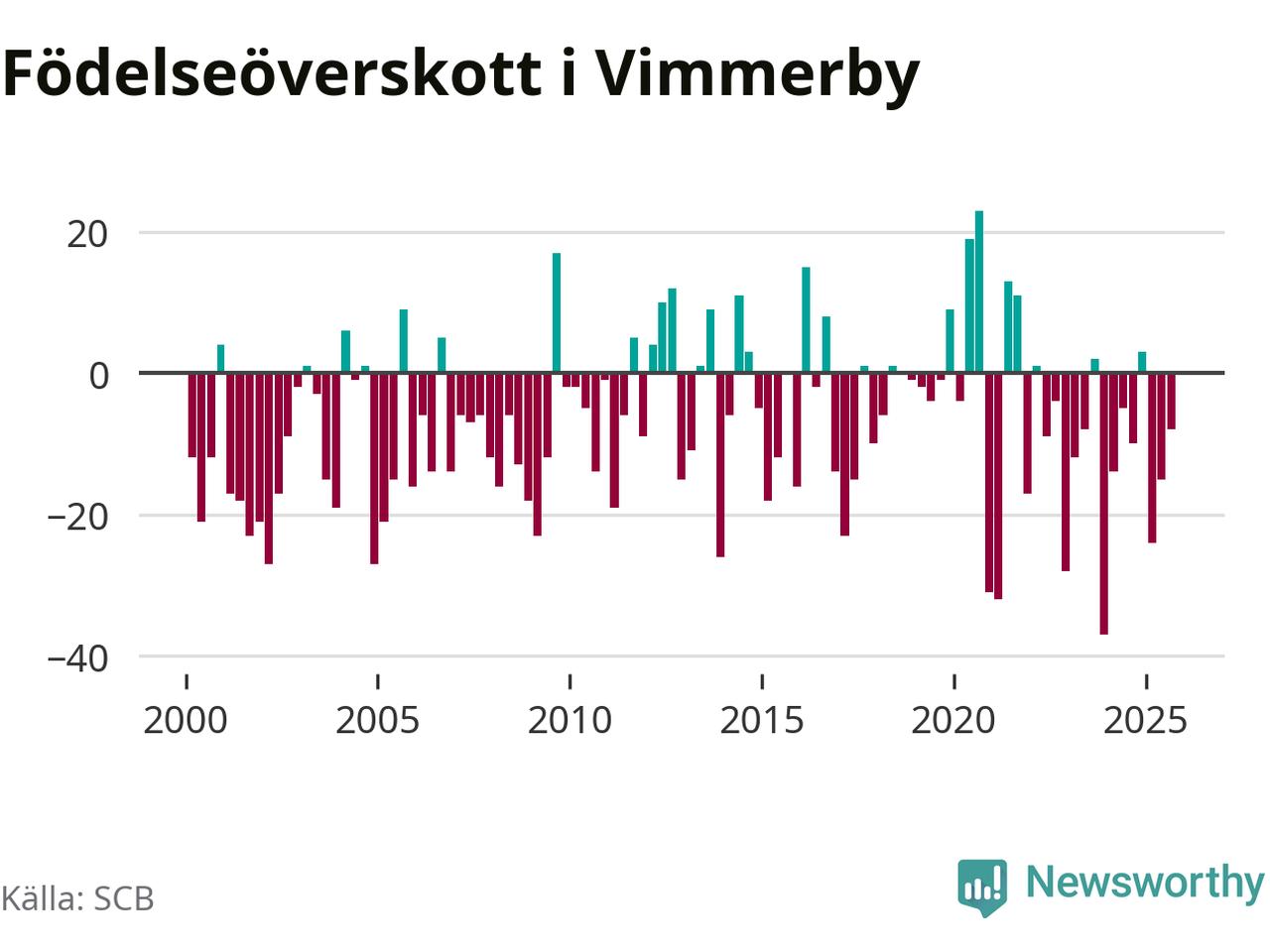 Enligt SCB:s siffror föddes 29 barn i Vimmerby under det senaste kvartalet. Samtidigt avled 37 personer. Skillnaden mellan antal födda och döda är så liten att det inte går att säga om det beror på något annat än SCB:s röjandeskydd. Kommunen har oftast haft negativt födelsenetto tidigare.