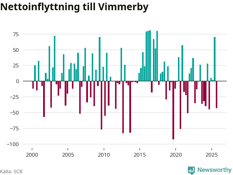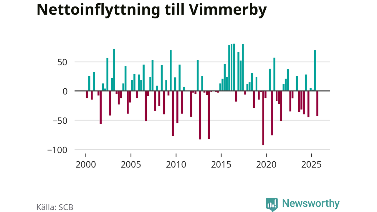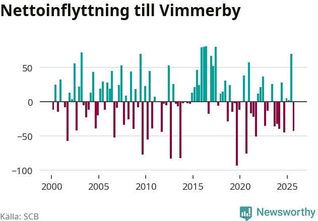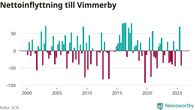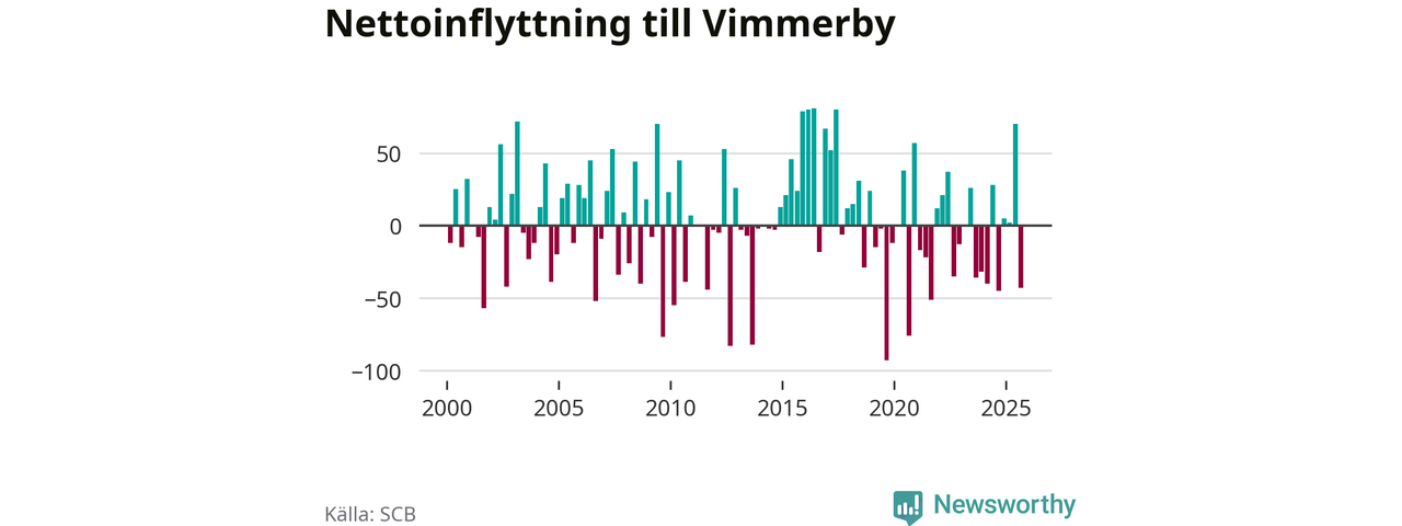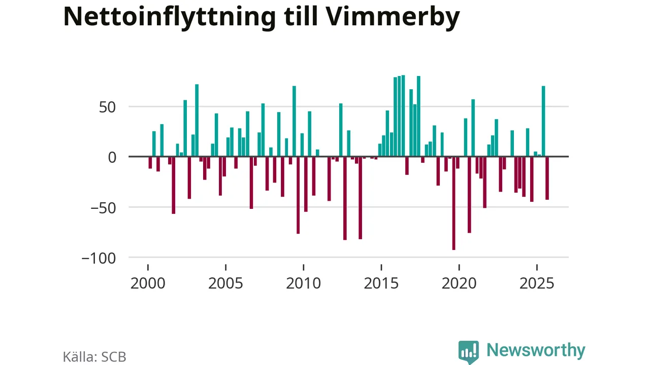 Under tredje kvartalet 2025 flyttade 173 personer till kommunen medan 216 personer flyttade därifrån. Sedan seklets början har Vimmerby haft ungefär lika många kvartal med positivt flyttnetto som negativt.