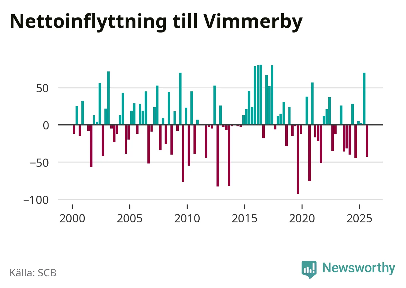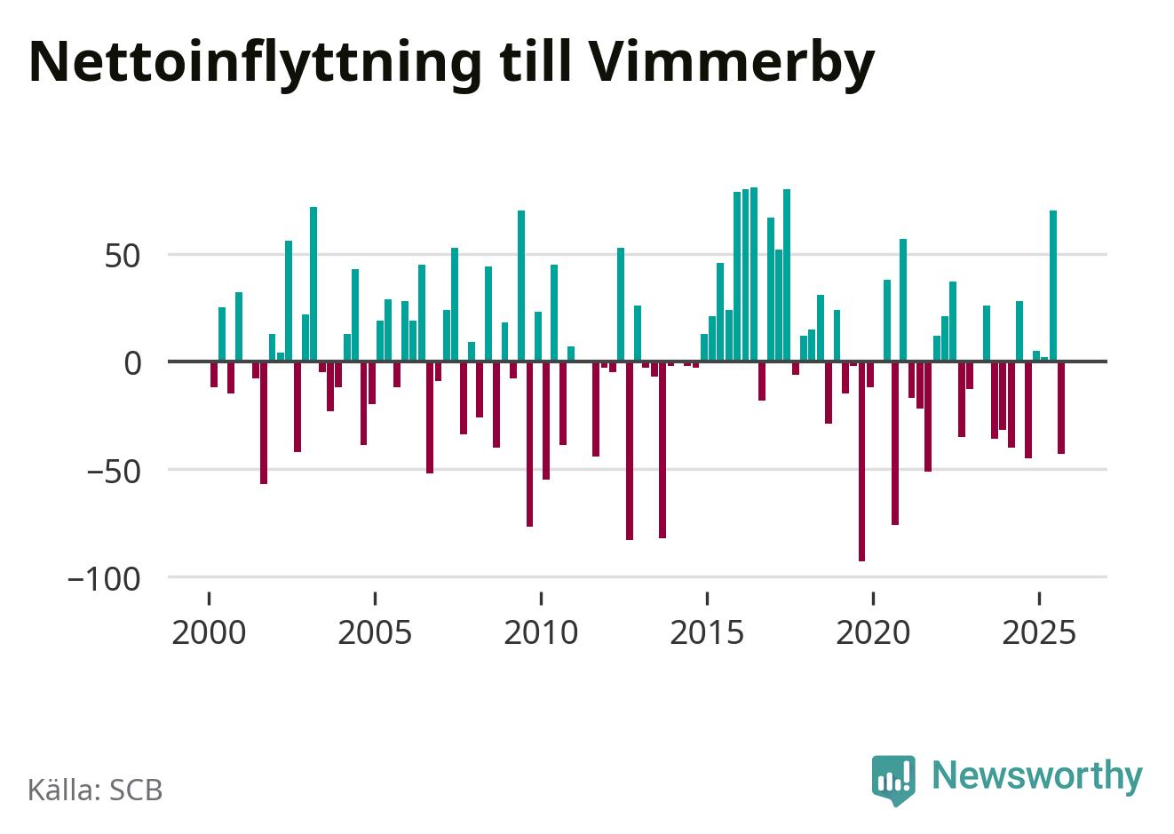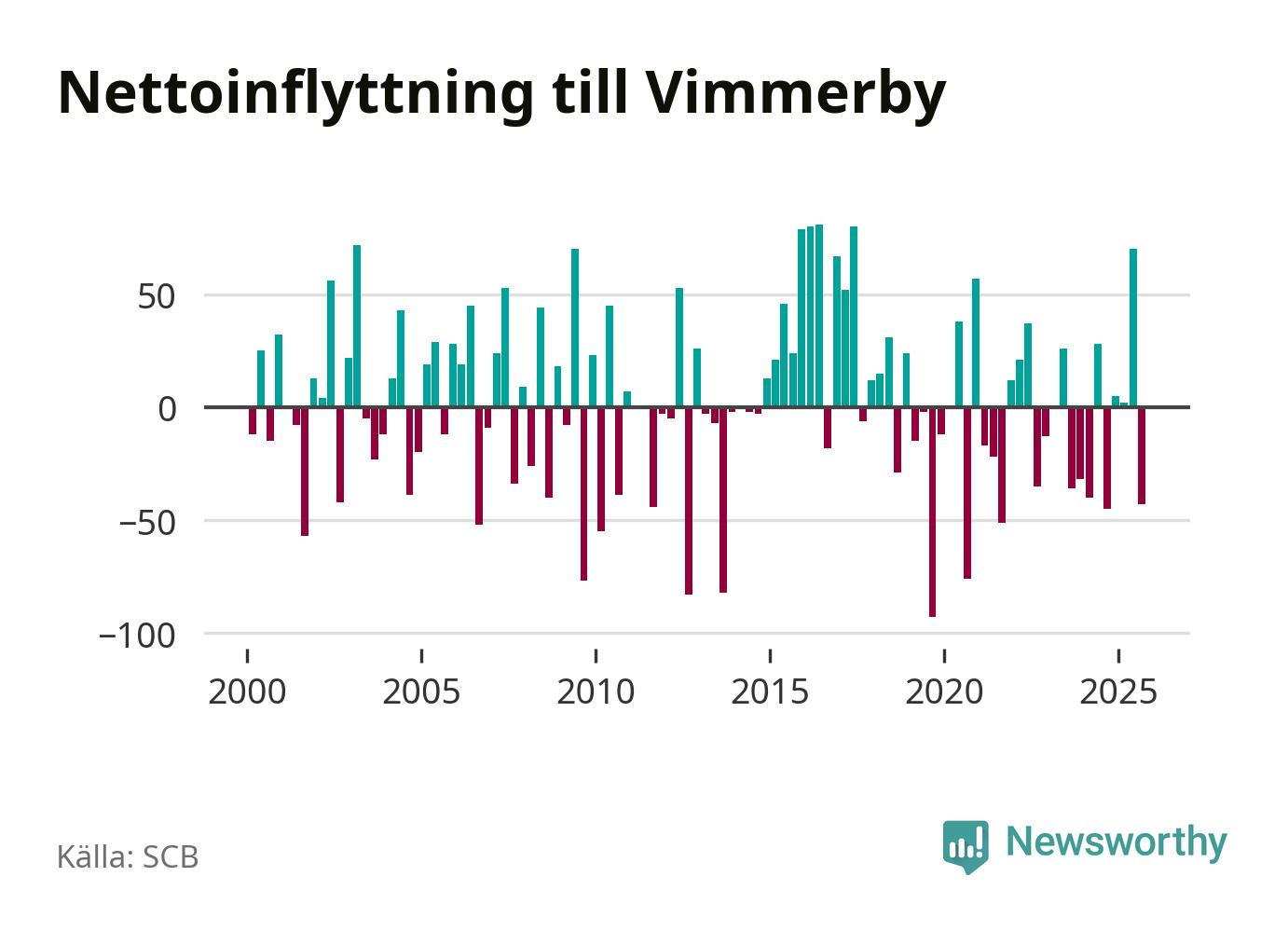Under tredje kvartalet 2025 flyttade 173 personer till kommunen medan 216 personer flyttade därifrån. Sedan seklets början har Vimmerby haft ungefär lika många kvartal med positivt flyttnetto som negativt.