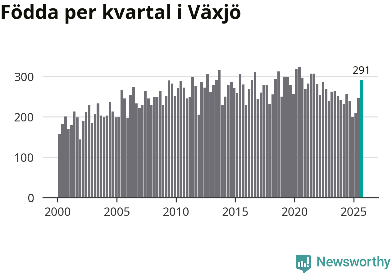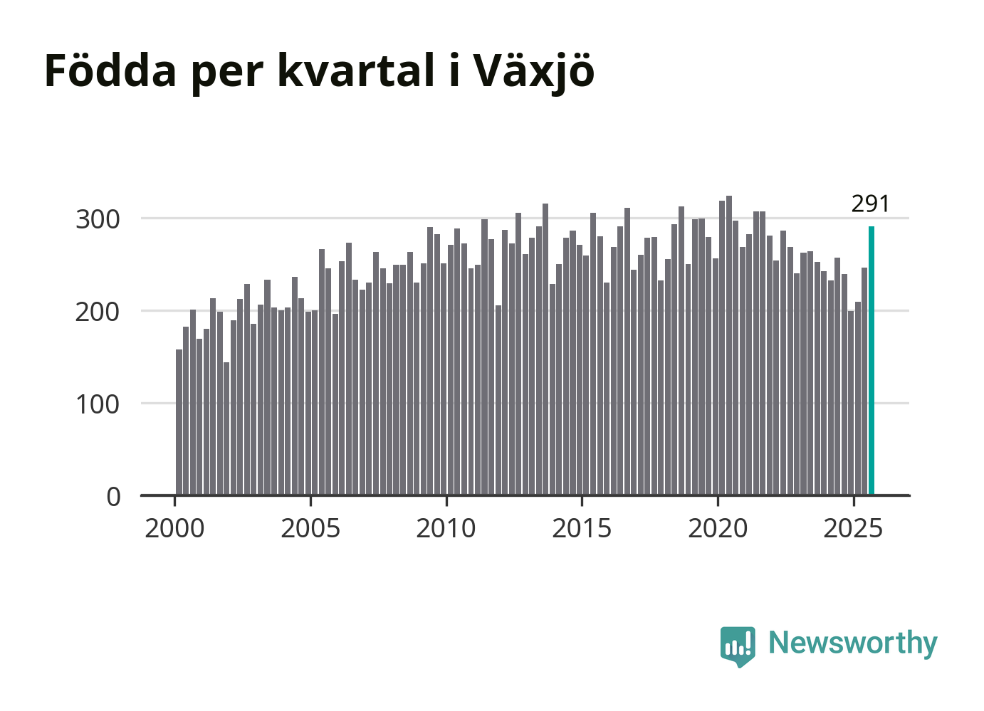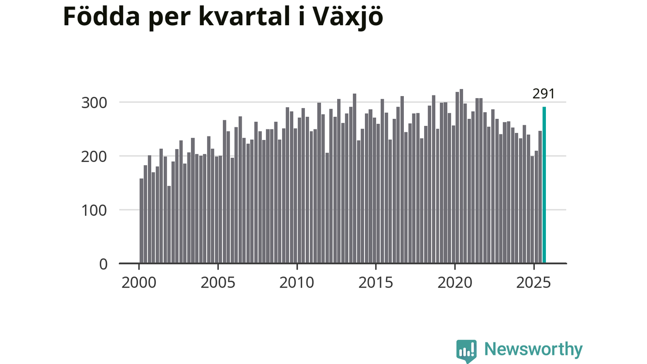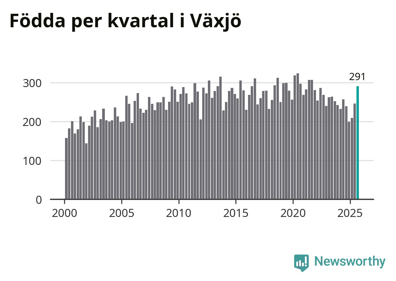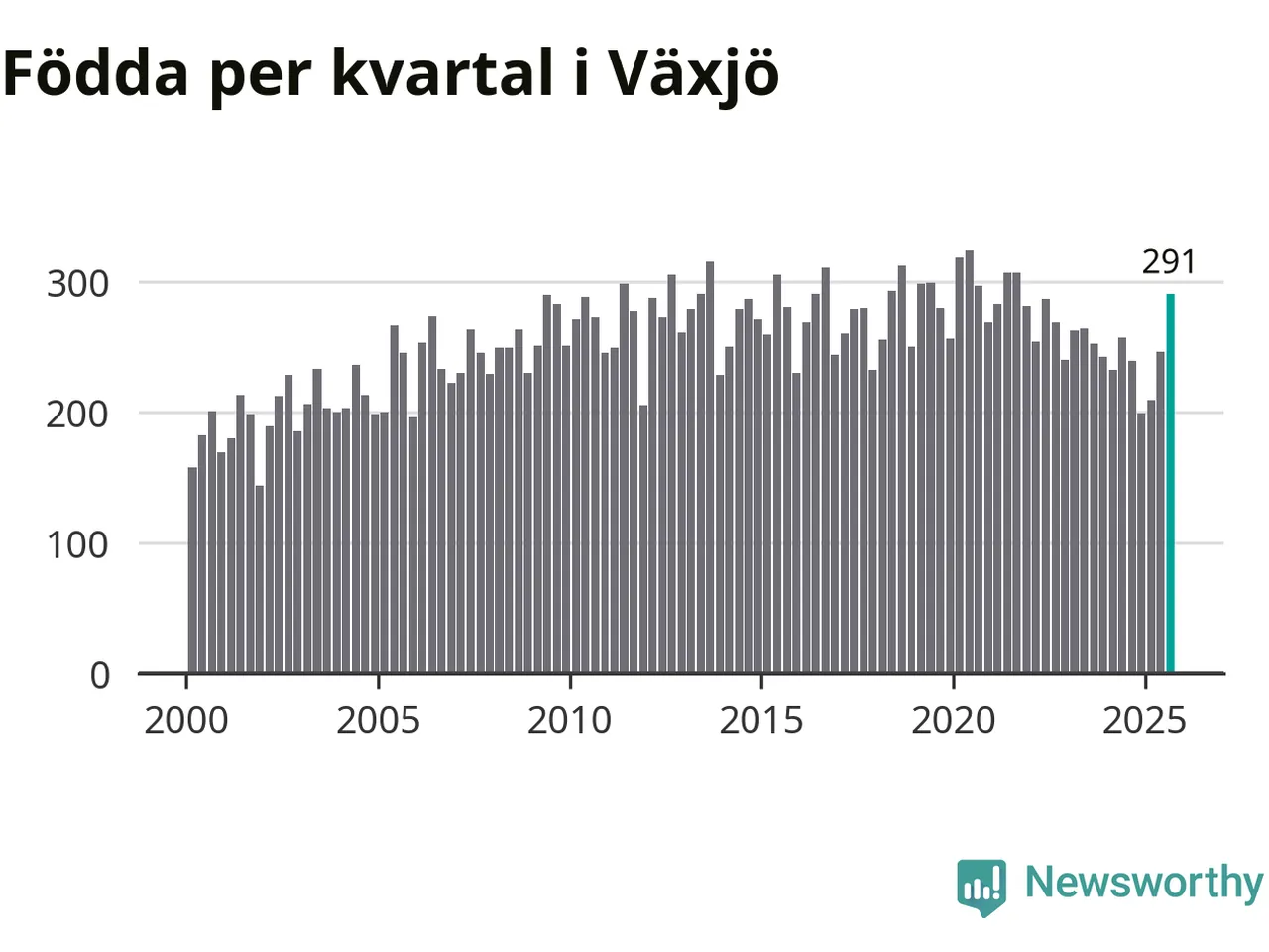 Enligt SCB:s siffror föddes 291 barn i Växjö under det senaste kvartalet, vilket är en relativt hög siffra historiskt sett. Samtidigt avled 176 personer. Växjö hade alltså ett positivt födelsenetto, vilket kommunen historiskt sett nästan alltid har haft.