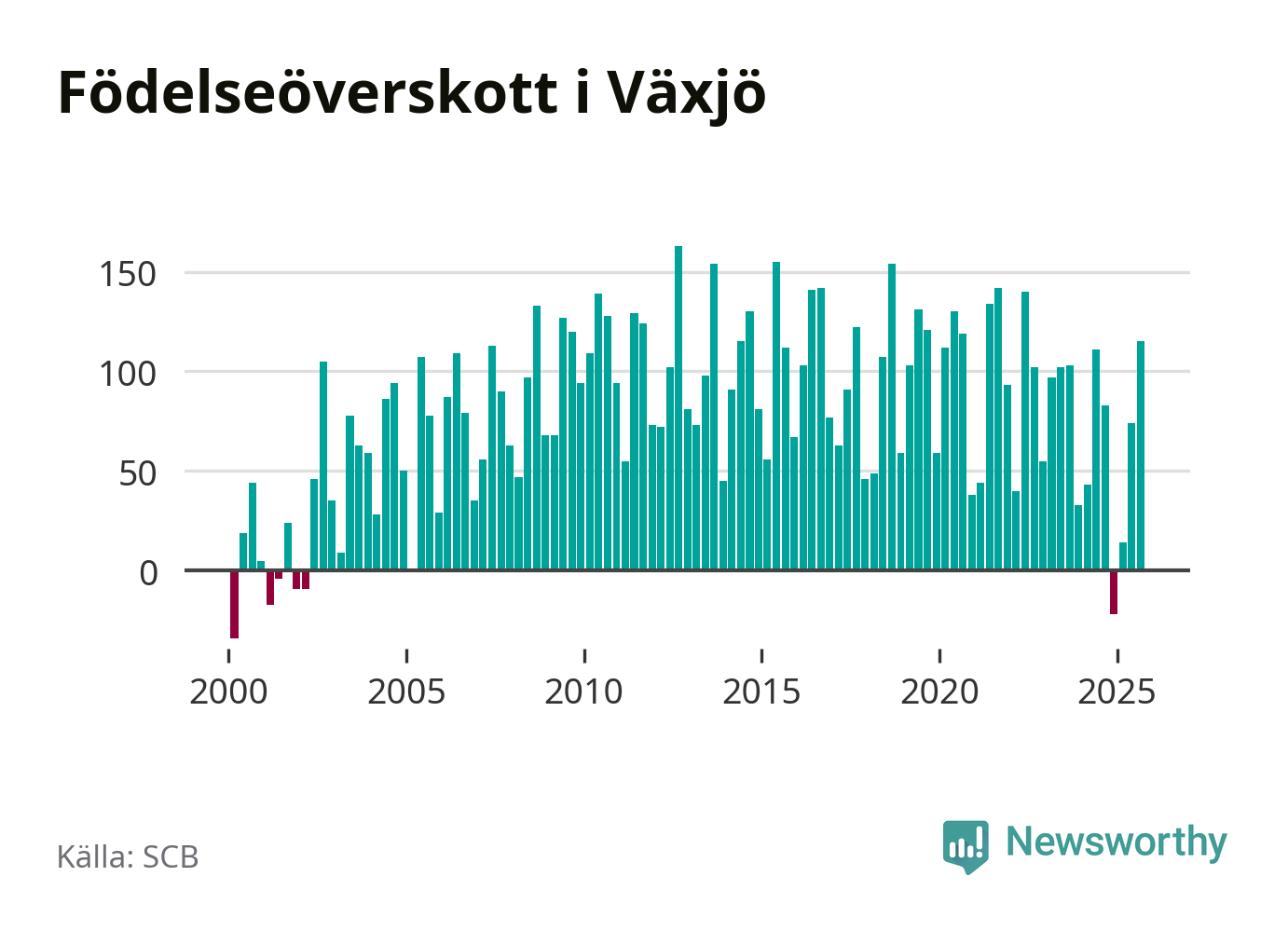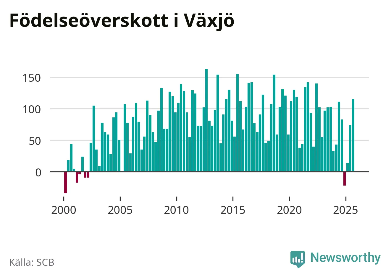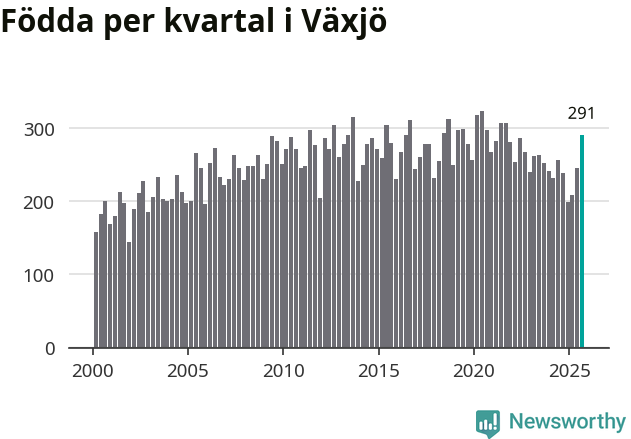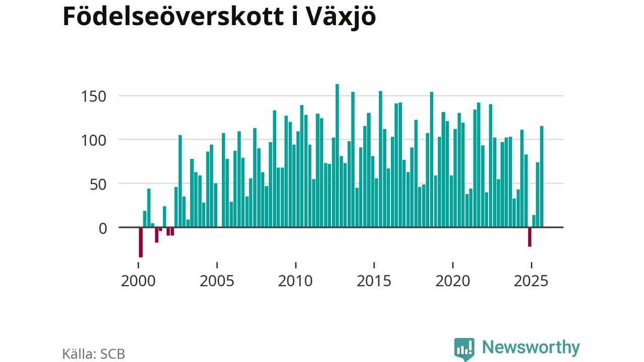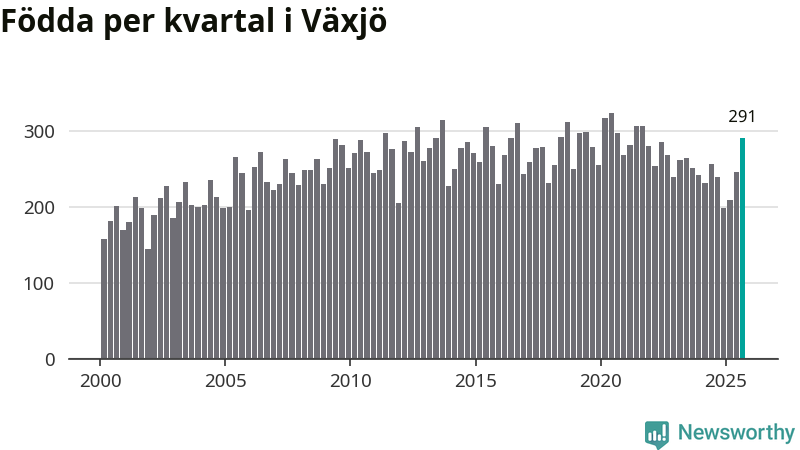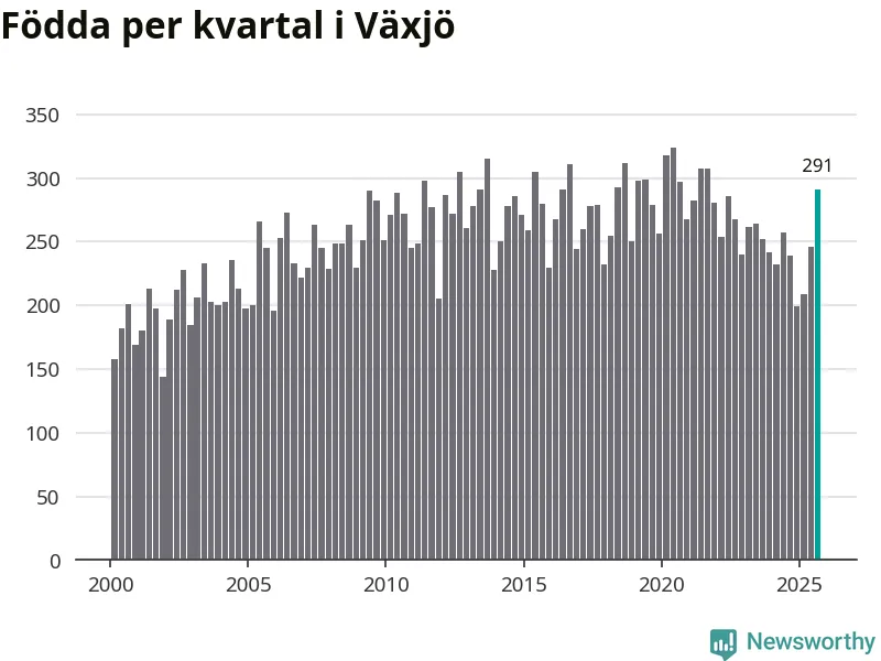 Enligt SCB:s siffror föddes 291 barn i Växjö under det senaste kvartalet, vilket är en relativt hög siffra historiskt sett. Samtidigt avled 176 personer. Växjö hade alltså ett positivt födelsenetto, vilket kommunen historiskt sett nästan alltid har haft.