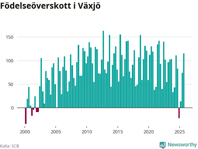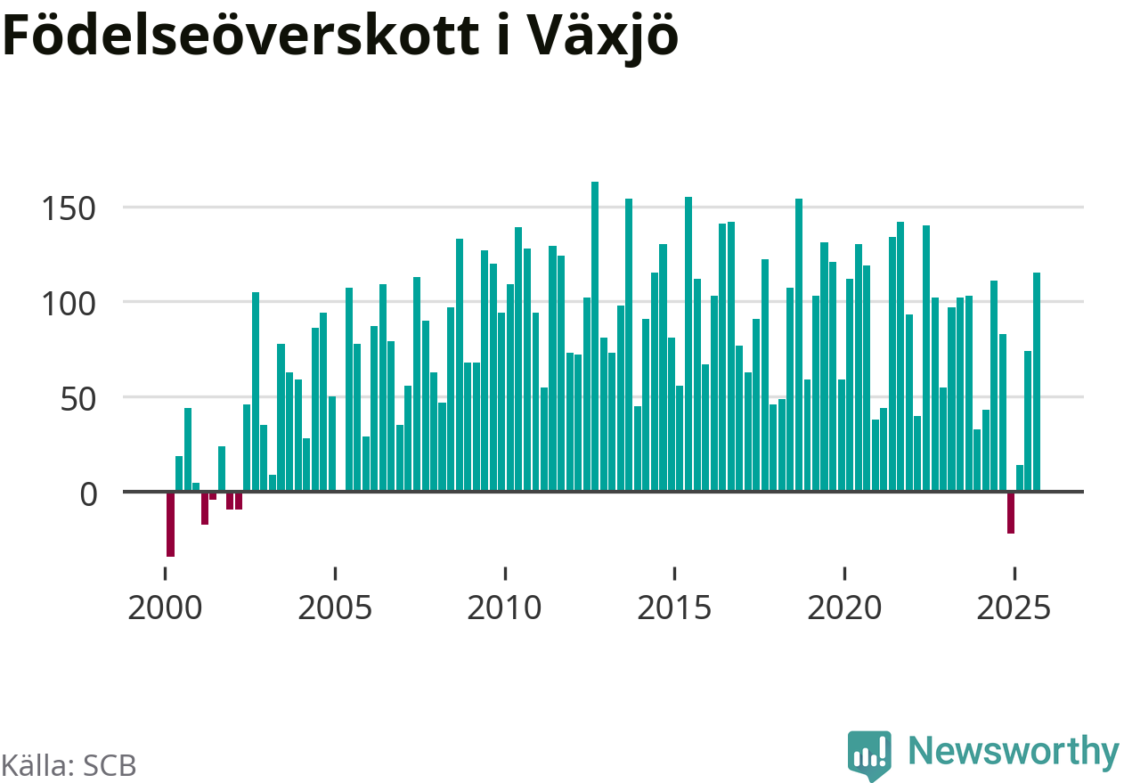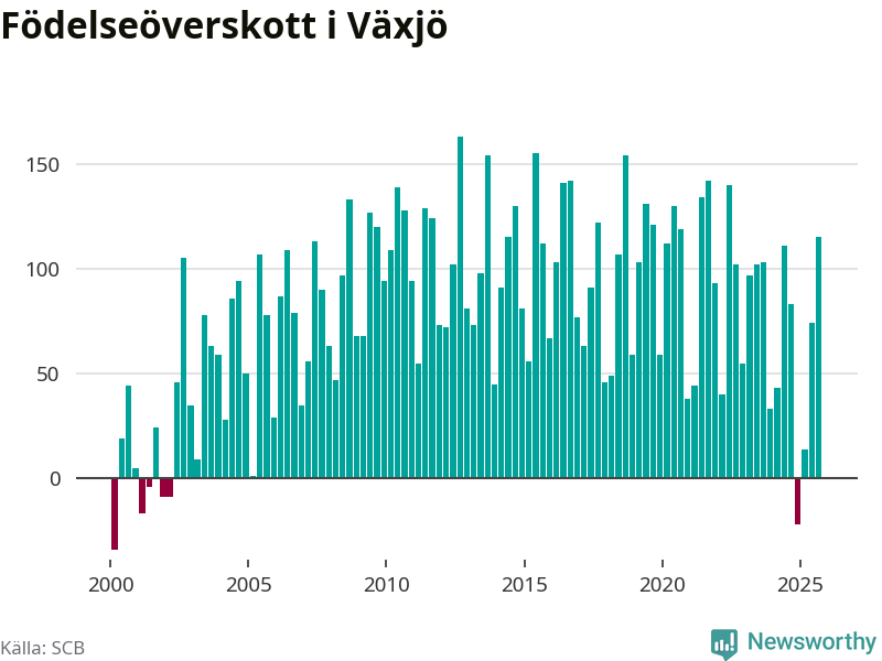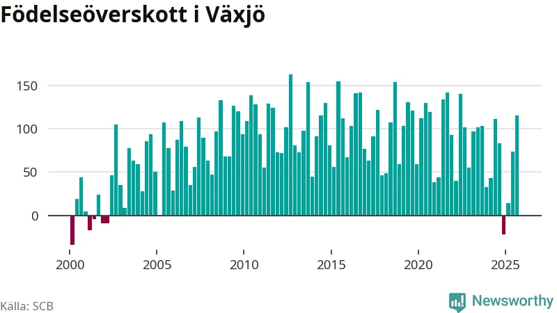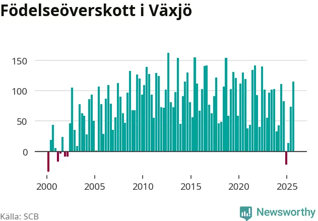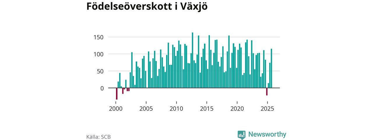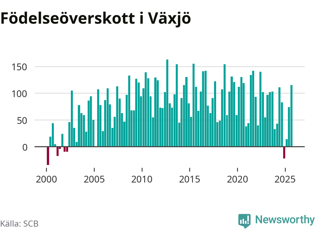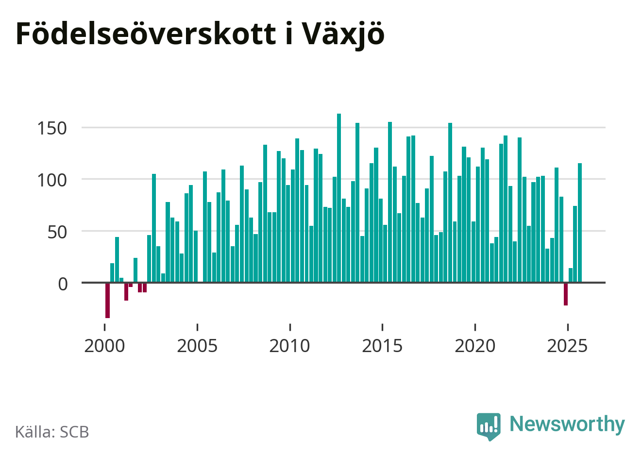 Enligt SCB:s siffror föddes 291 barn i Växjö under det senaste kvartalet, vilket är en relativt hög siffra historiskt sett. Samtidigt avled 176 personer. Växjö hade alltså ett positivt födelsenetto, vilket kommunen historiskt sett nästan alltid har haft.