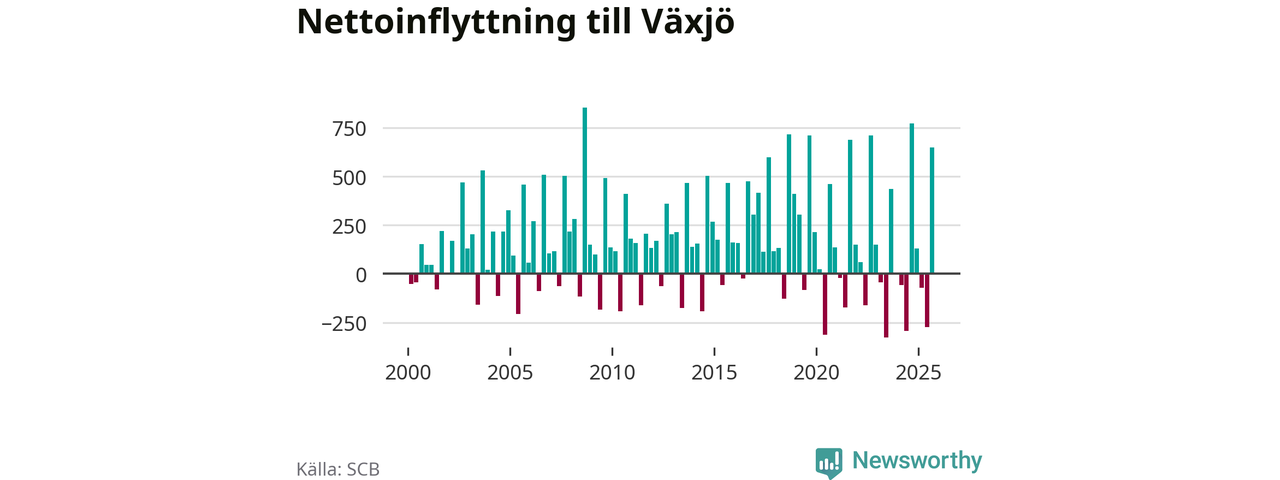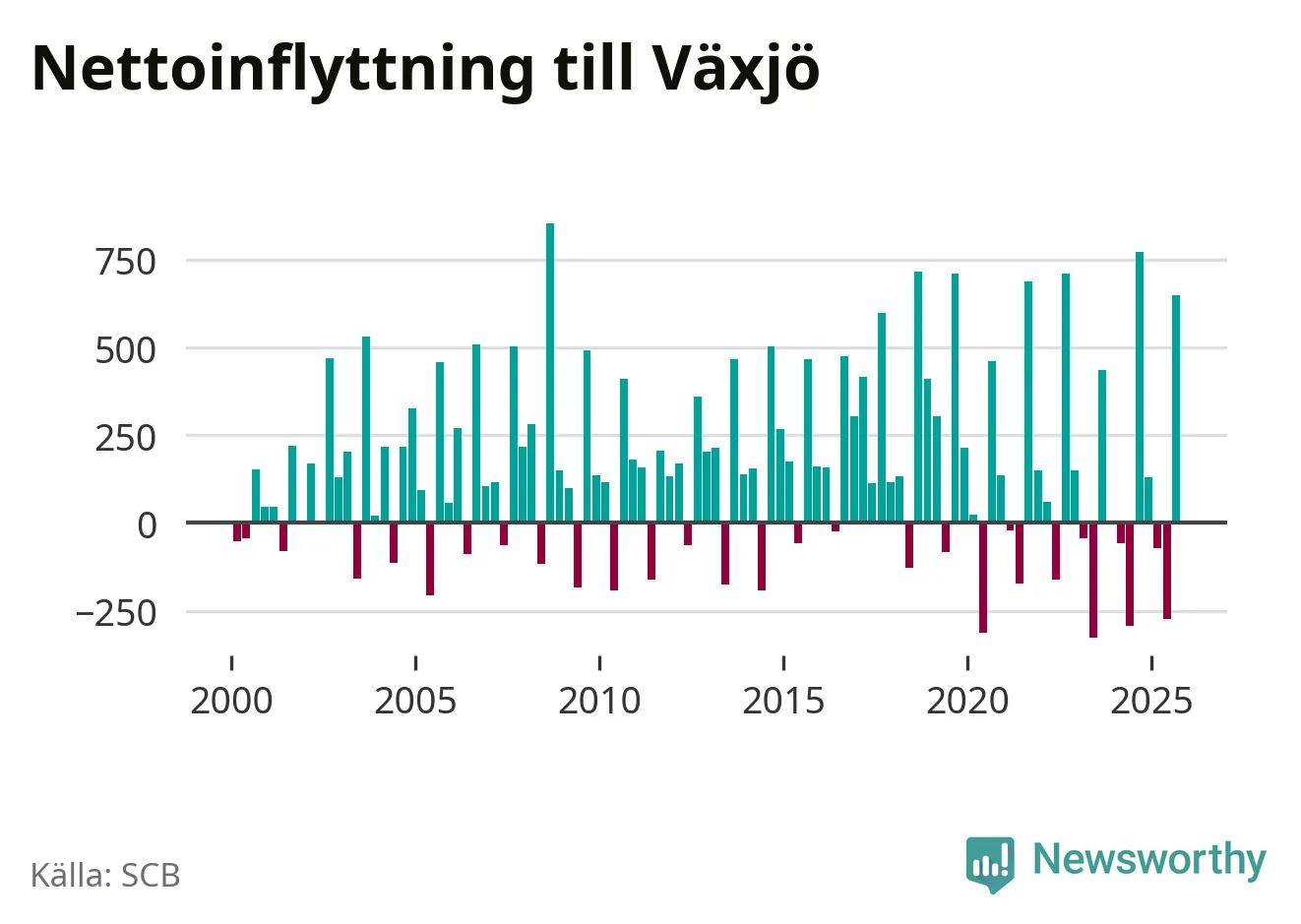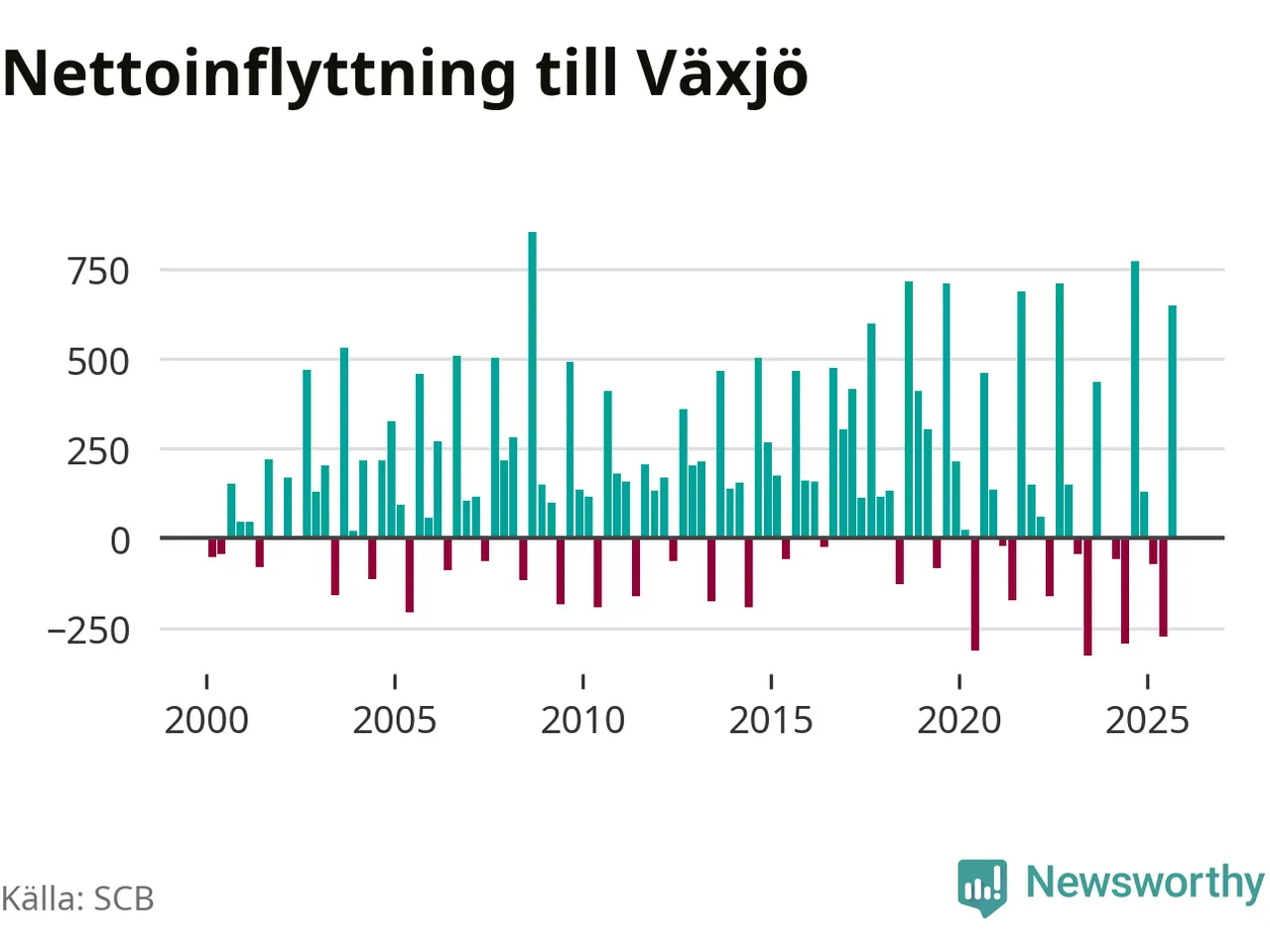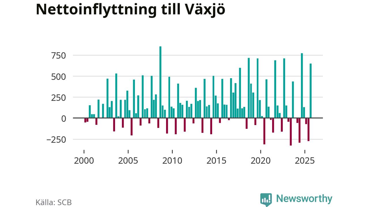 Under tredje kvartalet 2025 flyttade 2 517 personer till kommunen medan 1 869 personer flyttade därifrån. Det är historiskt sett en stor inflyttning under ett kvartal – men samtidigt var utflyttningen relativt stor. Sedan seklets början har Växjö oftast haft ett positivt flyttnetto, inklusive det senaste kvartalet.