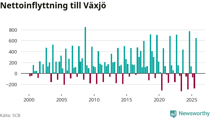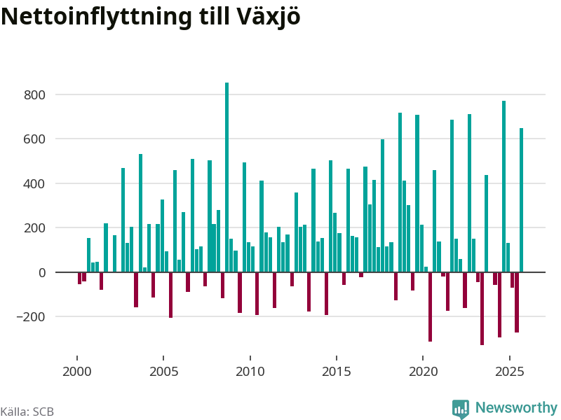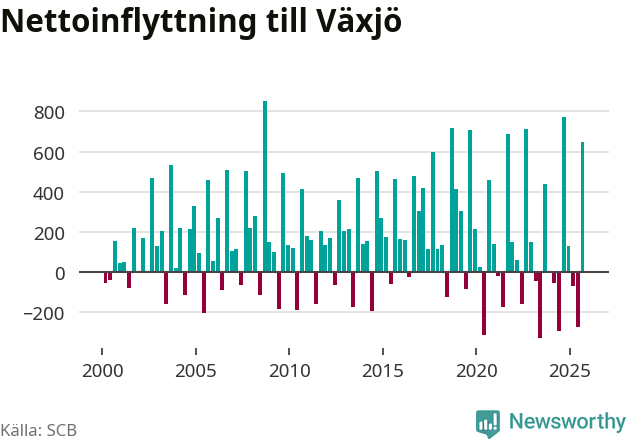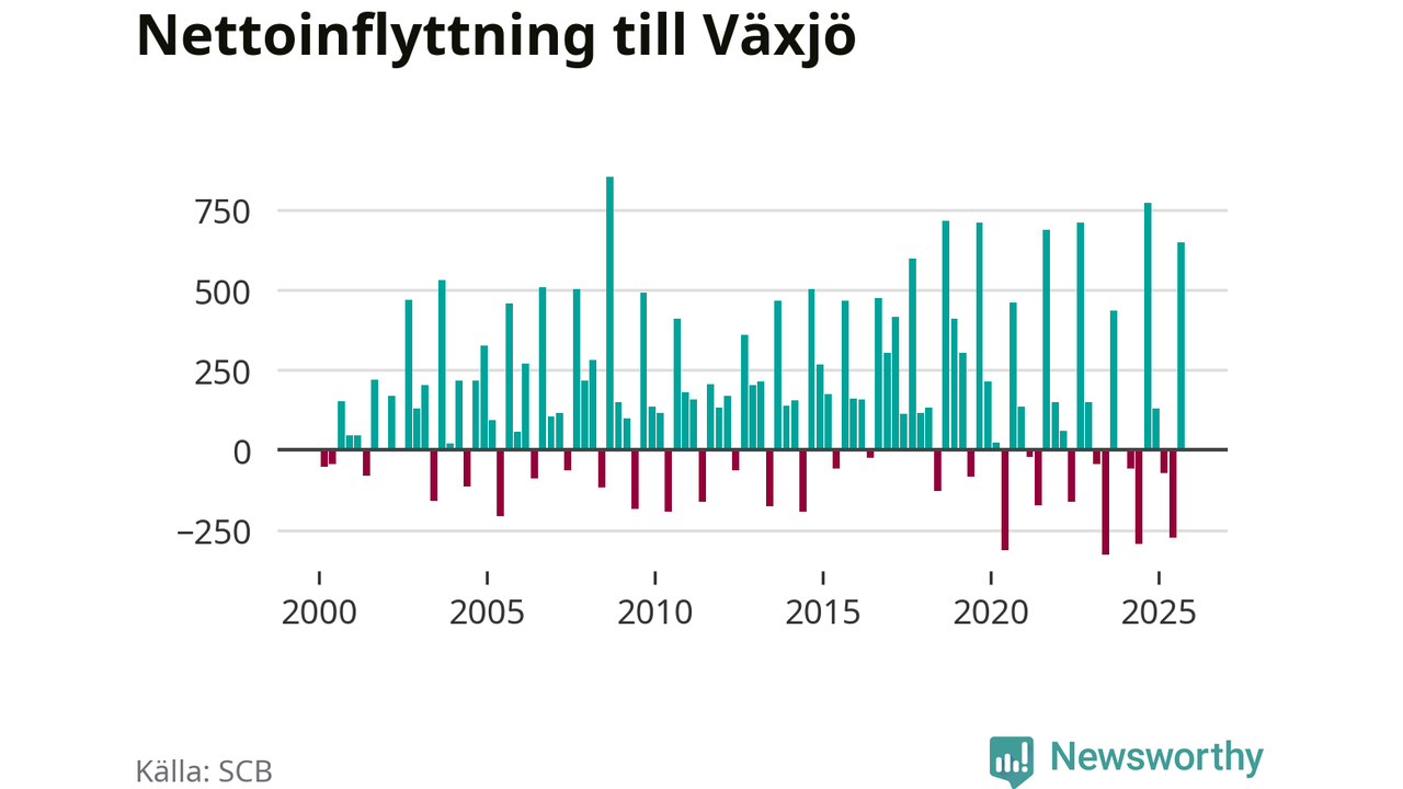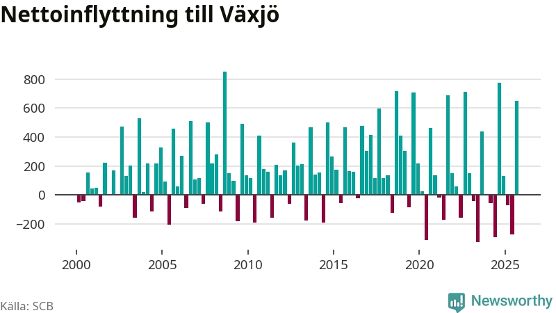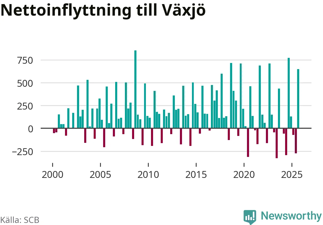Under tredje kvartalet 2025 flyttade 2 517 personer till kommunen medan 1 869 personer flyttade därifrån. Det är historiskt sett en stor inflyttning under ett kvartal – men samtidigt var utflyttningen relativt stor. Sedan seklets början har Växjö oftast haft ett positivt flyttnetto, inklusive det senaste kvartalet.