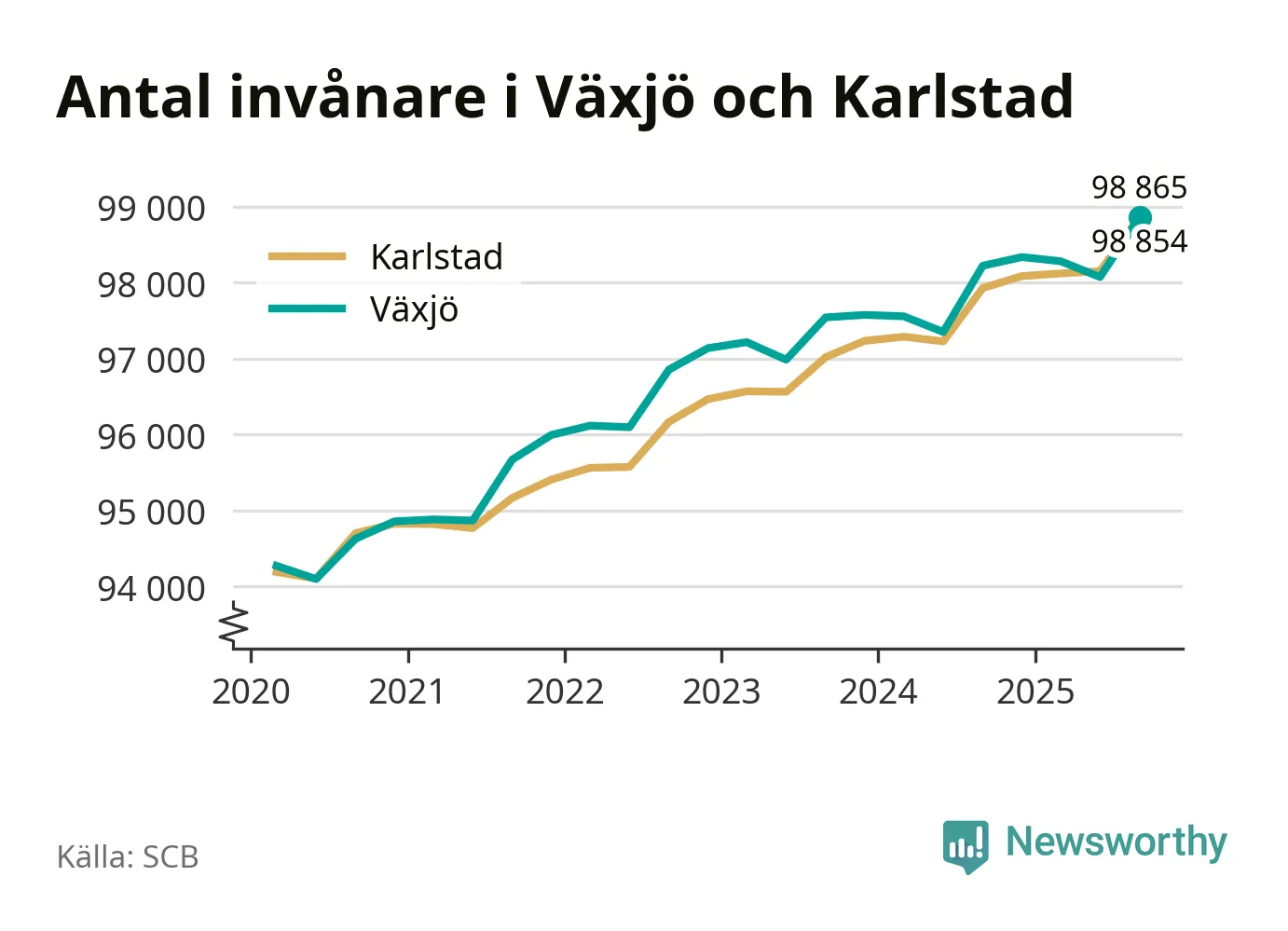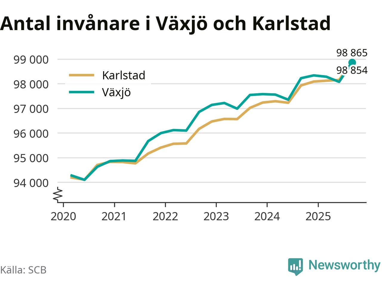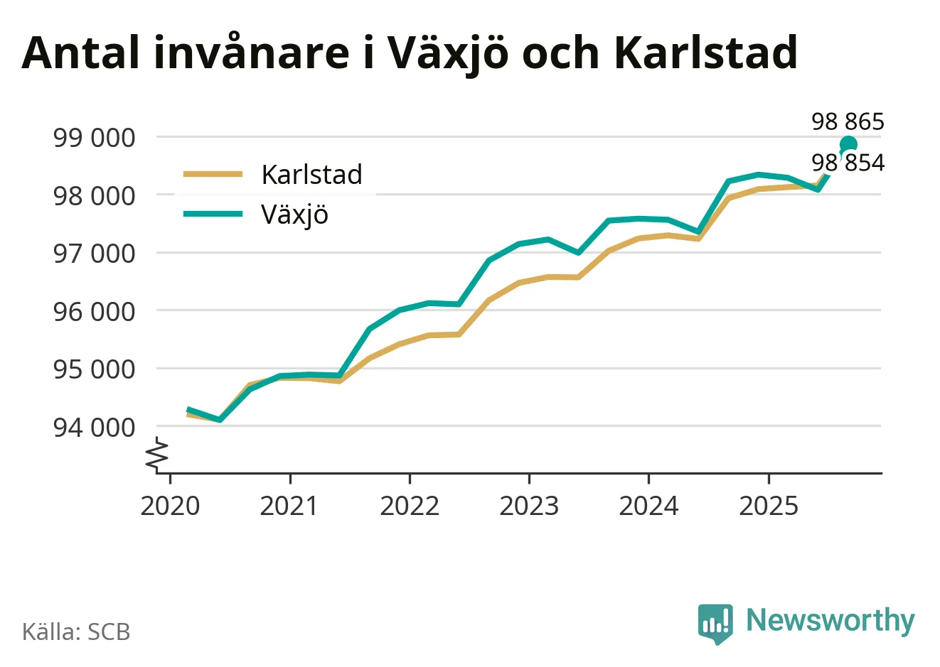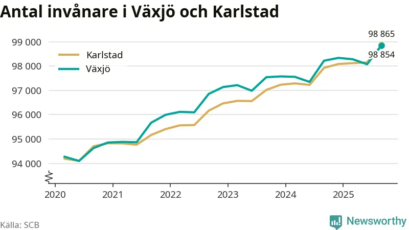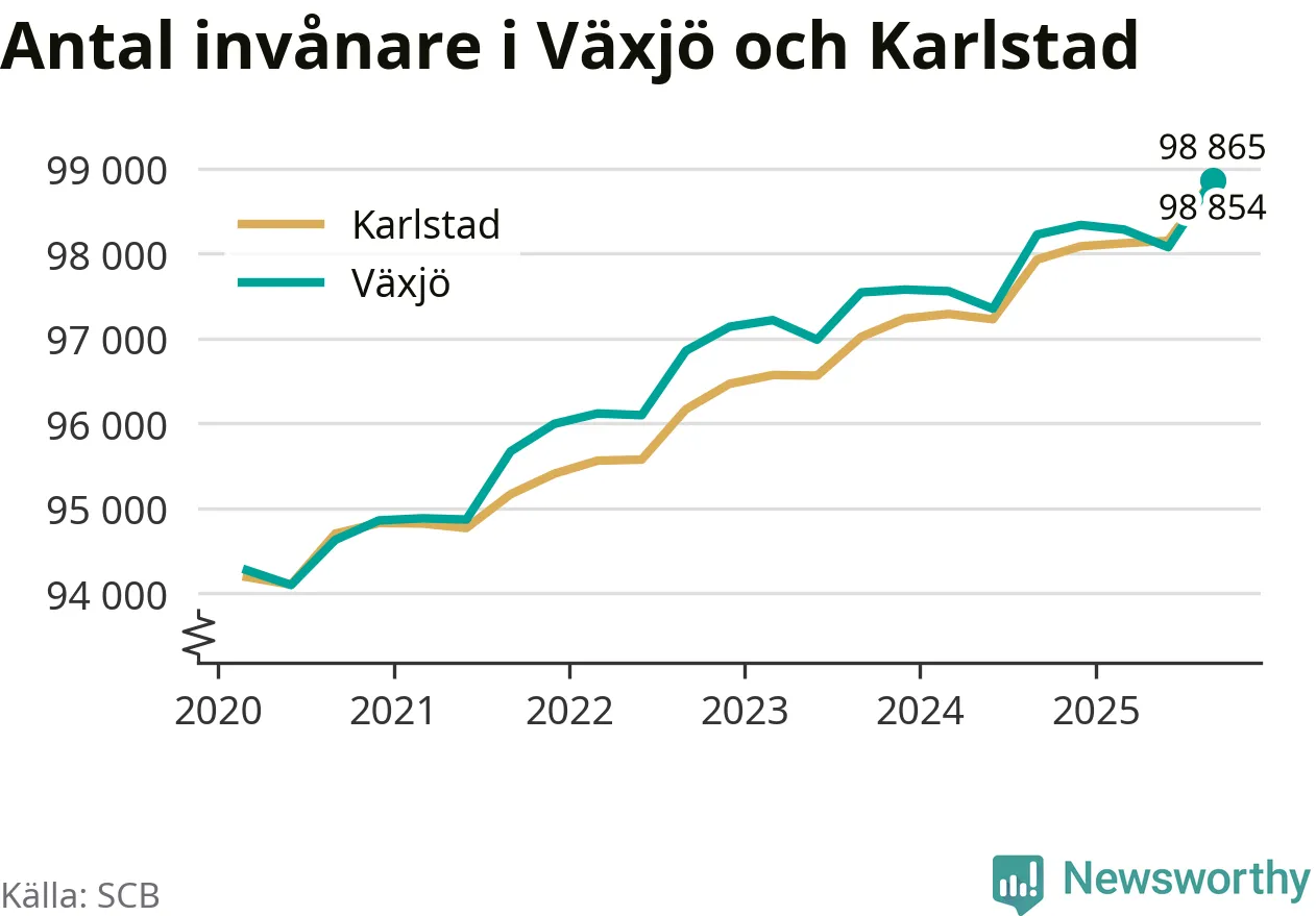 Även Karlstad, som länge legat nära Växjö befolkningsmässigt och haft ungefär samma utveckling över tid, växte under tredje kvartalet. Karlstad har varit den större kommunen av de två under de senaste två kvartalen, men avståndet krympte under det senaste kvartalet. Karlstad har nu 98 865 invånare.