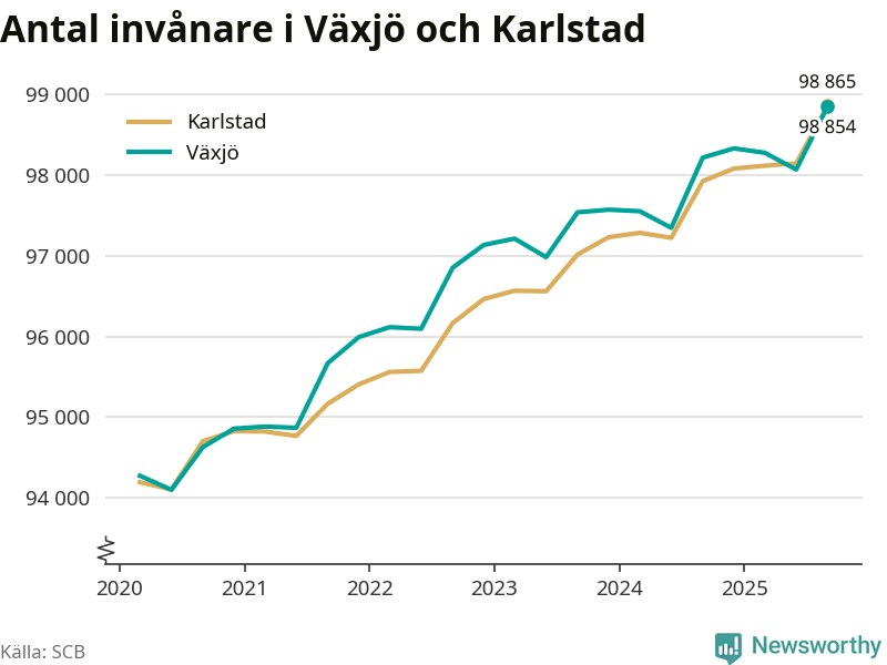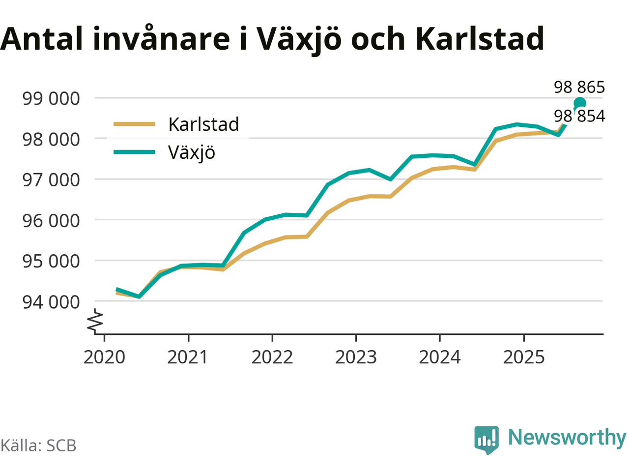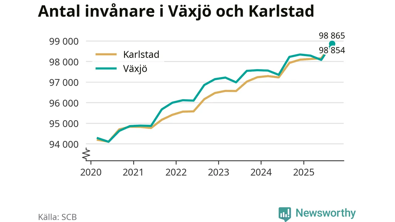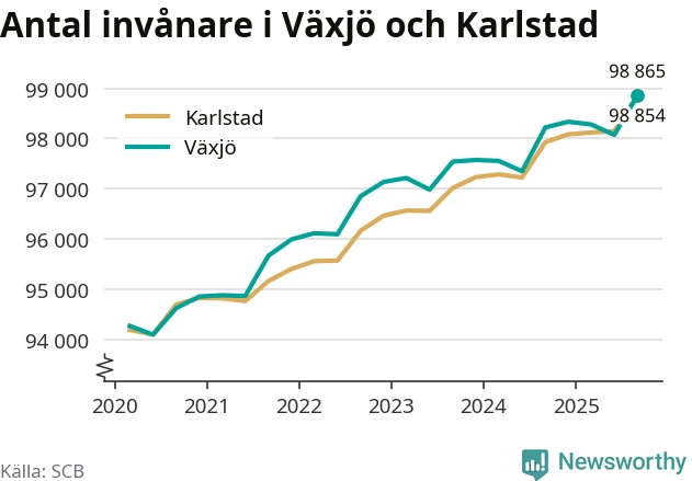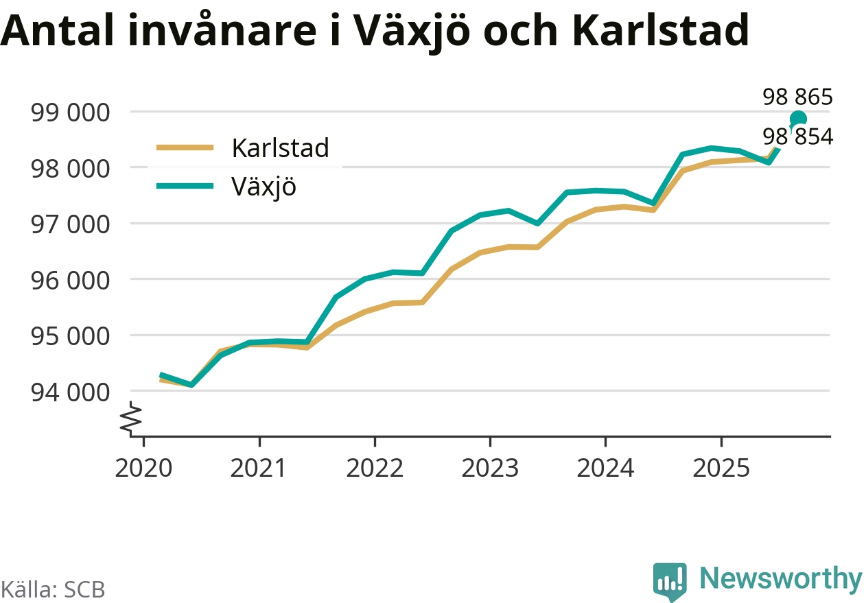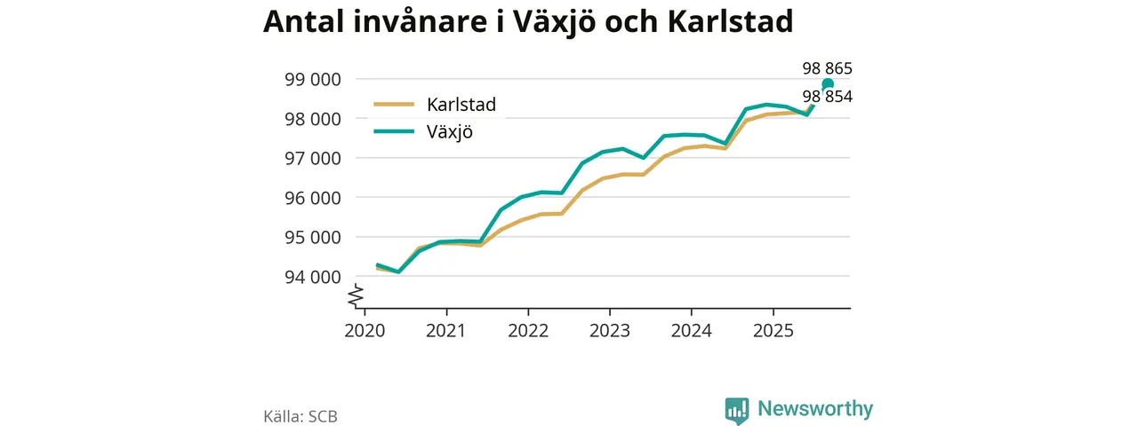 Även Karlstad, som länge legat nära Växjö befolkningsmässigt och haft ungefär samma utveckling över tid, växte under tredje kvartalet. Karlstad har varit den större kommunen av de två under de senaste två kvartalen, men avståndet krympte under det senaste kvartalet. Karlstad har nu 98 865 invånare.