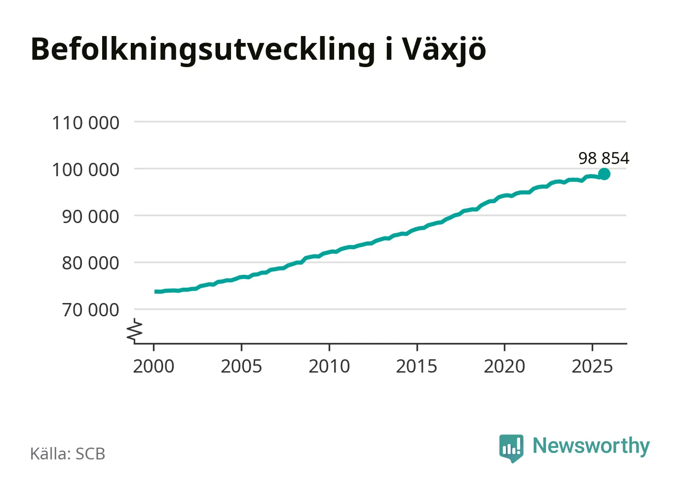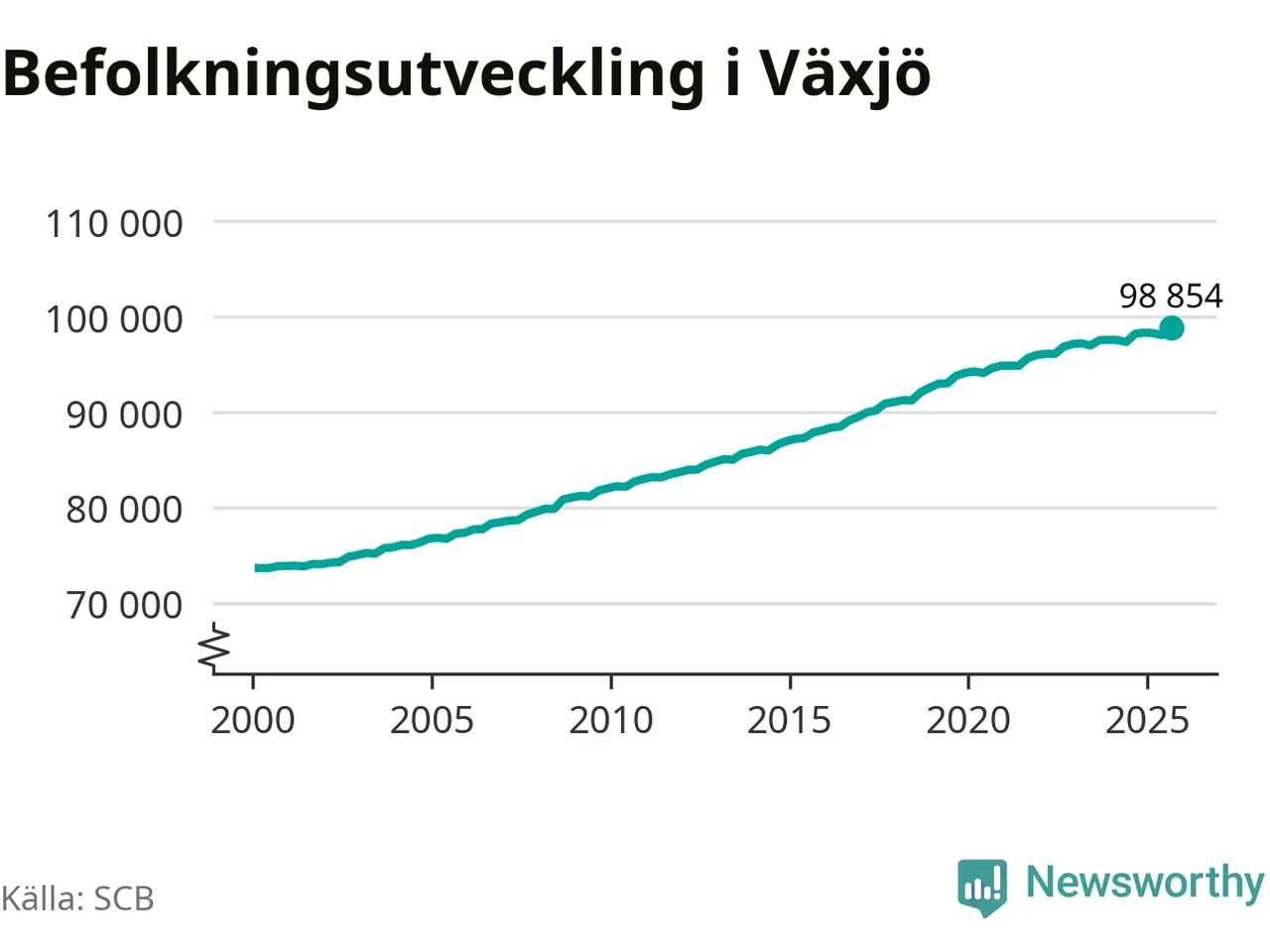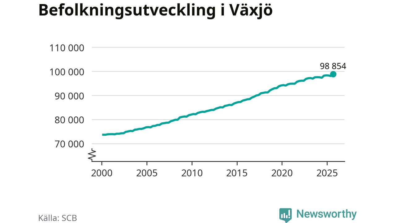 Befolkningen ökade i Växjö kommun under det tredje kvartalet 2025. Den 30 september bodde enligt SCB:s senaste siffror 98 854 personer i kommunen, vilket är 782 fler än i slutet av andra kvartalet. Växjö är den enda kommunen som ökar i Kronoberg (åtminstone den enda som ökar så mycket att det antagligen inte bara beror på den slumpmässiga justering som SCB gör av siffrorna).