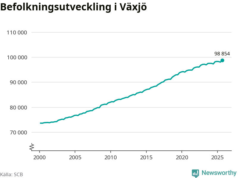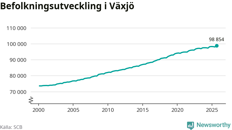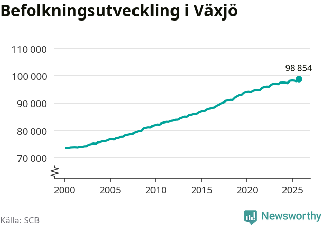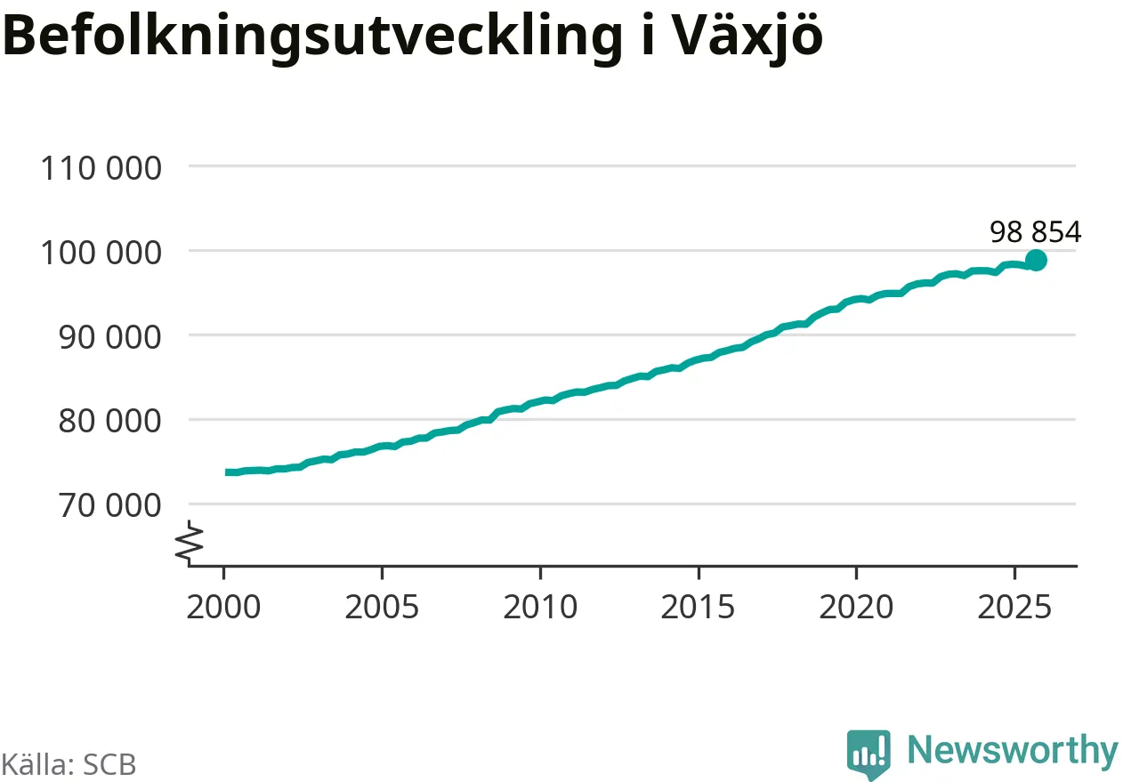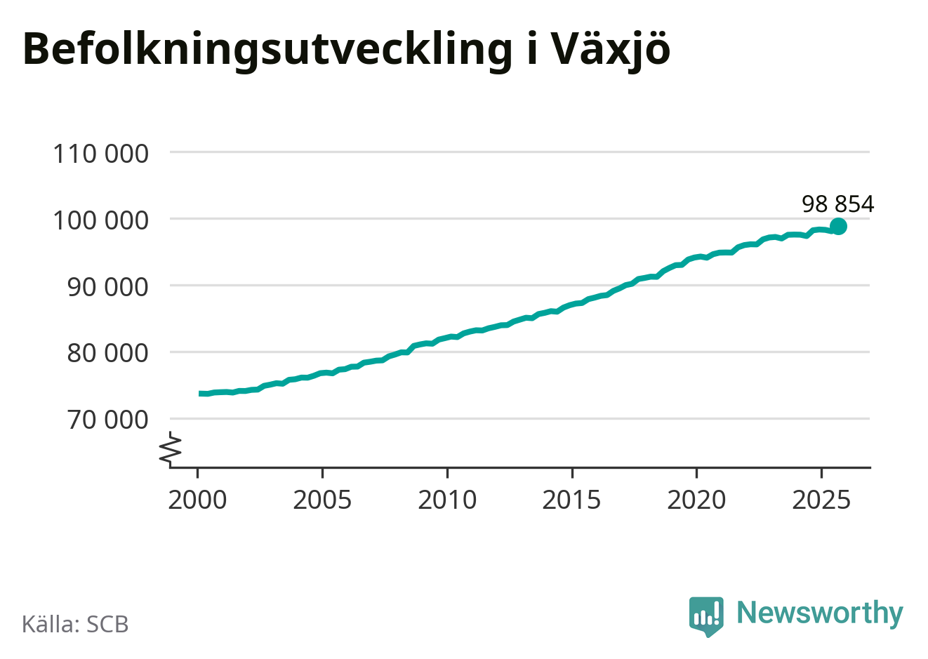 Befolkningen ökade i Växjö kommun under det tredje kvartalet 2025. Den 30 september bodde enligt SCB:s senaste siffror 98 854 personer i kommunen, vilket är 782 fler än i slutet av andra kvartalet. Växjö är den enda kommunen som ökar i Kronoberg (åtminstone den enda som ökar så mycket att det antagligen inte bara beror på den slumpmässiga justering som SCB gör av siffrorna).
