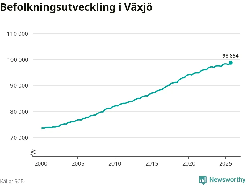 Jämfört med för ett år sedan har befolkningen i Växjö ökat med ungefär 630 personer – vilket motsvarar en ökning på 0,6 procent. Sedan millennieskiftet har folkmängden ökat med 25 170 personer, eller 34 procent. Det är den största ökningen i Kronoberg under den perioden.