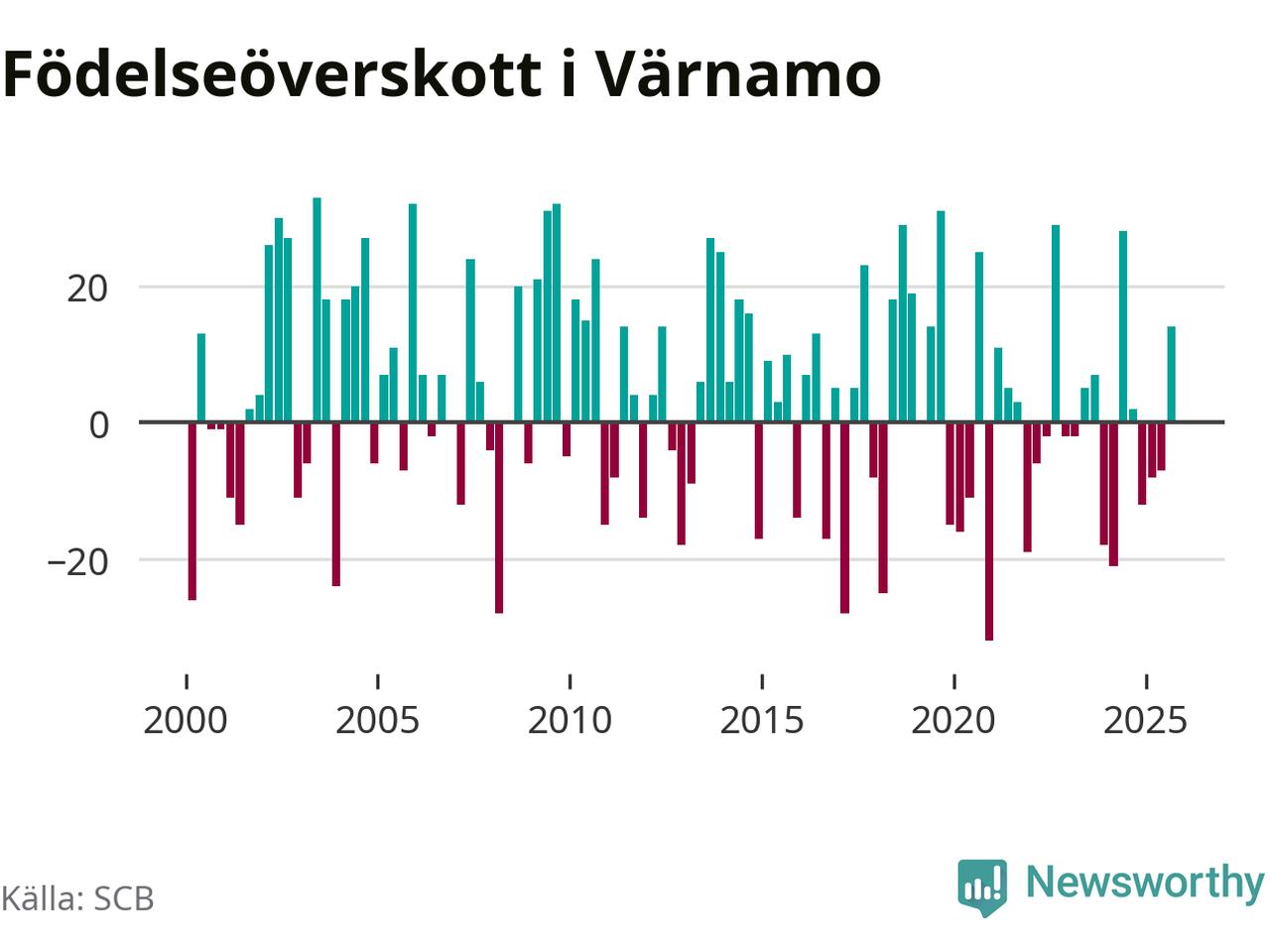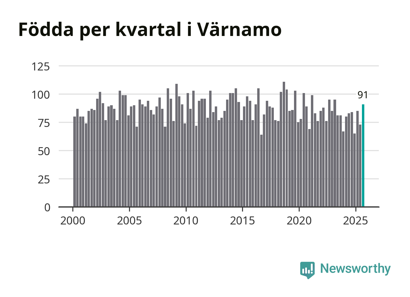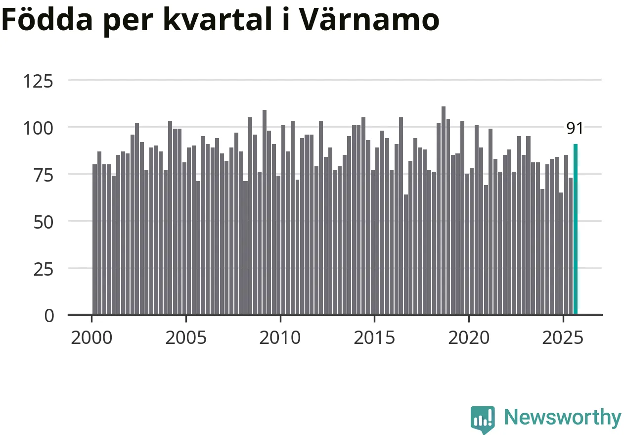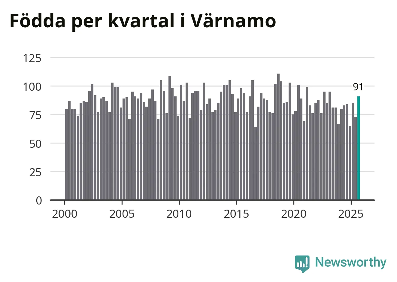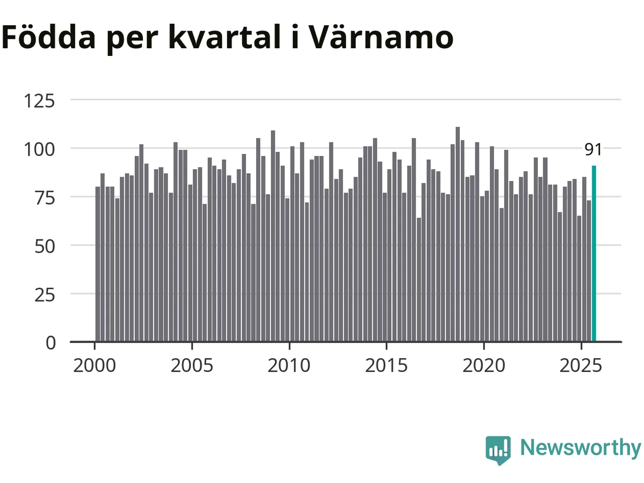 Enligt SCB:s siffror föddes 91 barn i Värnamo under det senaste kvartalet. Samtidigt avled 77 personer. Värnamo hade alltså ett positivt födelsenetto. Historiskt sett har kommunen haft ungefär lika många kvartal med positivt flyttnetto som negativt.