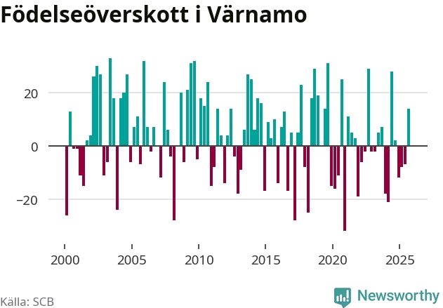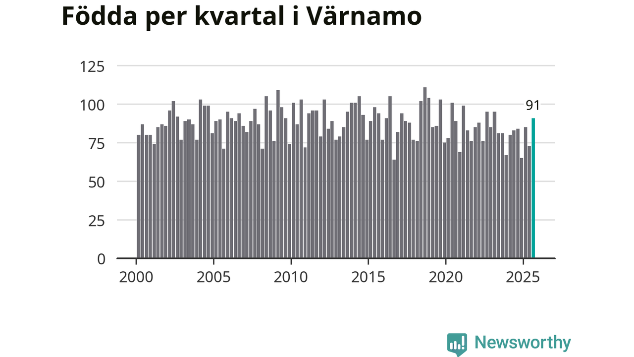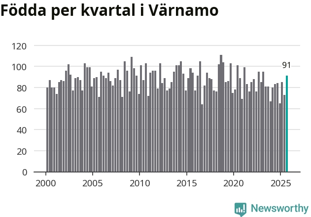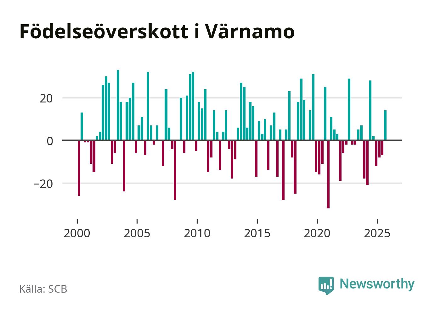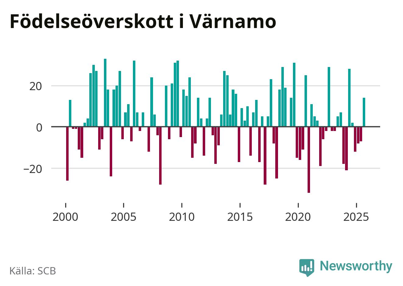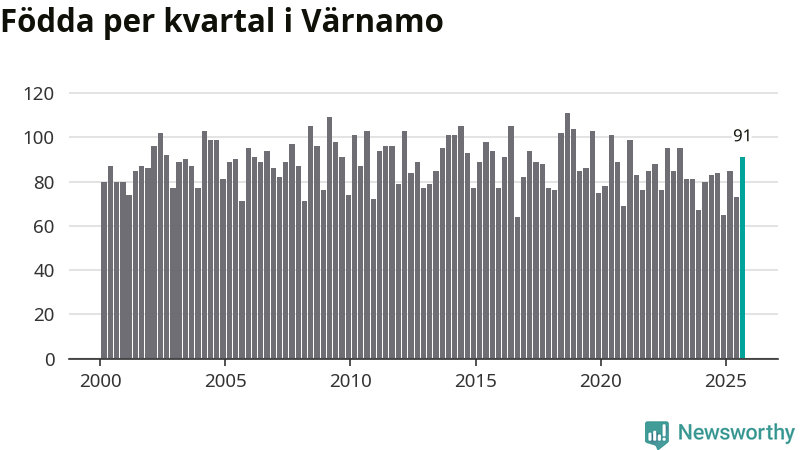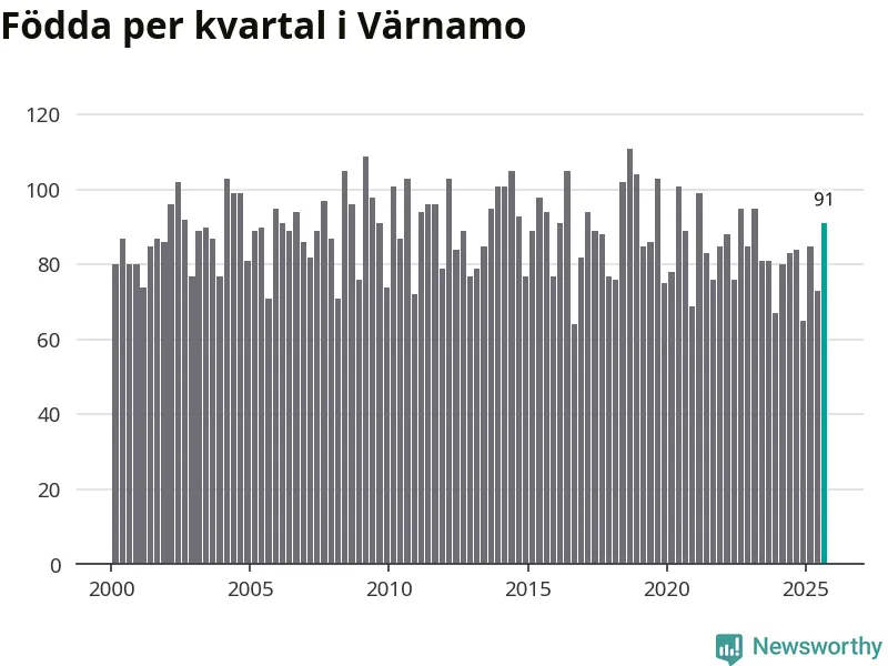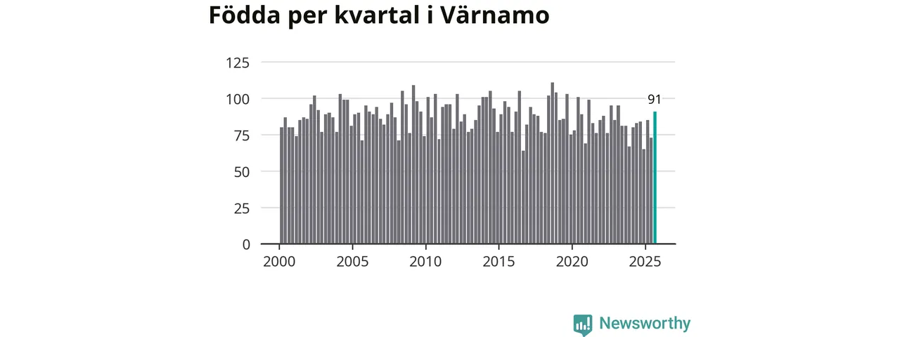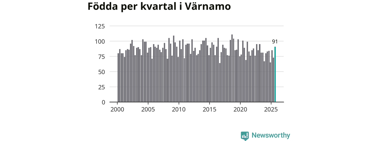 Enligt SCB:s siffror föddes 91 barn i Värnamo under det senaste kvartalet. Samtidigt avled 77 personer. Värnamo hade alltså ett positivt födelsenetto. Historiskt sett har kommunen haft ungefär lika många kvartal med positivt flyttnetto som negativt.